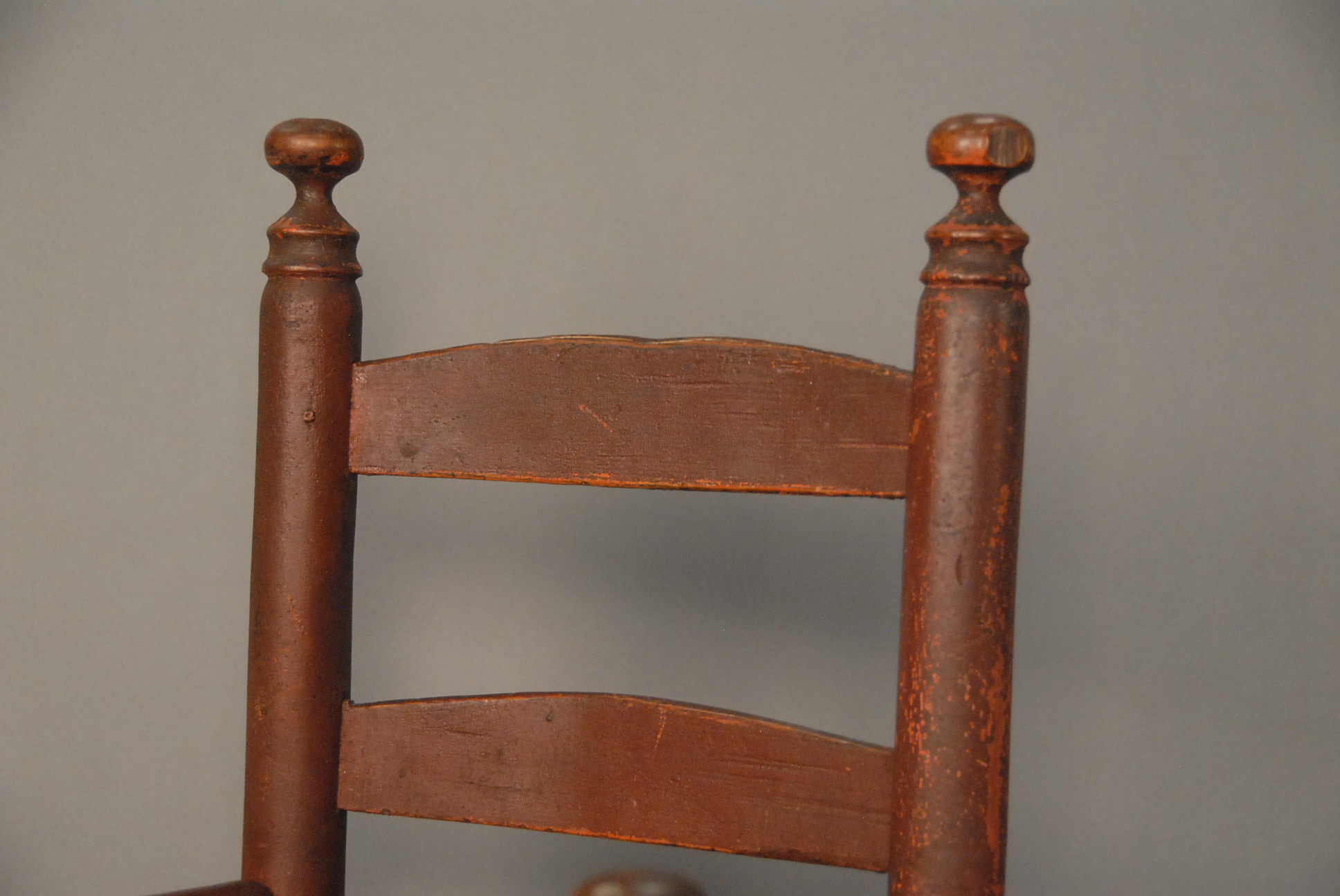 Child’s ladderback armchair, three slat with turned finials and hand rests, in old red paint. seat ht. 7 1/2 in. Provenance: Property from the Estate of Elizabeth and Edward Wallace of The Tracy House in Meriden, Connecticut.