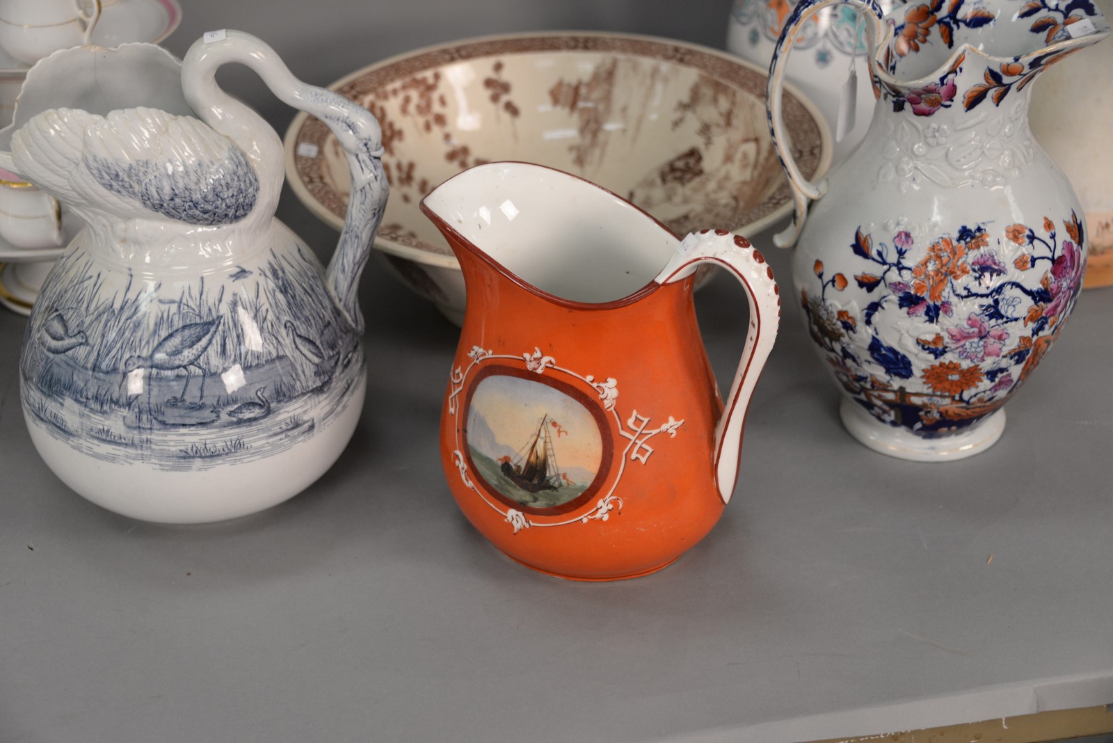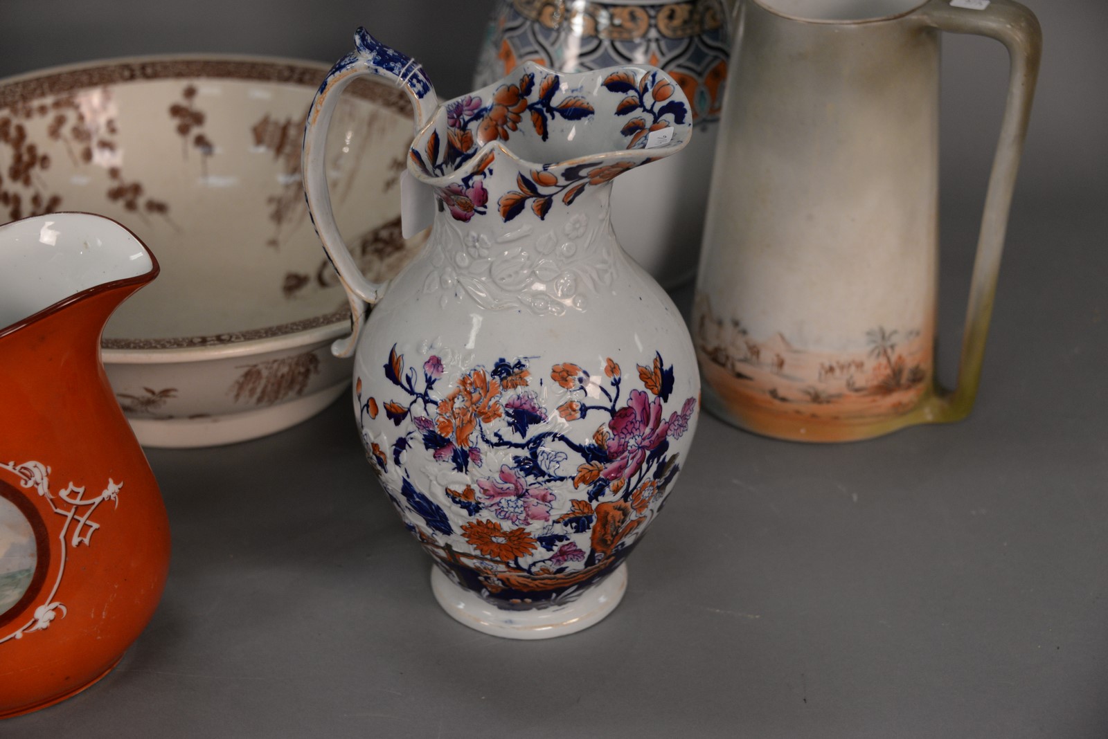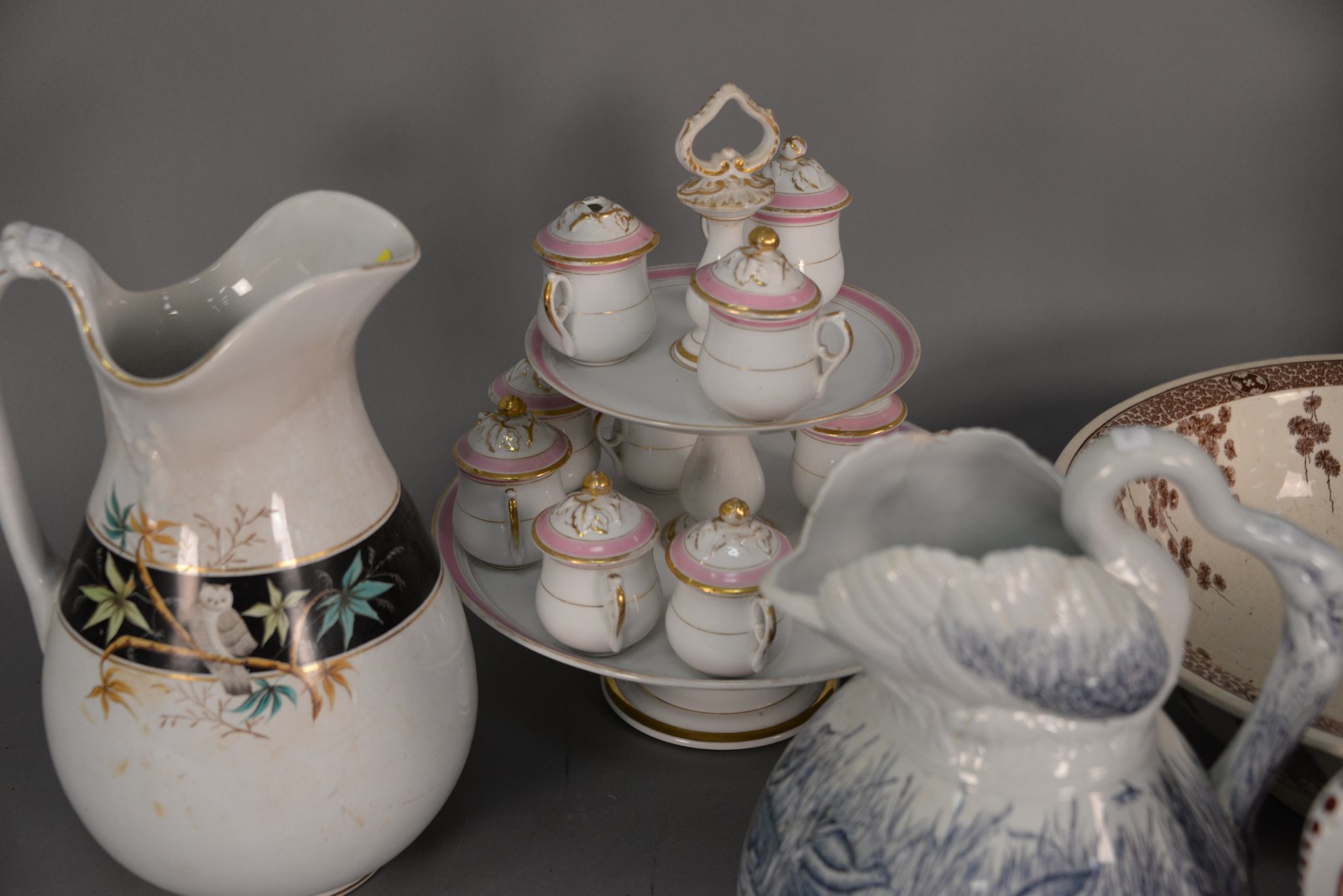 Eight piece lot to include a group of six large water pitchers, a two tier revolving chocolate server, and large brown and white bowl. ht. 8 1/2 in. to ht. 13 1/2 in.
