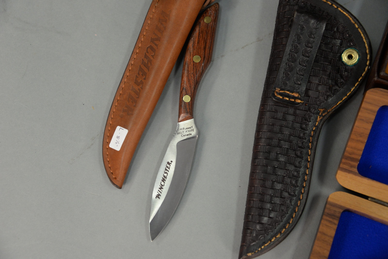 Lot 416: Five buck knives including Winchester DH Russell belt knife with leather sheath and original box, Estes Park Colorado Dill buck knif…