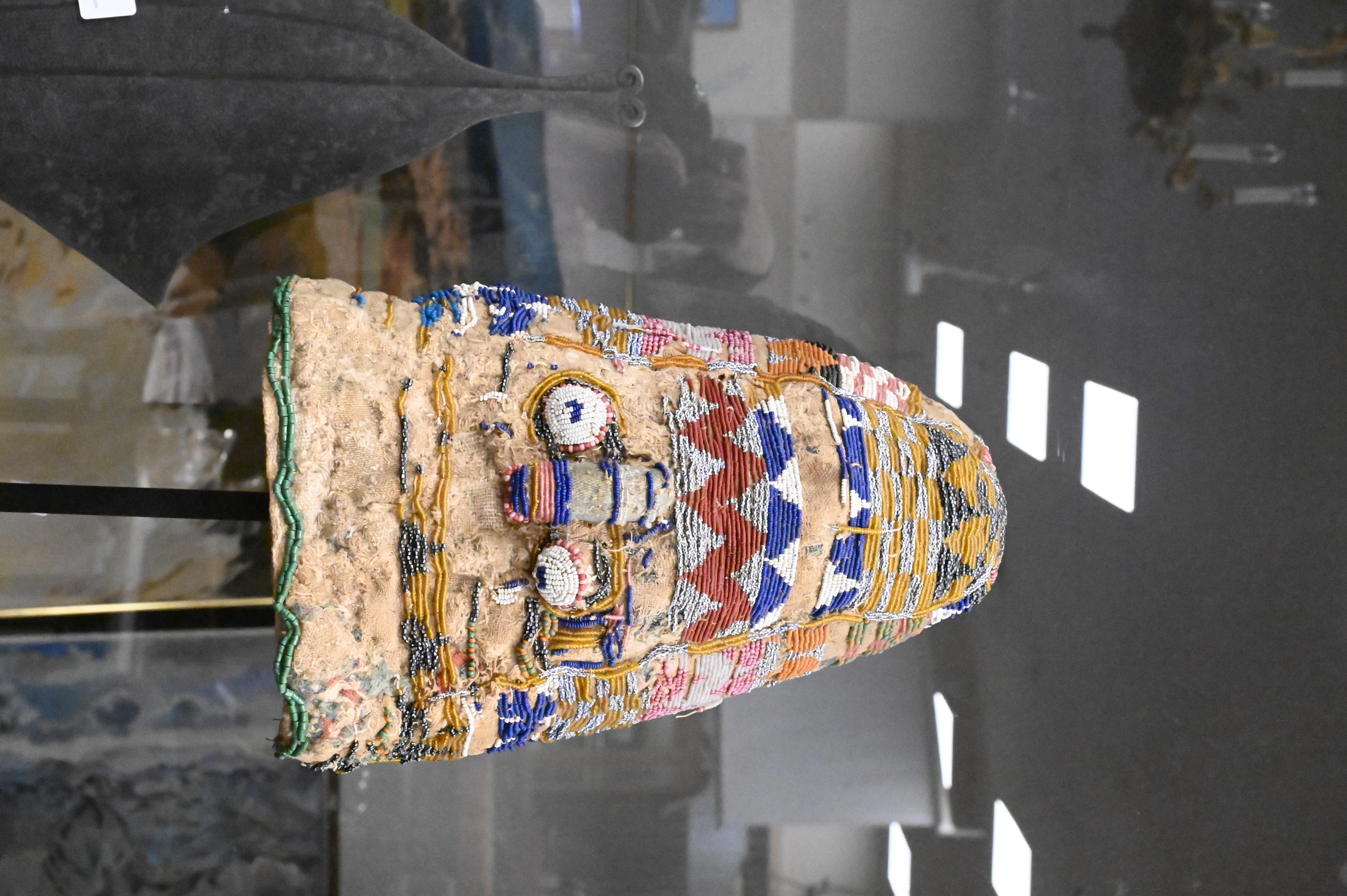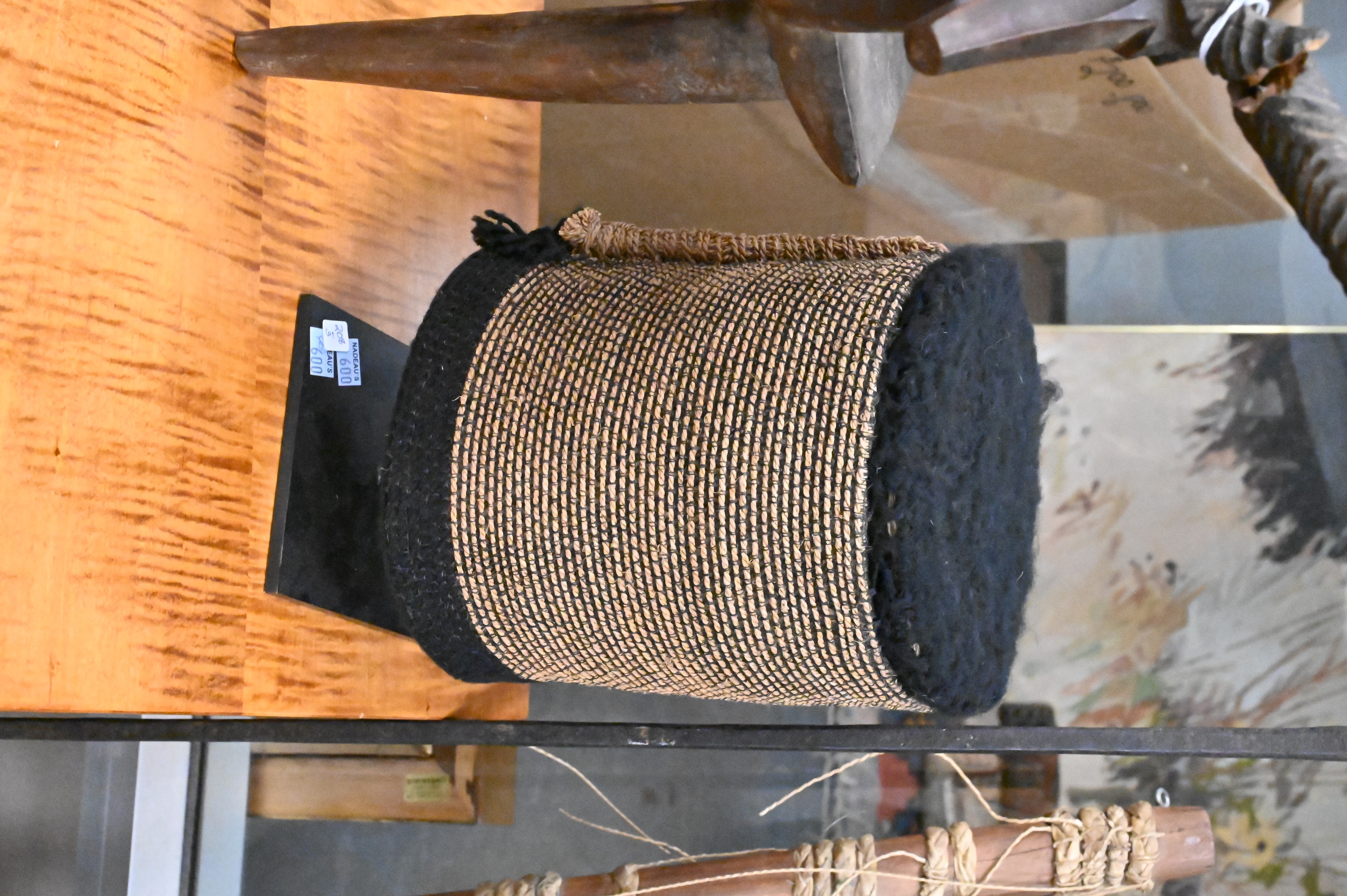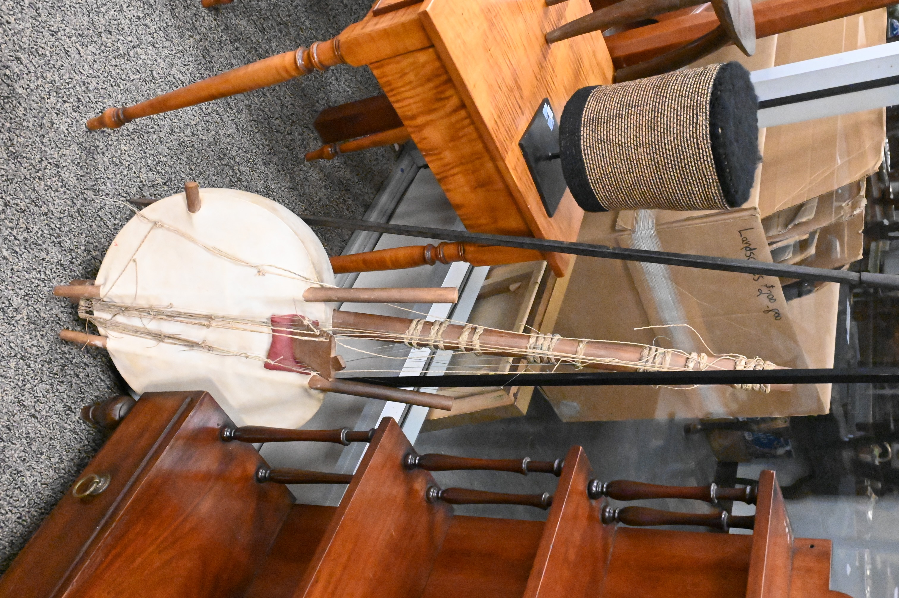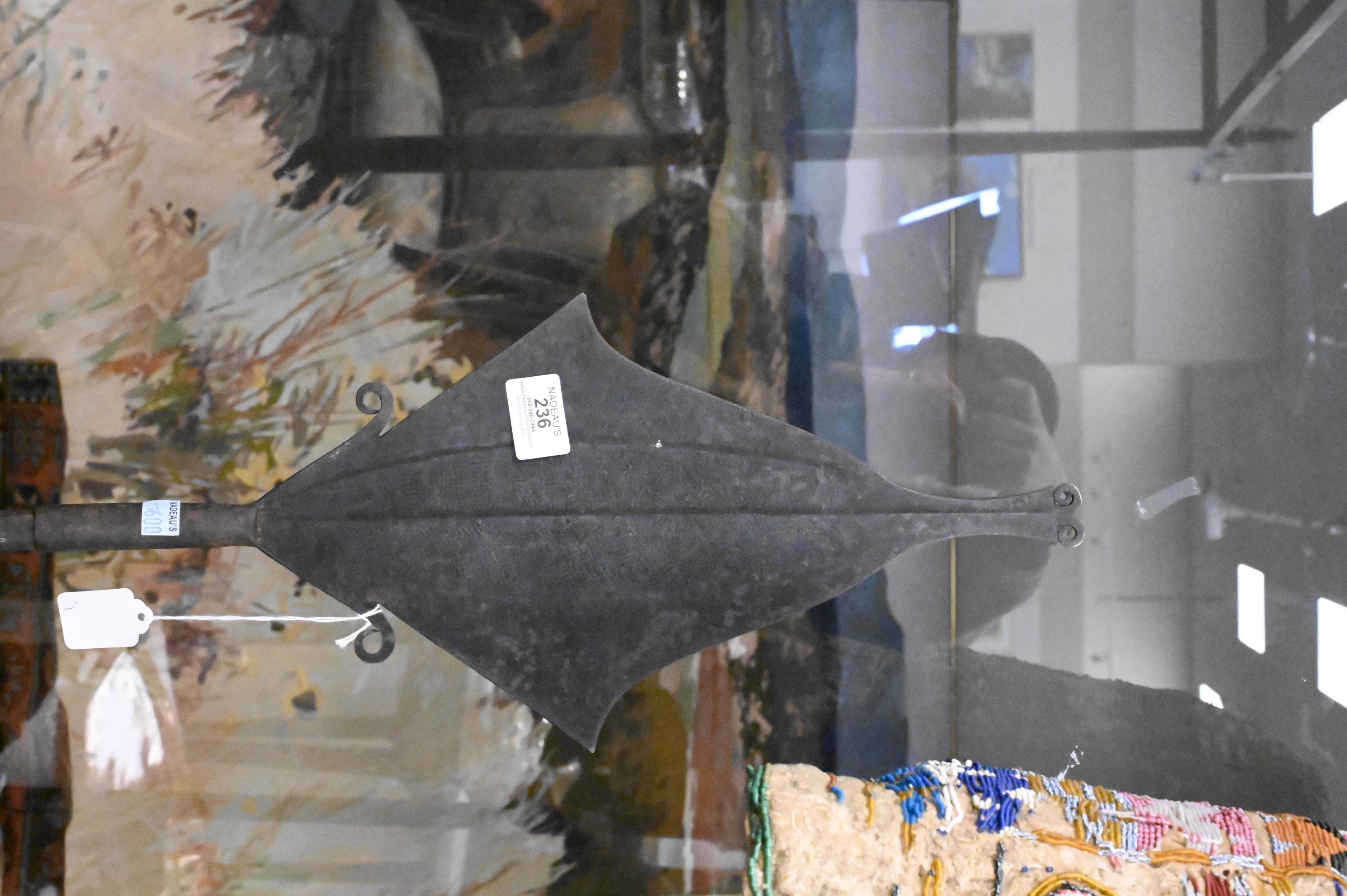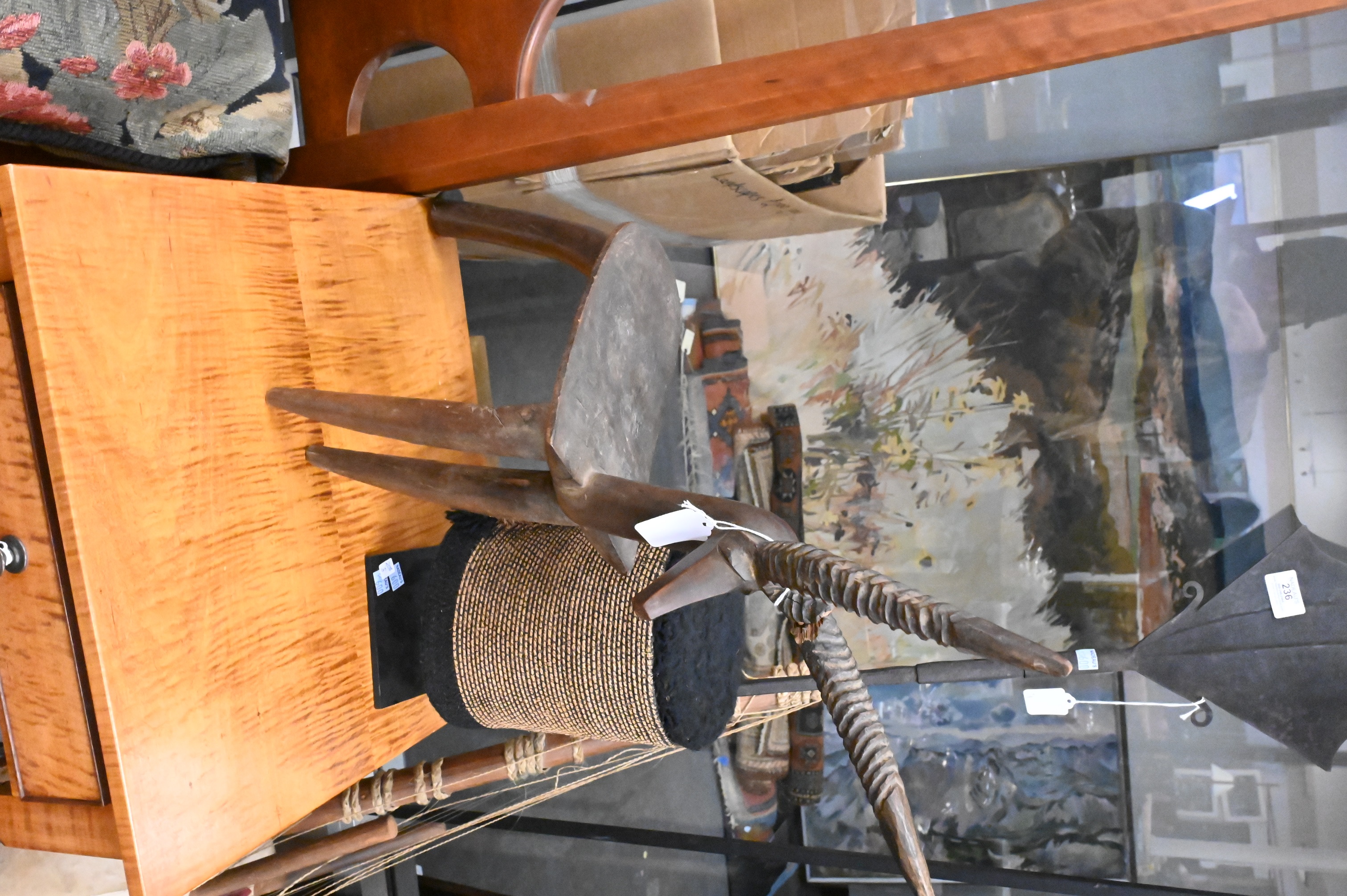 to include metal longspear having detailed finial circa 1890, Senufo string instrument made of wood, hide, and string