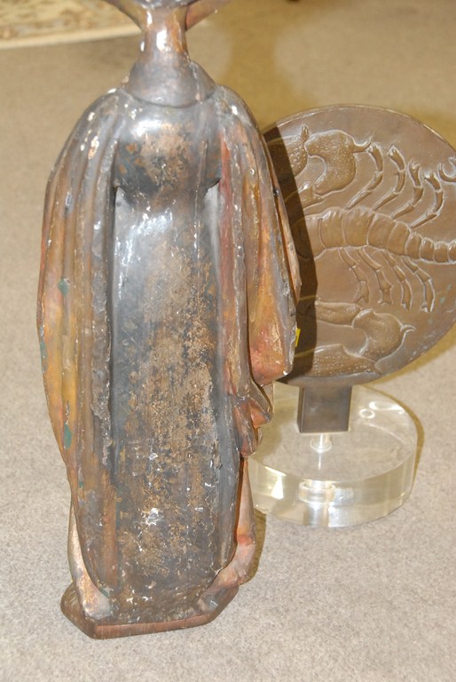 Group of three items bronze plaque, carved religious figure, and candle stick.