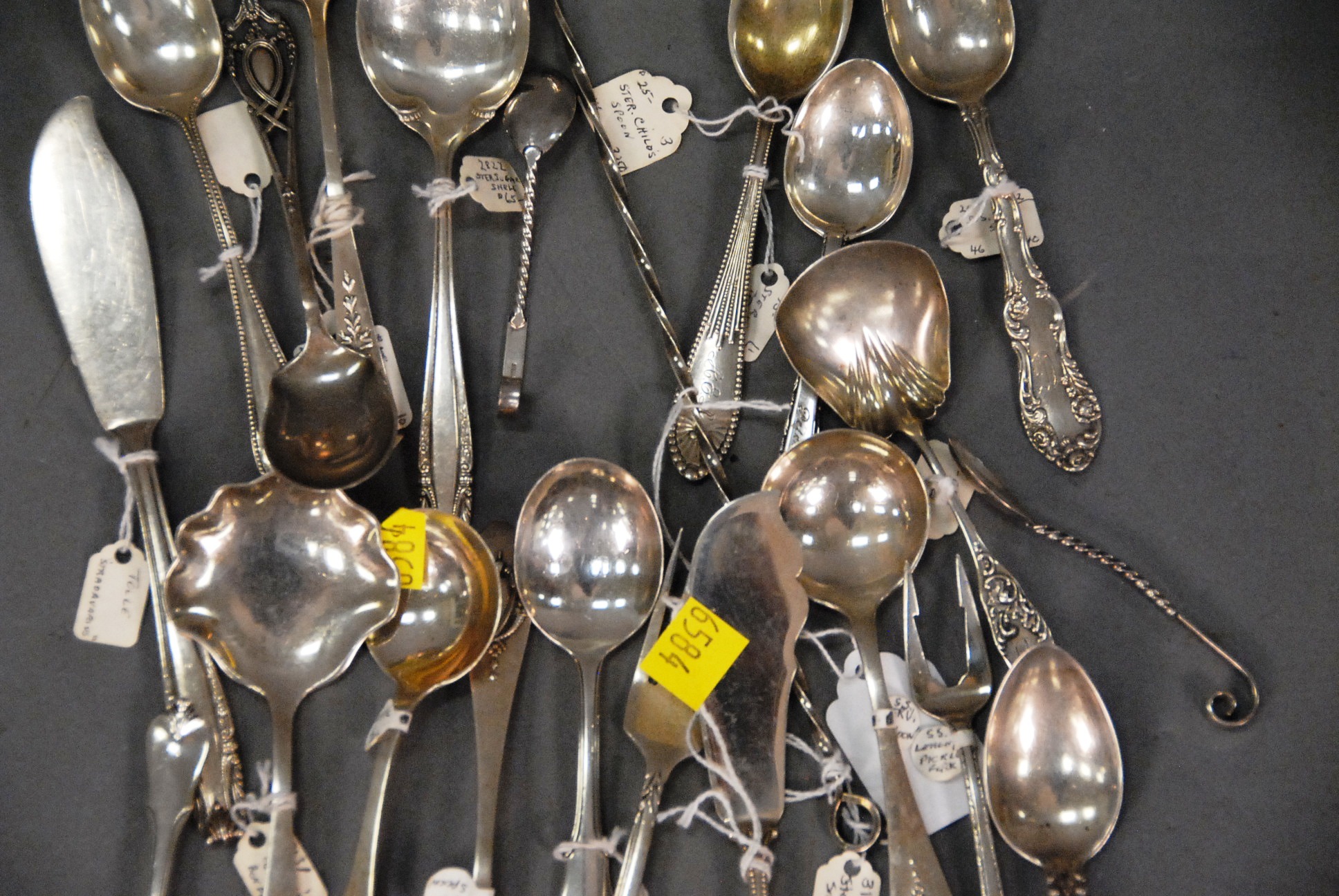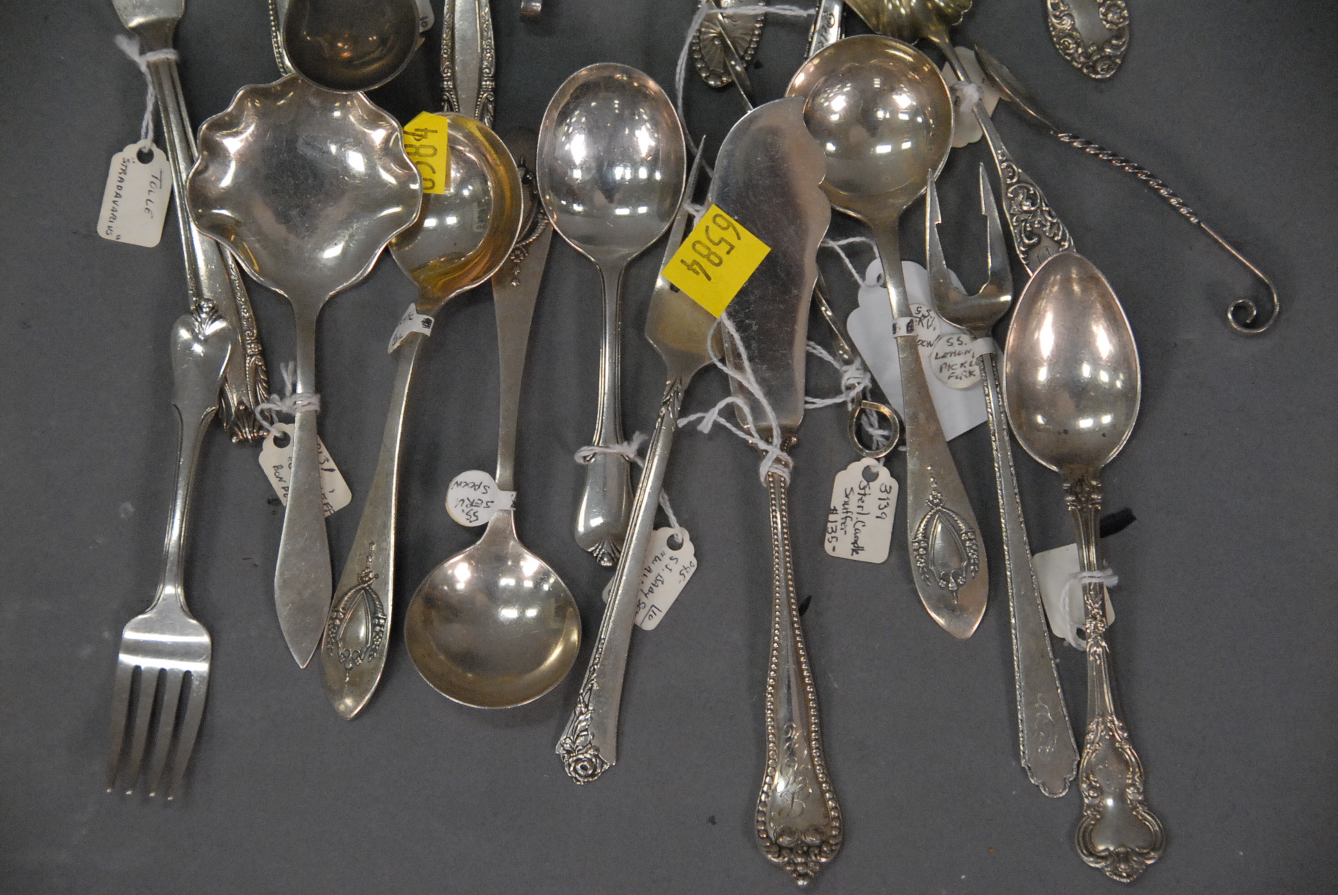 Large group of sterling flatware butter knives, spoons, forks, candle snuff, etc., 16.2 t oz.