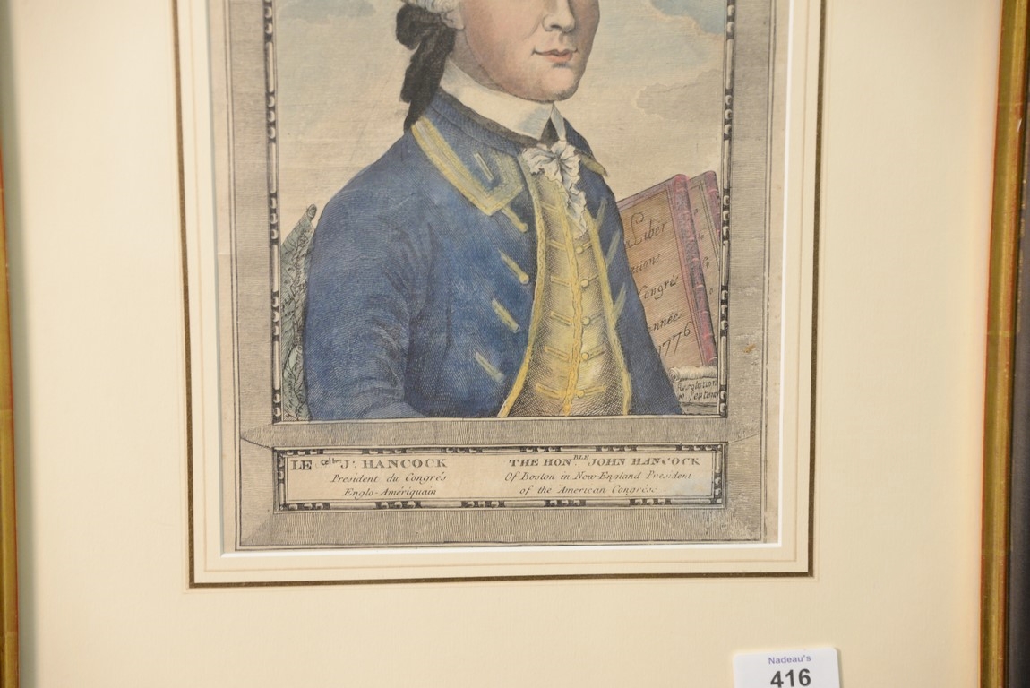 Pair of hand colored copper engravings Israel Putnam Major General of the Connecticut Forces and Chief at the Engagement of Bunc-Kershill near Boston 17 June 1775 and The Honble. John Hancock of Boston in New England. President of the American Congress sight size: 12 x 8 Provenance: Property from Credit Suisse’s Americana Collection