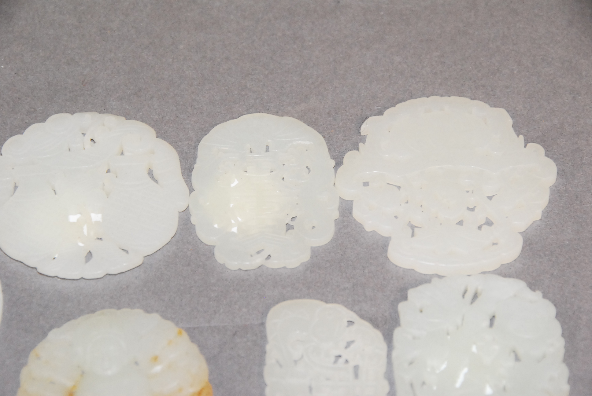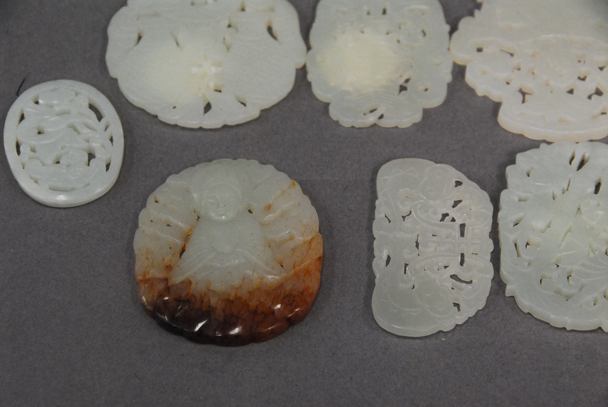 Seven celadon jade pieces all about 1 1/2.