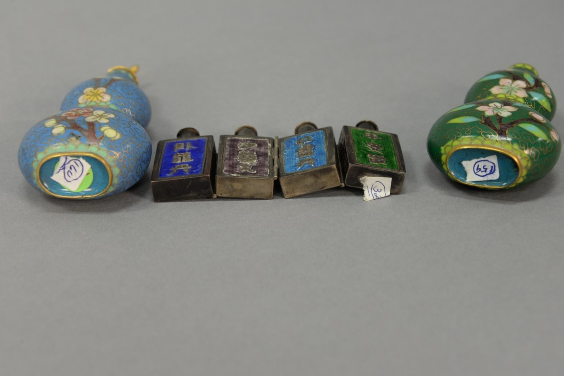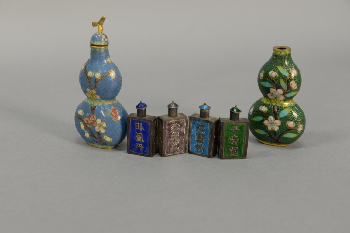 Three snuff bottles to include a pair of cloisonne double gourd and a hinged metal enameled four part snuff bottle. ht. 1 1/2in. to 3 3/4in.