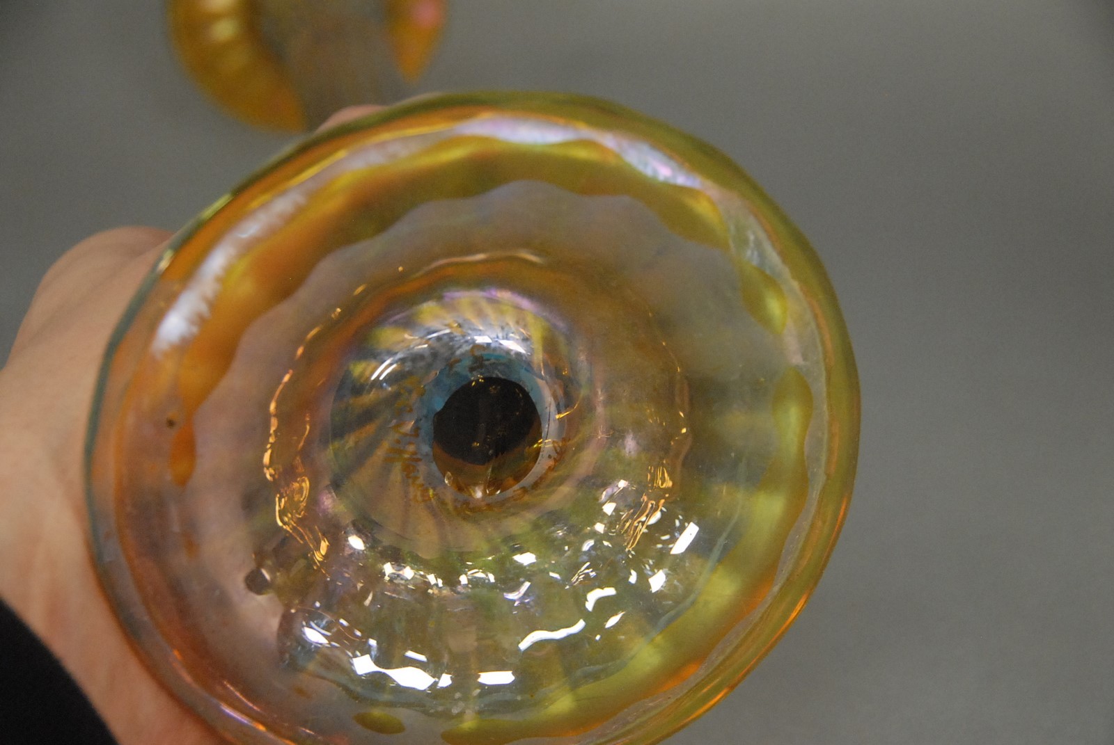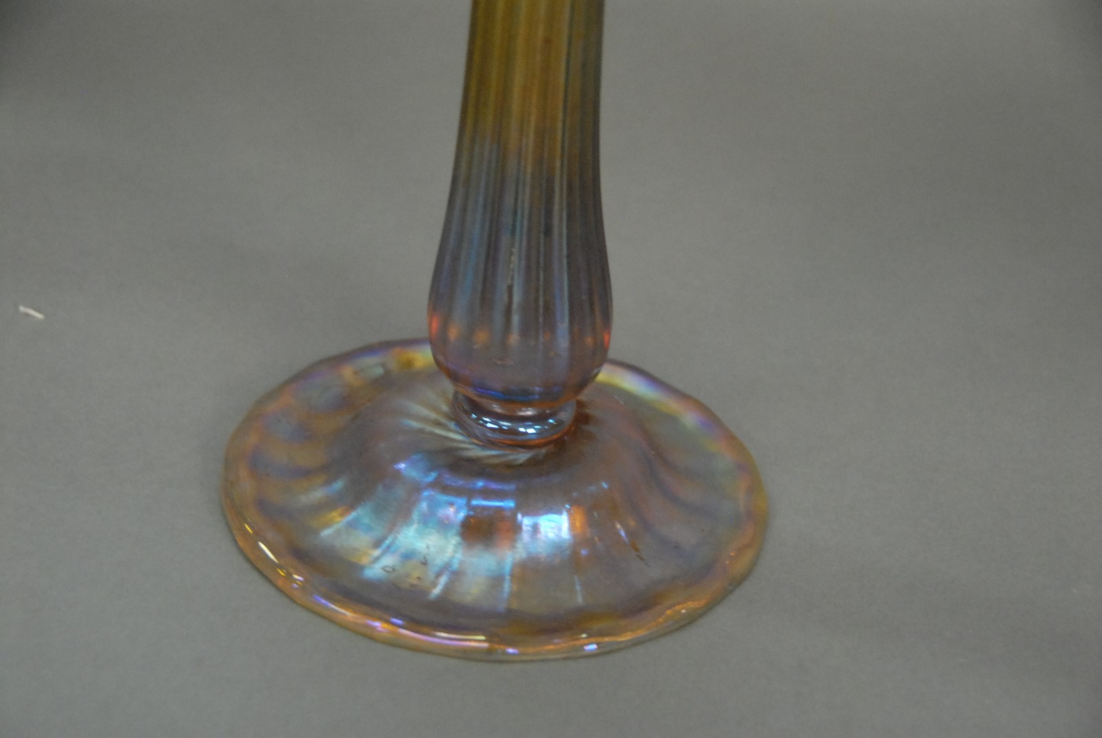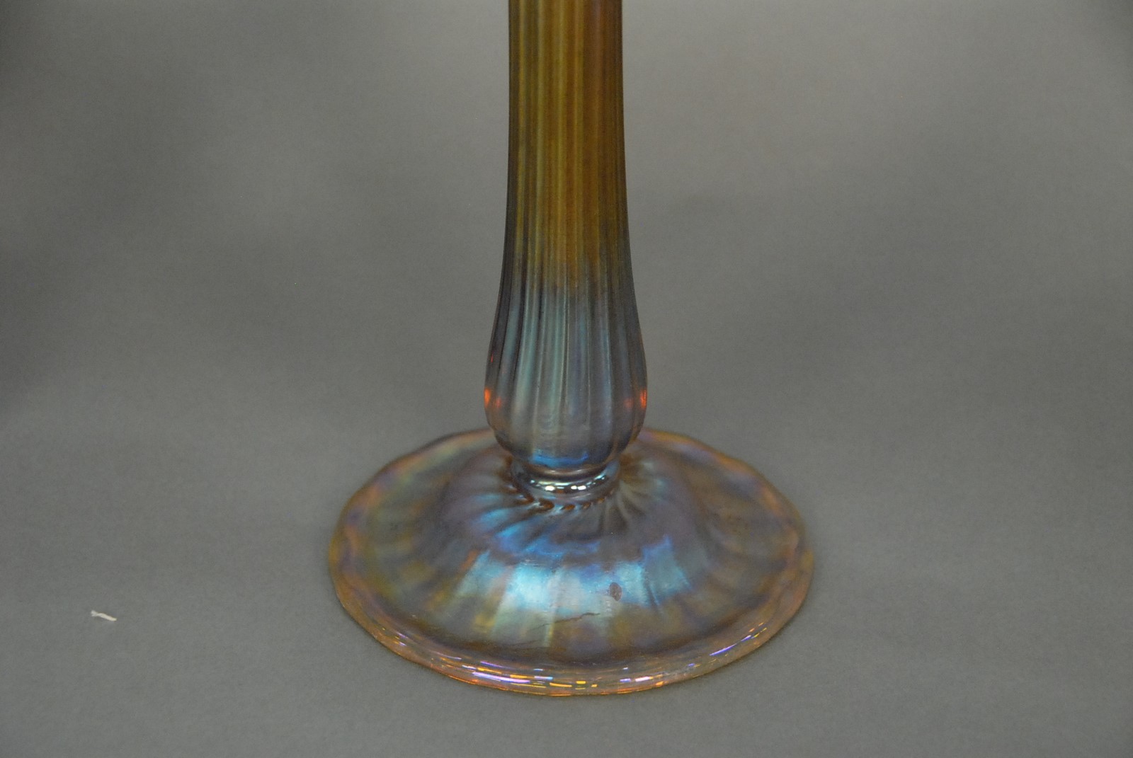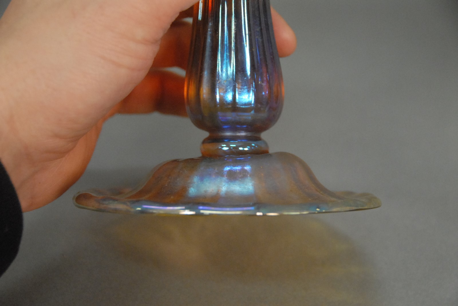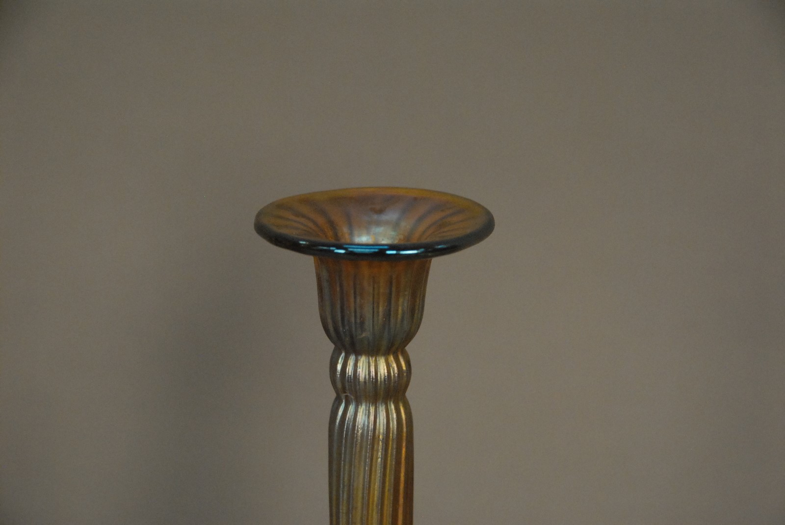 Lot 416: Tiffany gold iridescent Favrile glass candlestick with flared top and ribbed stem set on round ribbed base, inscribed on bottom L.C. Tiffany Favrile 5. ht. 12 in.