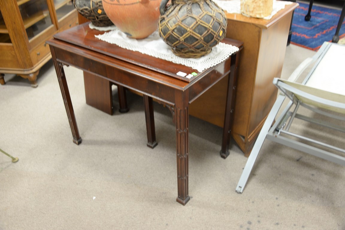 Chinese Chippendale style mahogany extending table with three leaves. ht. 31 in. wd. 39 in. dp. 20 in. with three 12 leaves, opens to 76 in.