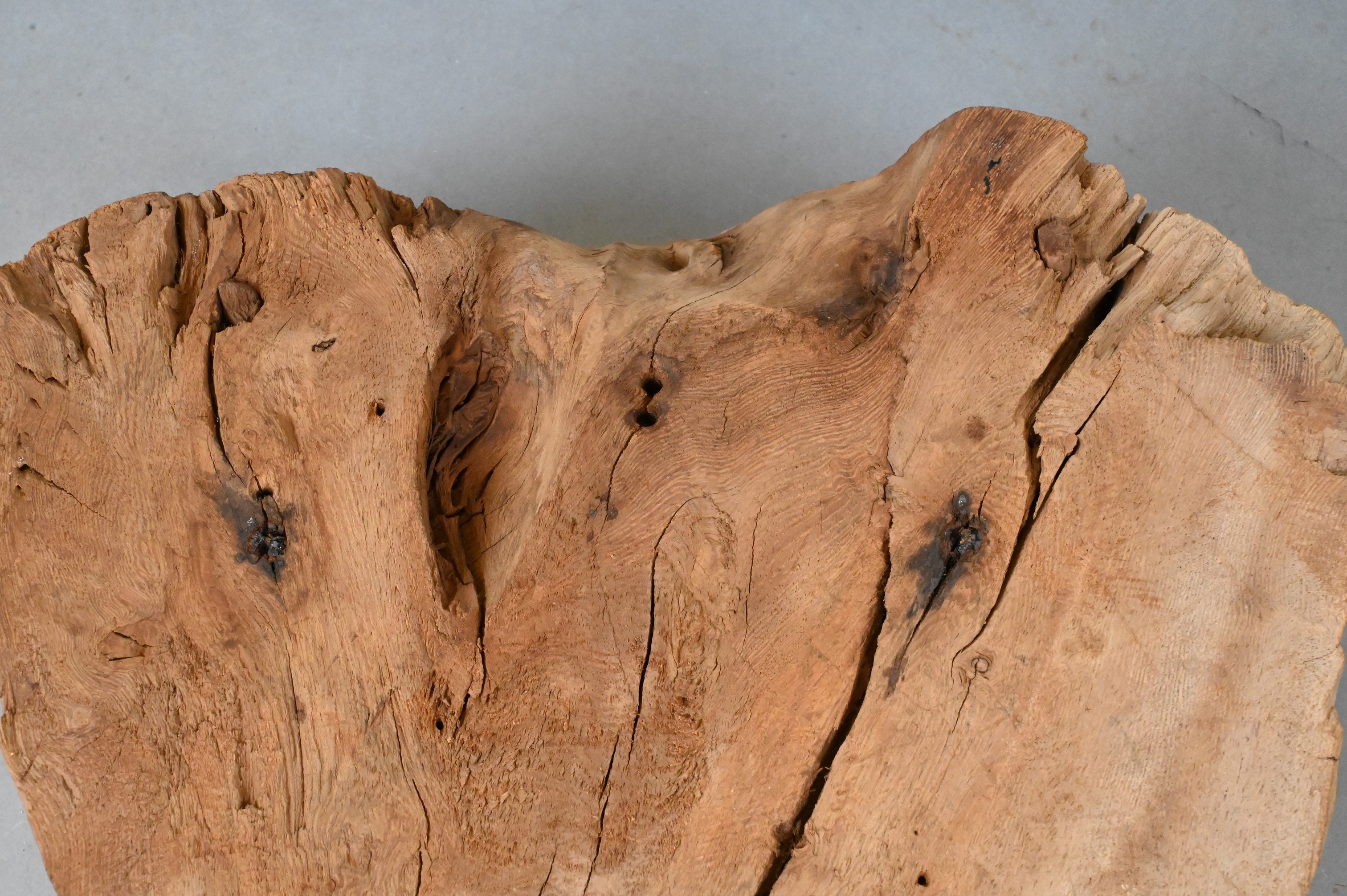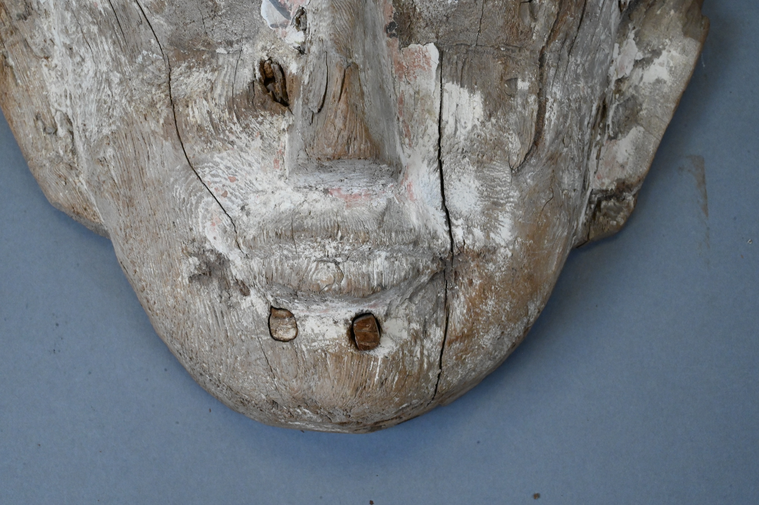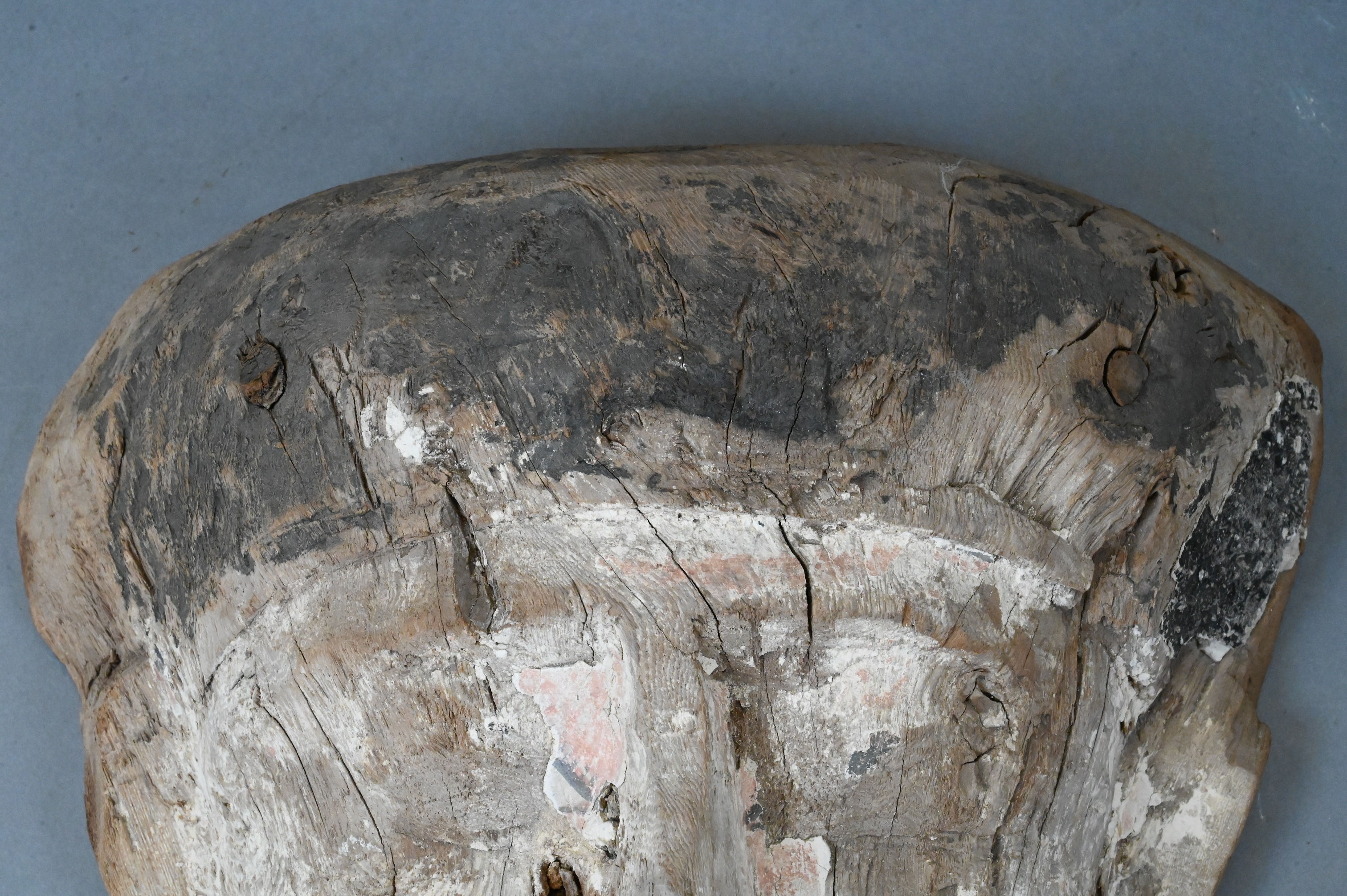 carved wooden funerary mask with broad brow, long wedge-shaped nose, and gently modeled features, retaining traces of original pigment including black detailing on a pink ground around the eyes, weathered surface with encrustations and age-related losses appropriate to burial conditions, carved wood with pigment traces, unmarked, late period circa 712-30 B.C.