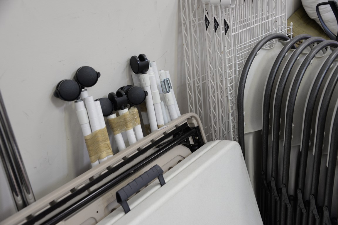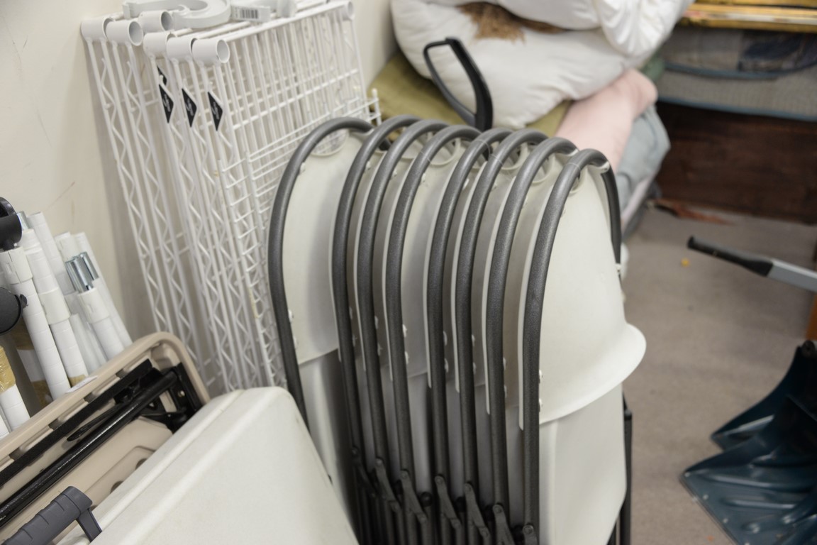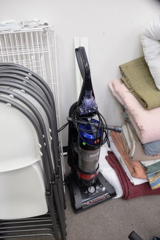 Eleven piece lot to include two tables, eight chairs, and a Hoover Wind Tunnel vacuum.
