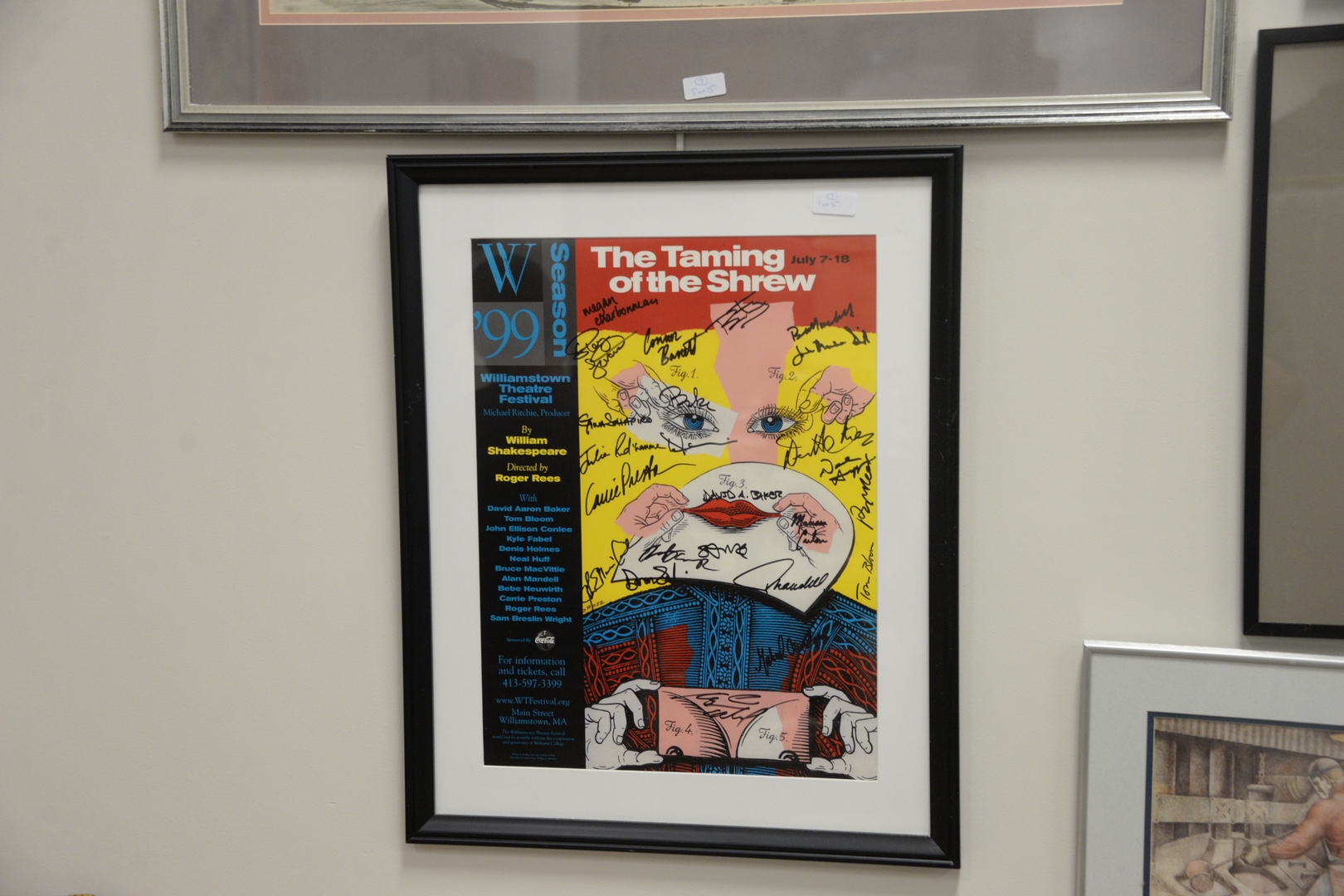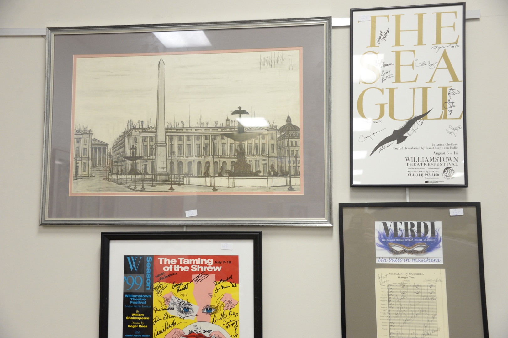 Lot 417: Five Piece Framed Group, to include two autographed posters from the WIlliamstown Theater Company; a Robert Bass autographed page from the Opera Verdi; a Bernard Buffet reproduction print; along with a Henry Bernstein mural reproduction, largest sight size 18″ x 39″.