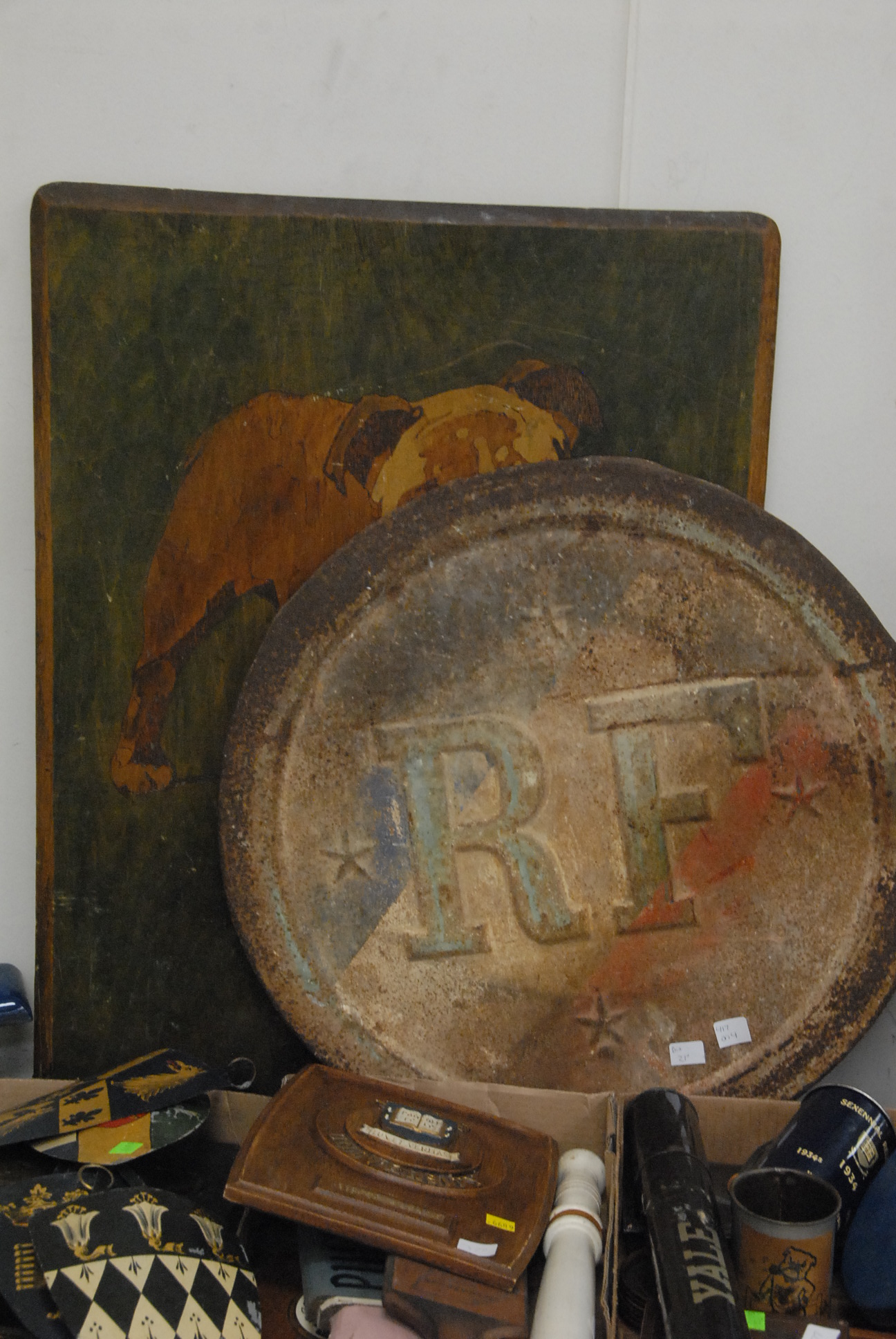 Lot 417: Group lot to include four pieces two flower prints by Harris, bulldog, and old metal sign marked RF.