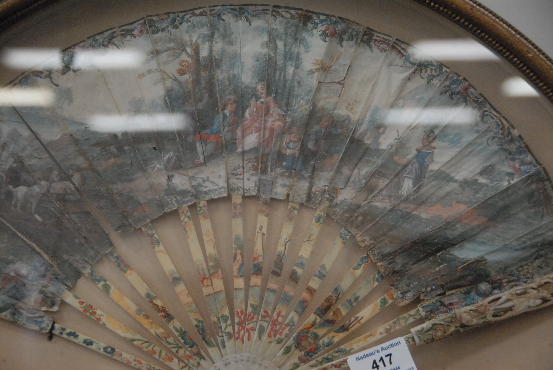 Lot 417: Group of five pieces to include framed painted fan, two watercolors, framed bust, and oil painting of two storks.