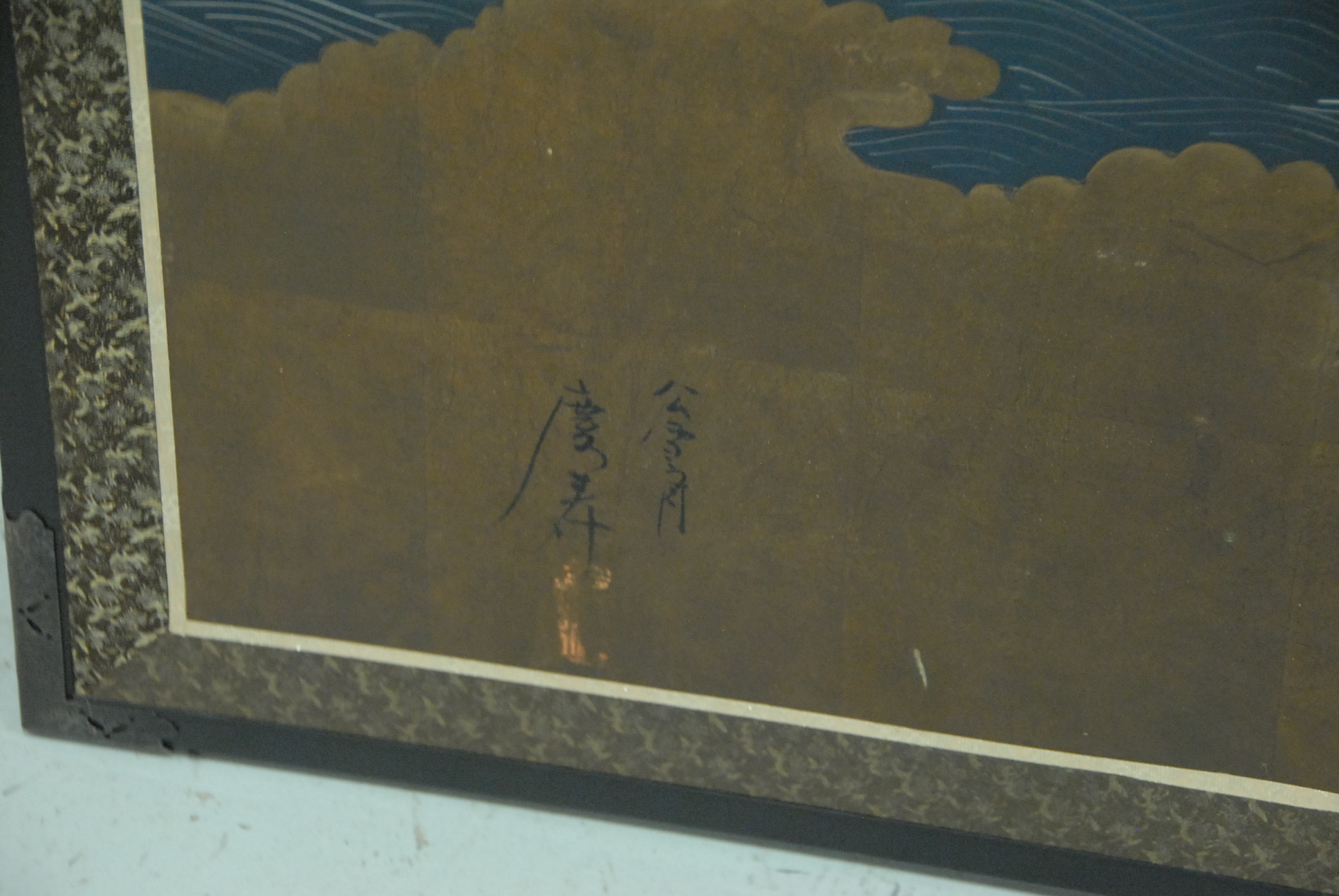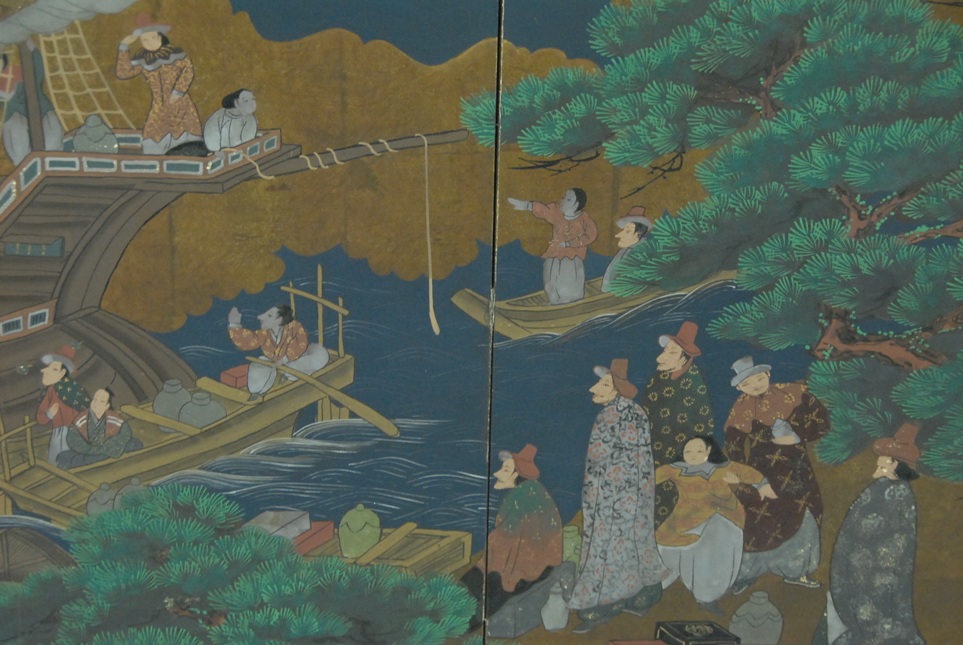 Japanese four fold screen of large boat setting sail. 36 x 71