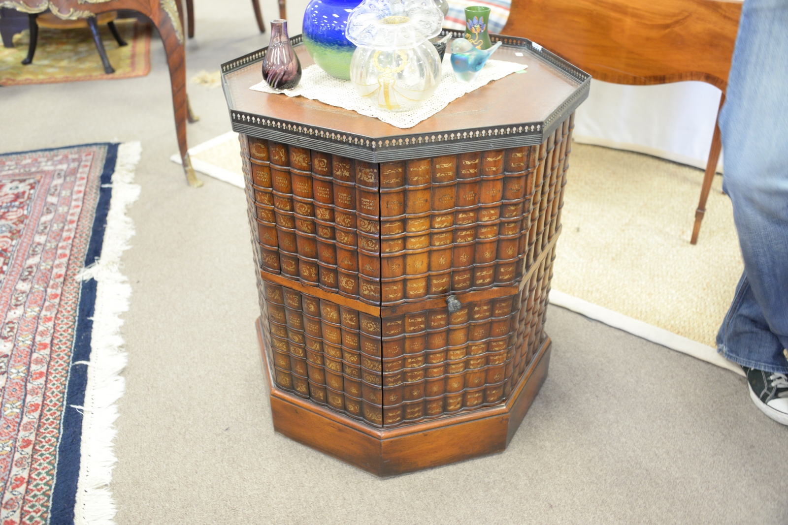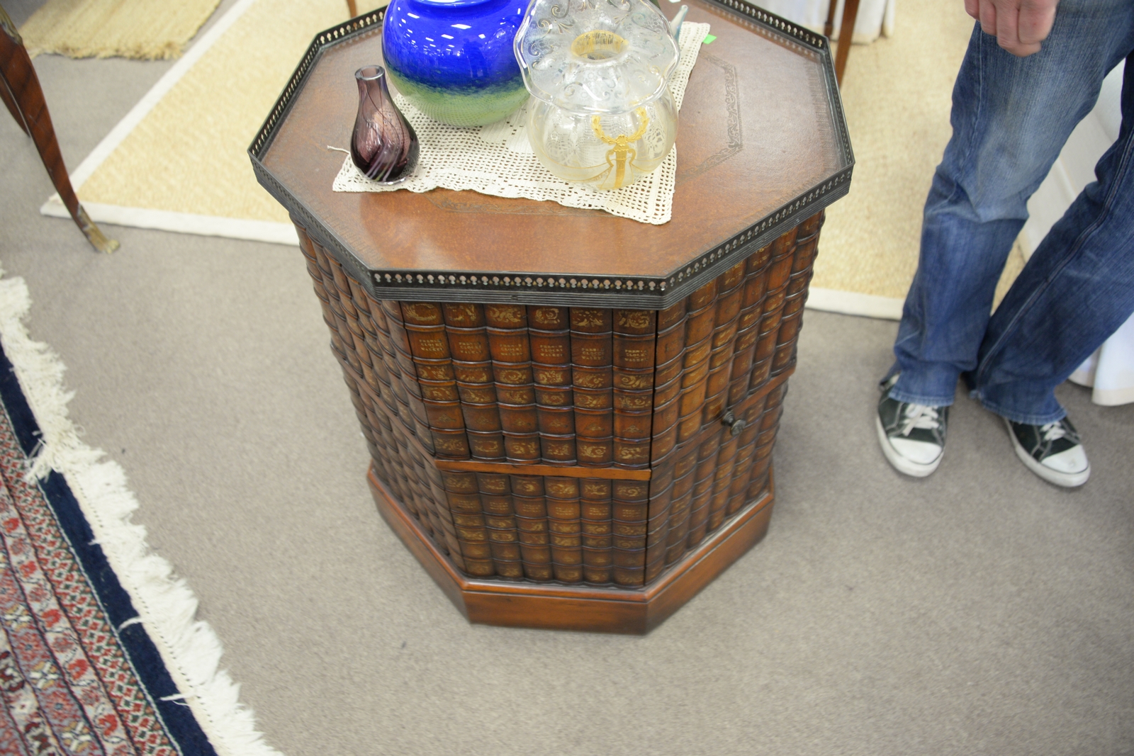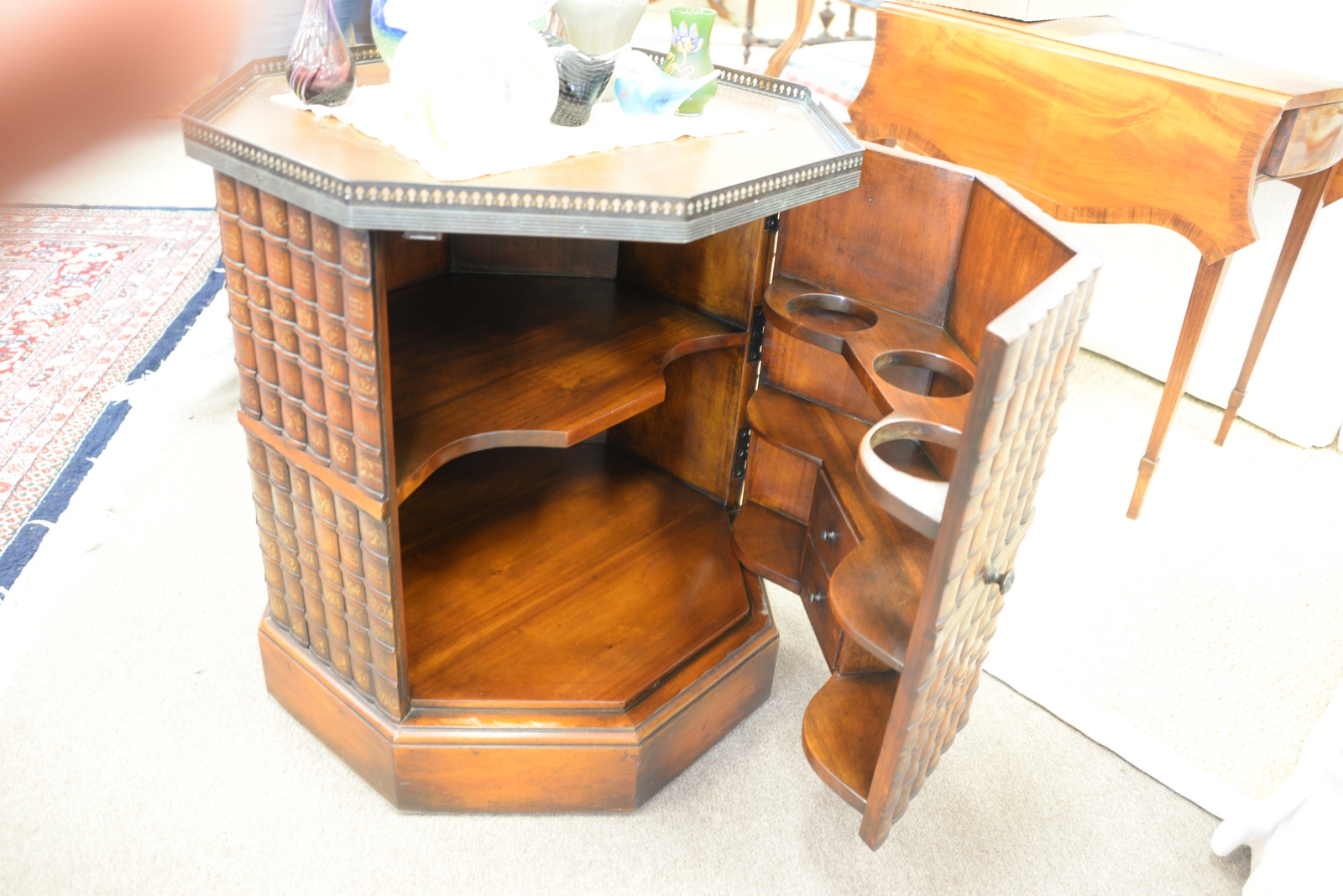 Lot 417: Leather top bar/cabinet with eight sided faux books having one door and brass gallery. ht. 27in., dia. 24in.
