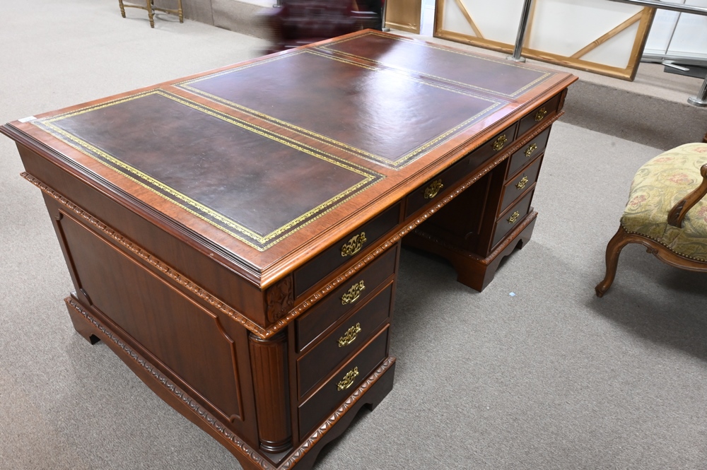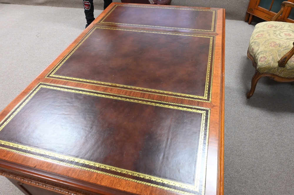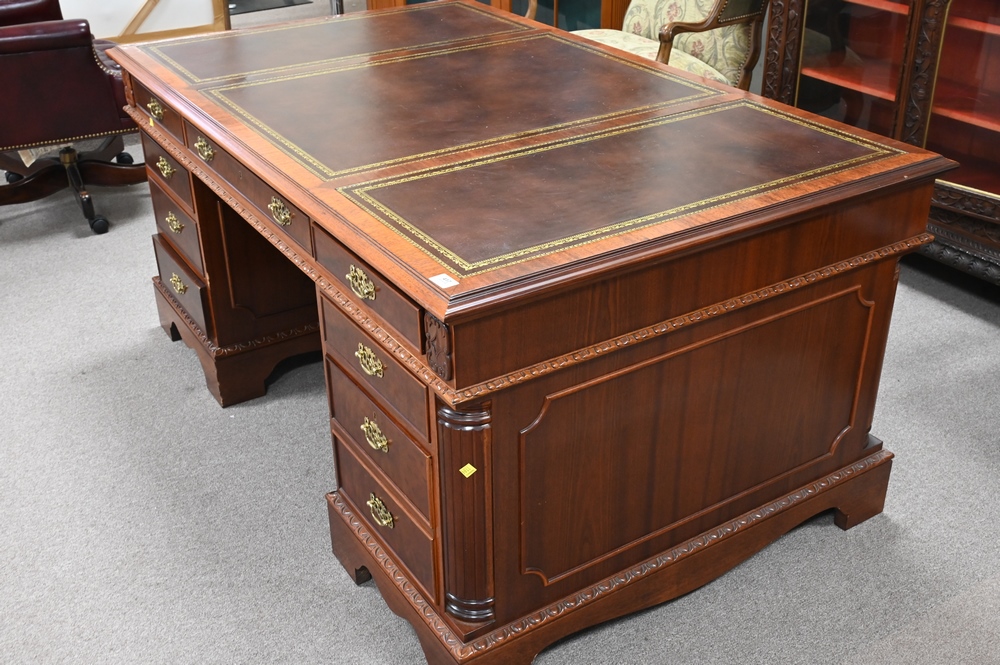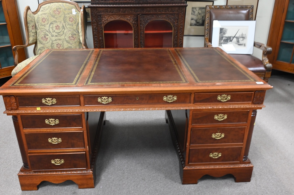Lot 417: Mahogany Executives Partners Desk, in three parts, having three panel tooled leather top along with burl panel drawer fronts, height…