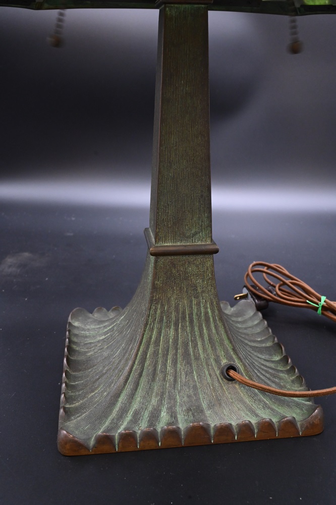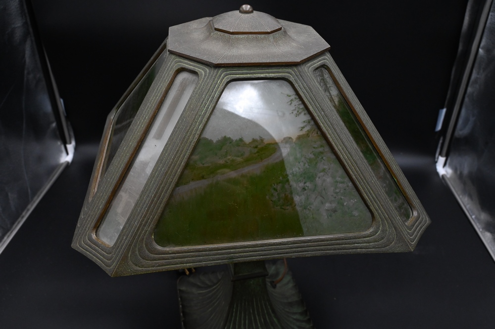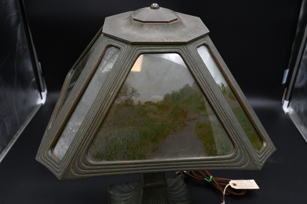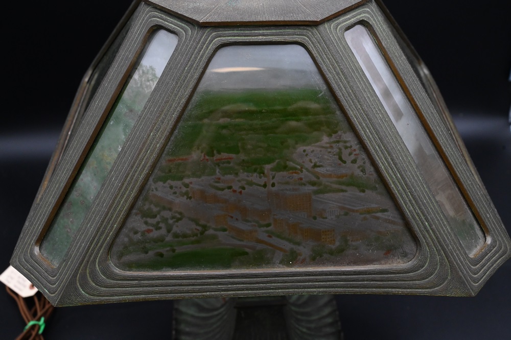 Lot 417: National Cash Register Table Lamp, having bronze base with photographic transfer panel shade, depicting factory landscape scene, hei…