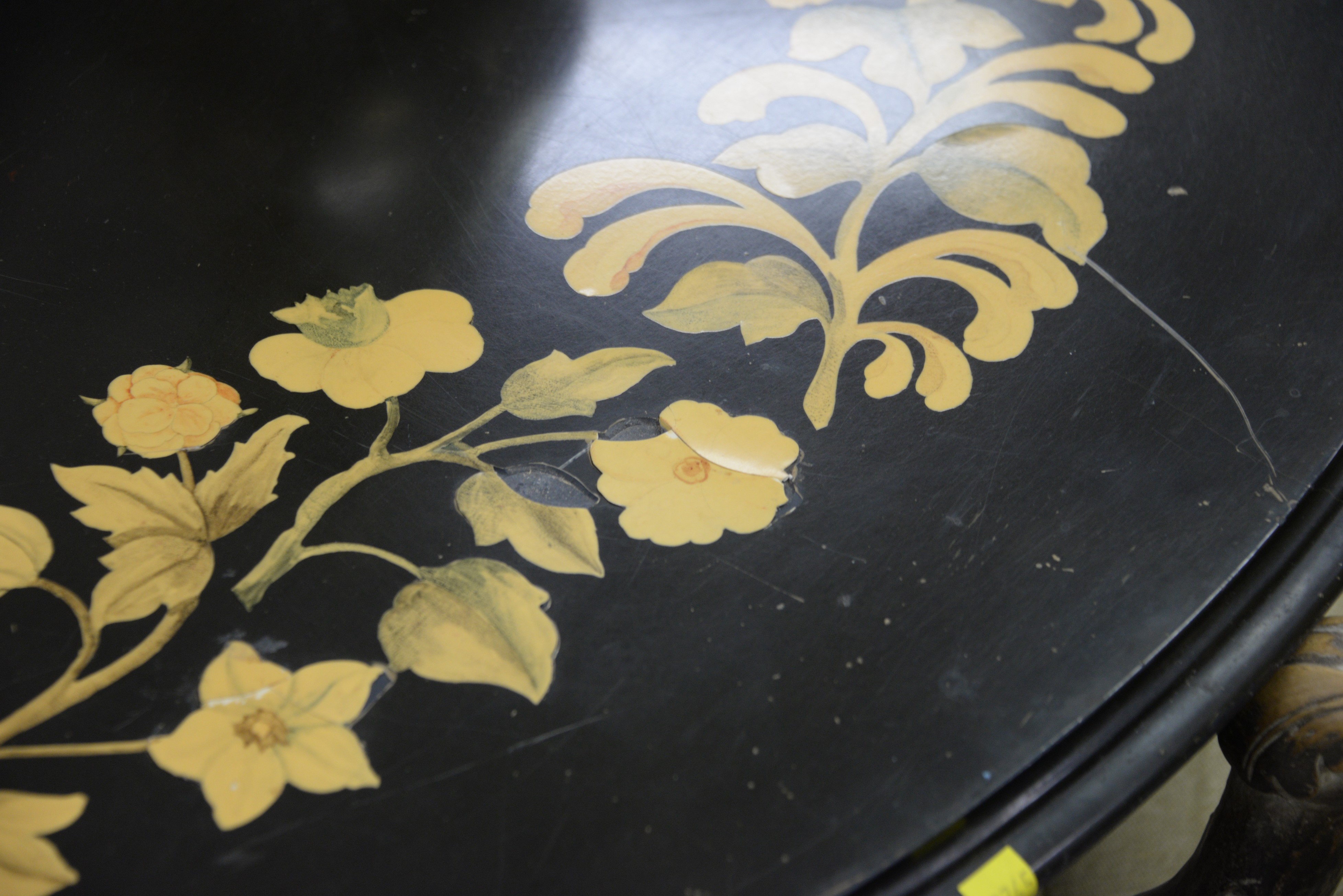 Lot 417: Stone top table with inlaid decoration on iron base, minor imperfections. ht. 29 in. dia. 54 in.