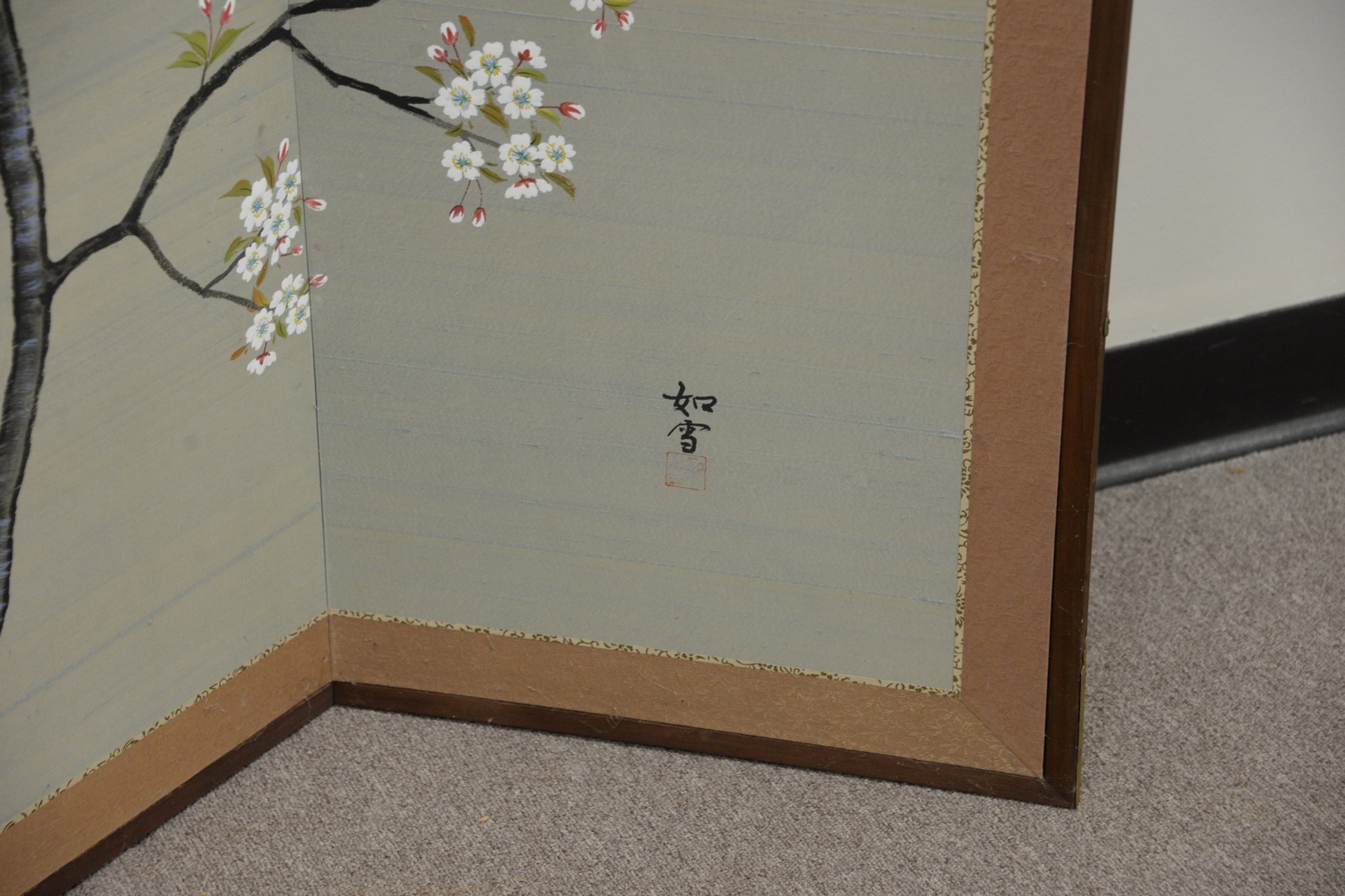 Three Piece Group, to include two carved detail mirrors, along with one Japanese painted silk screen, height 64 1/2 inches, width 72 inches.