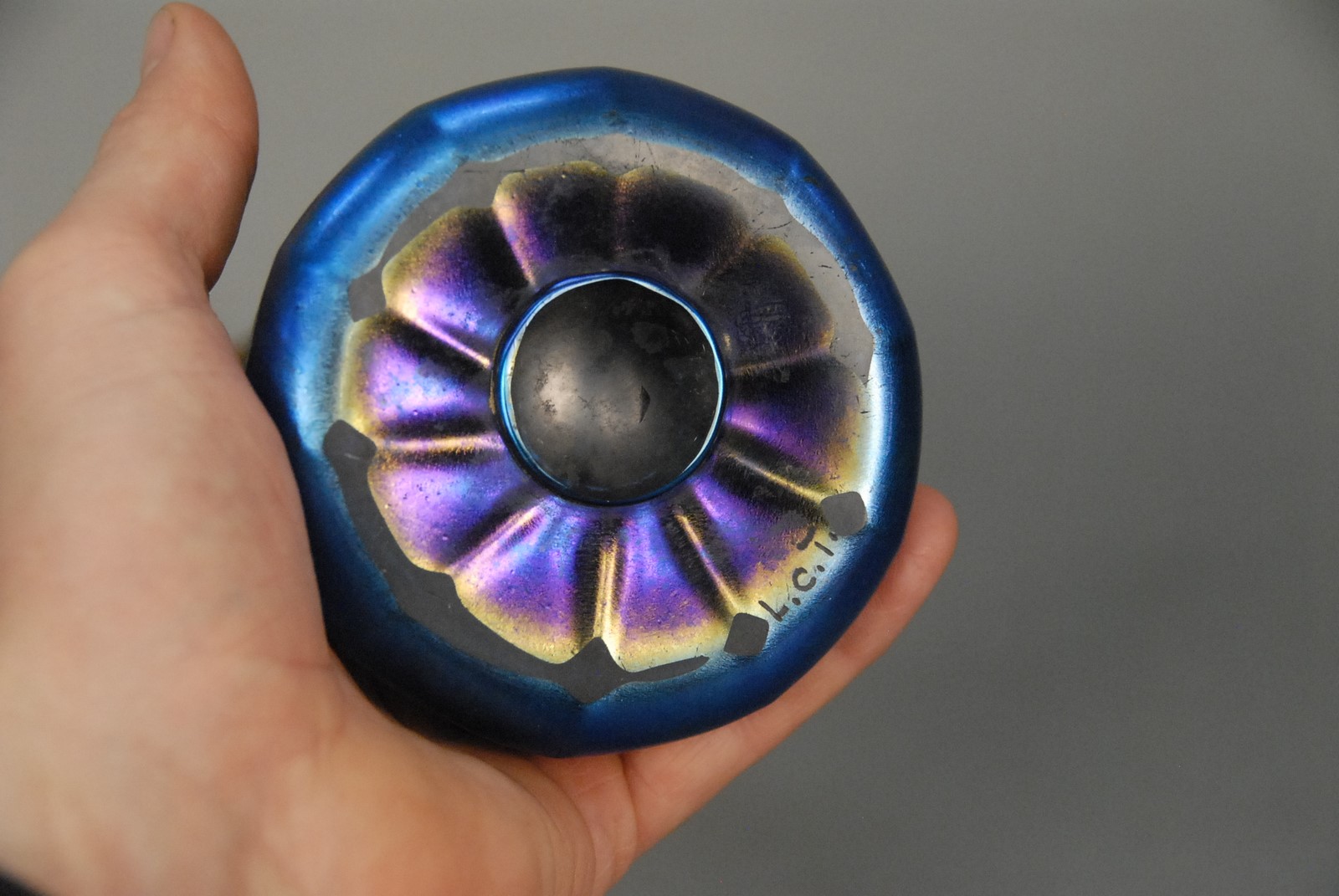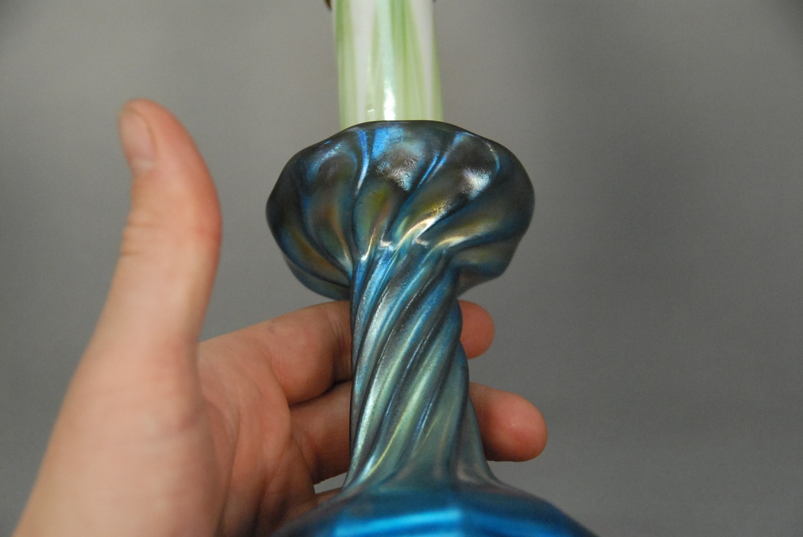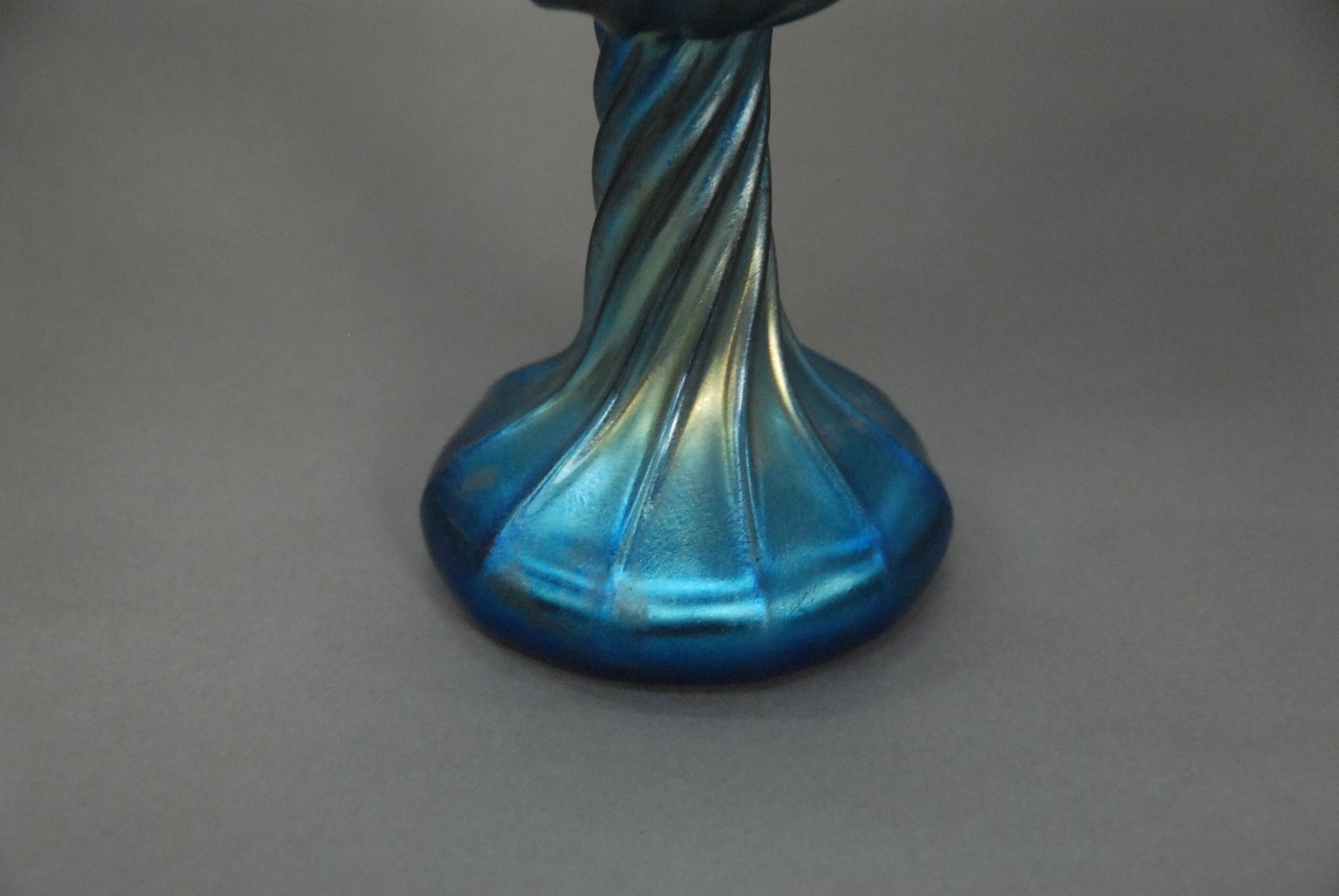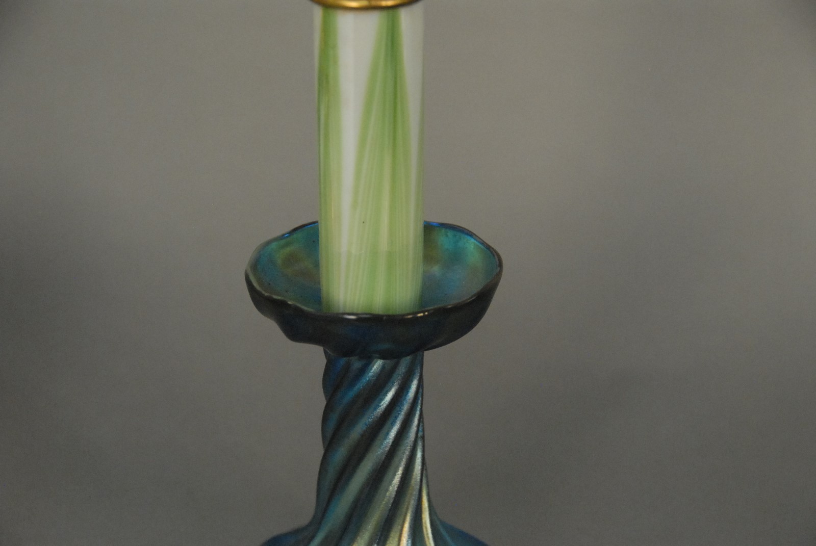 Lot 417: Tiffany blue Favrile glass candlestick lamp with spiral ribbed blue base having columnar opaque white glass standard with upright green leaves, marked on base LCT drill hole on side with no wire and no shade. vase ht. 5 1/4 in. total ht. 12 1/4 in