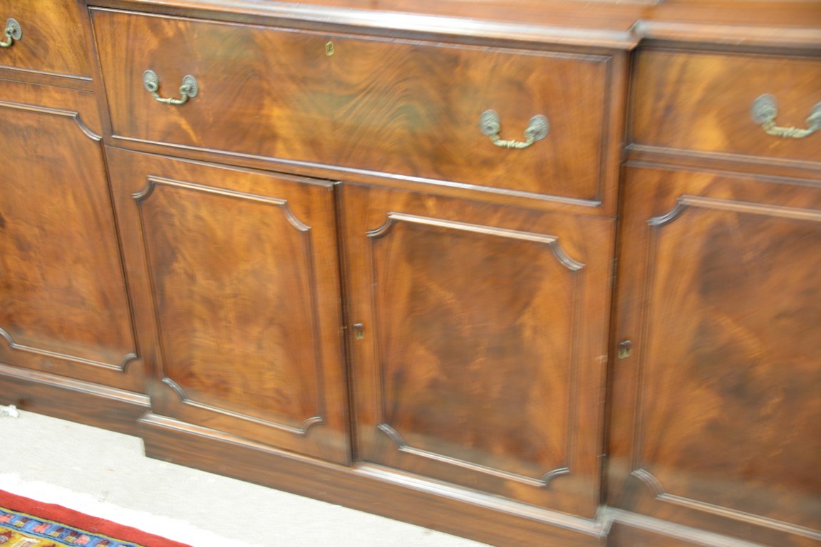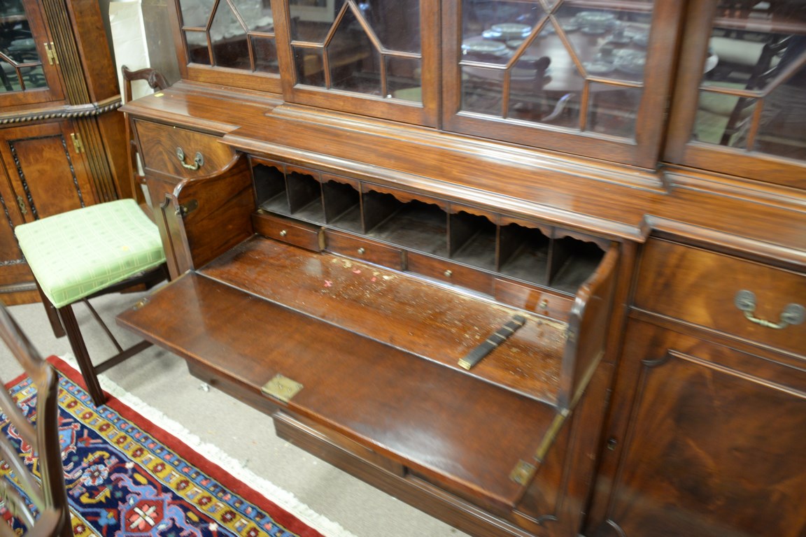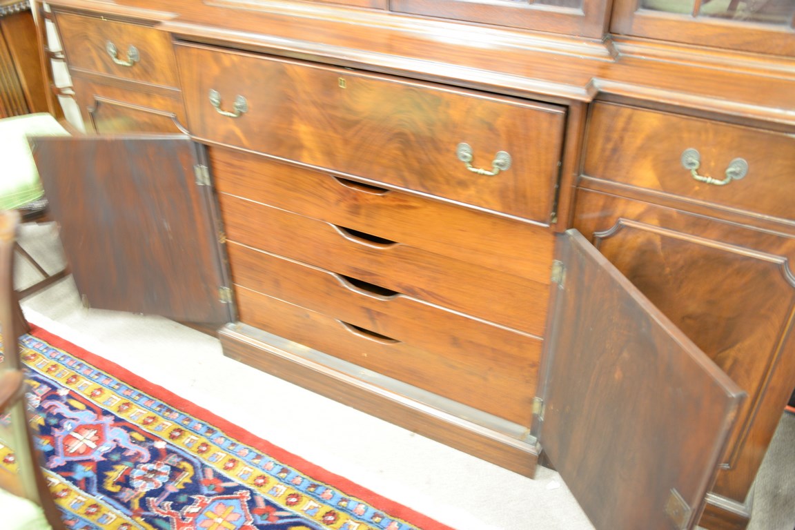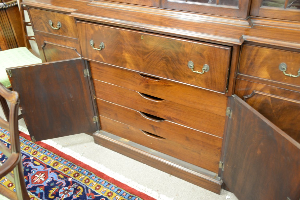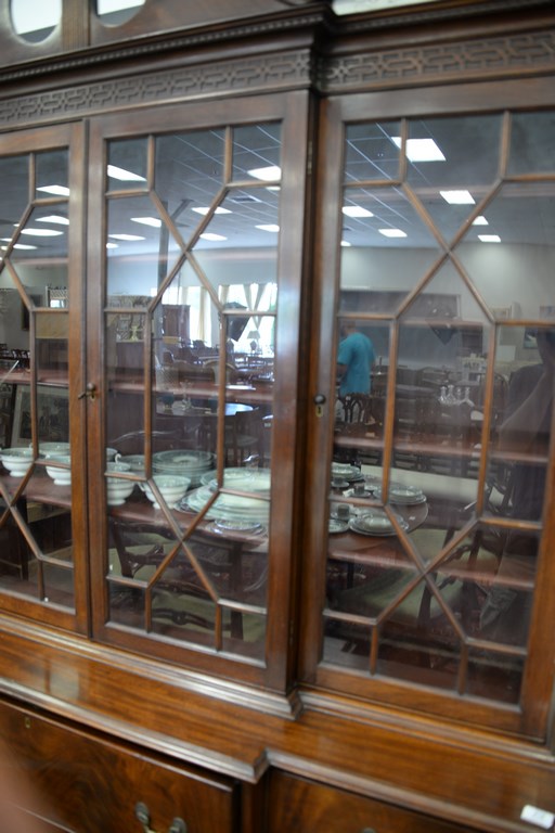 Lot 418: Custom mahogany two part breakfront with pediment top and glazed doors. ht. 93 in. wd. 73 1/2 in. dp. 20 in.