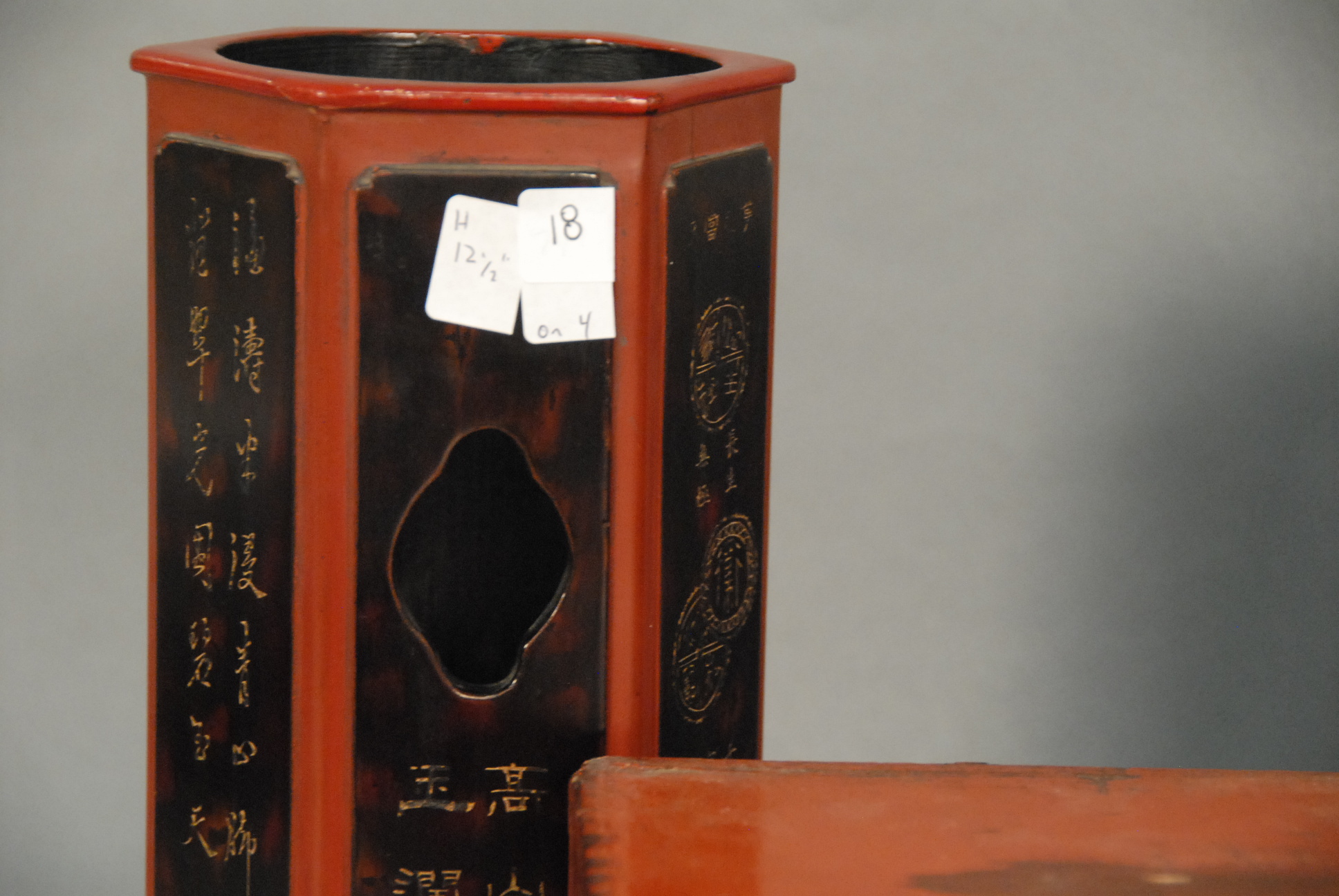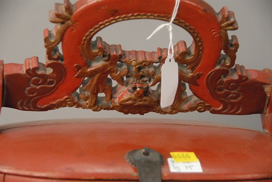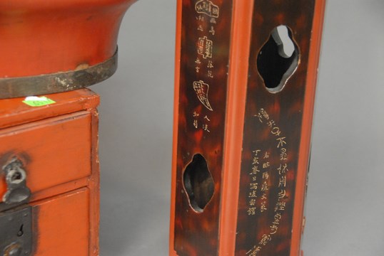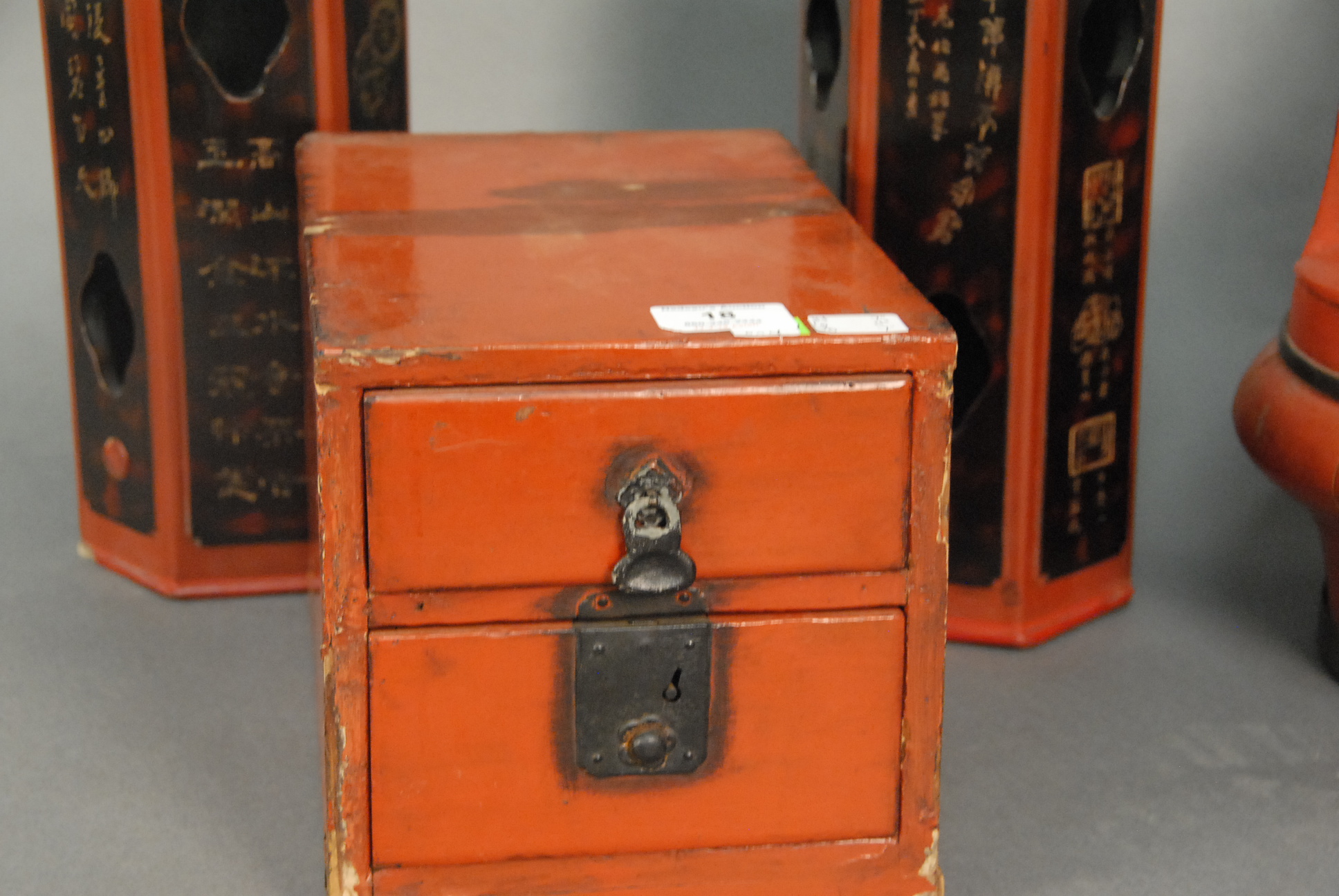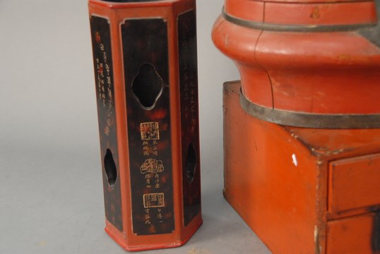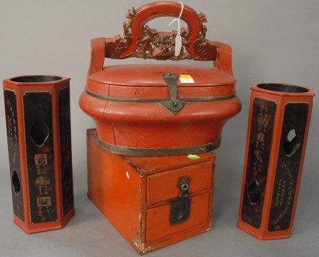 Lot 418: Four piece group of red and black painted pieces to include a lift top box with carved handle ht. 12in. lg. 14in., pair of wood vases ht. 12in., and two drawer small red painted small cabinet ht. 7in. lg. 11in. wd. 7in.