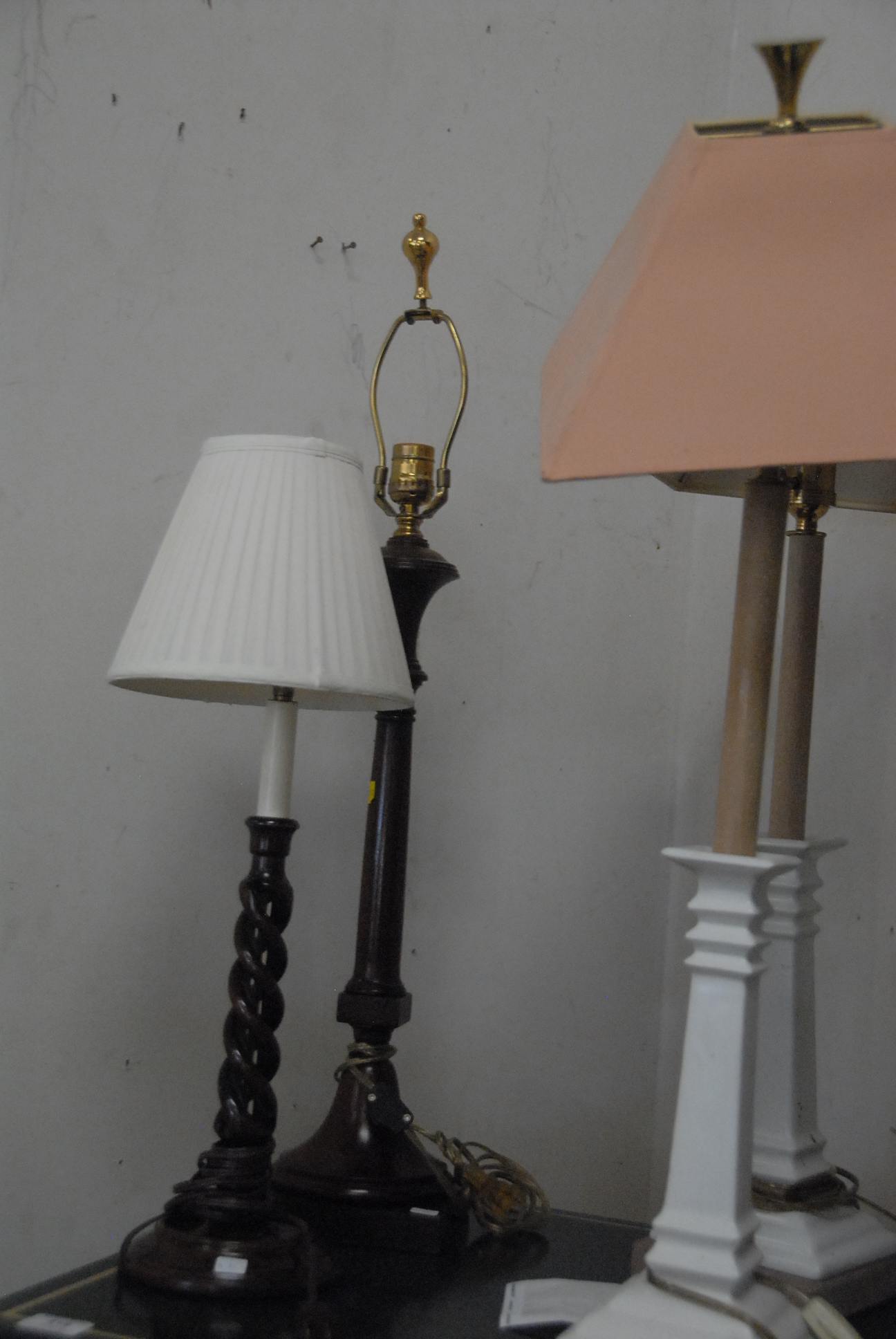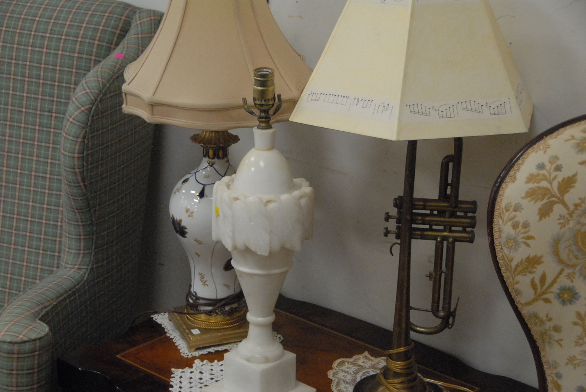 Lot 418: Group of nine table lamps including an alabaster lamp, trumpet made into a lamp, two wood lamps, pair of ceramic lamps, porcelain la…