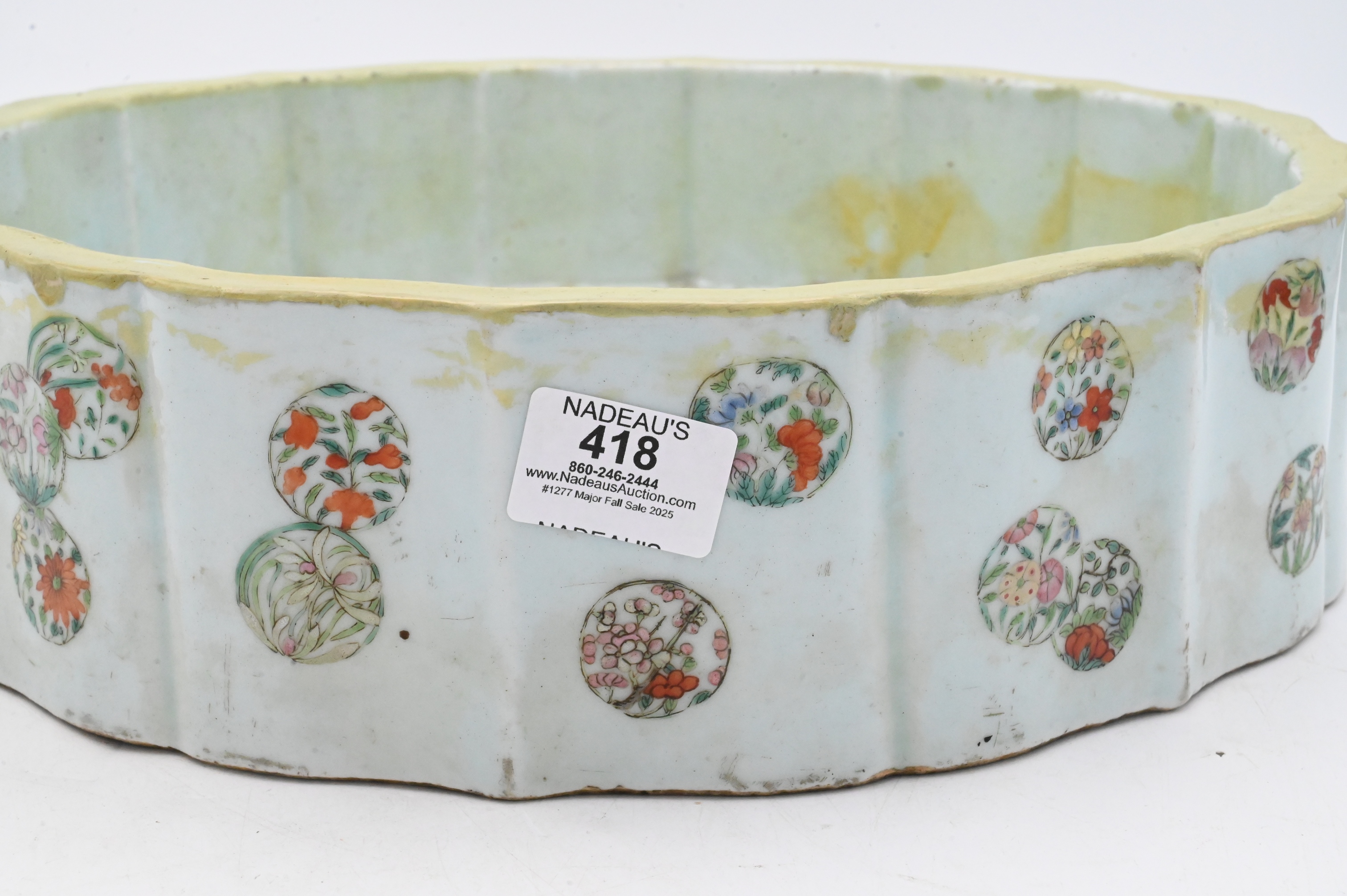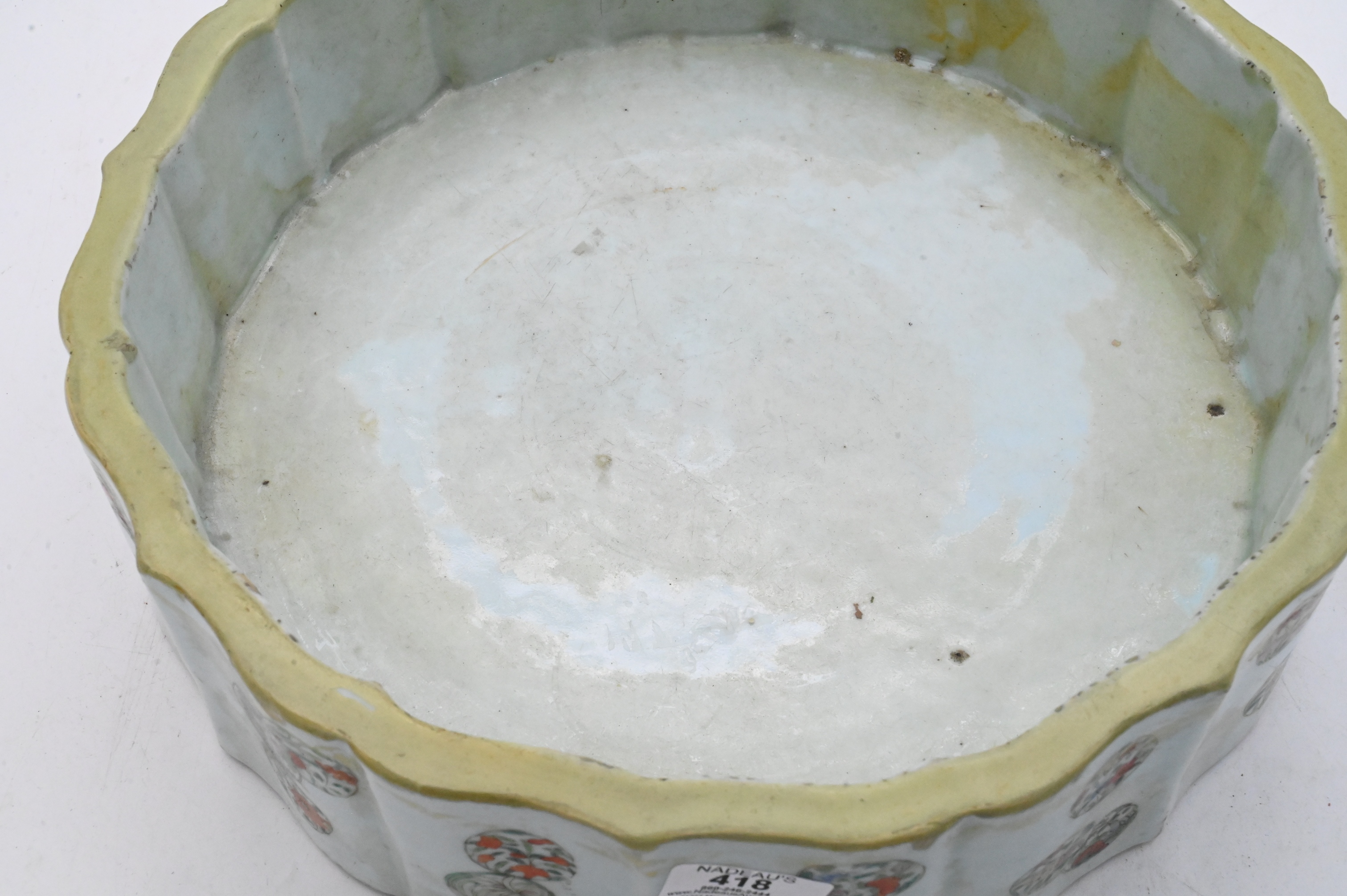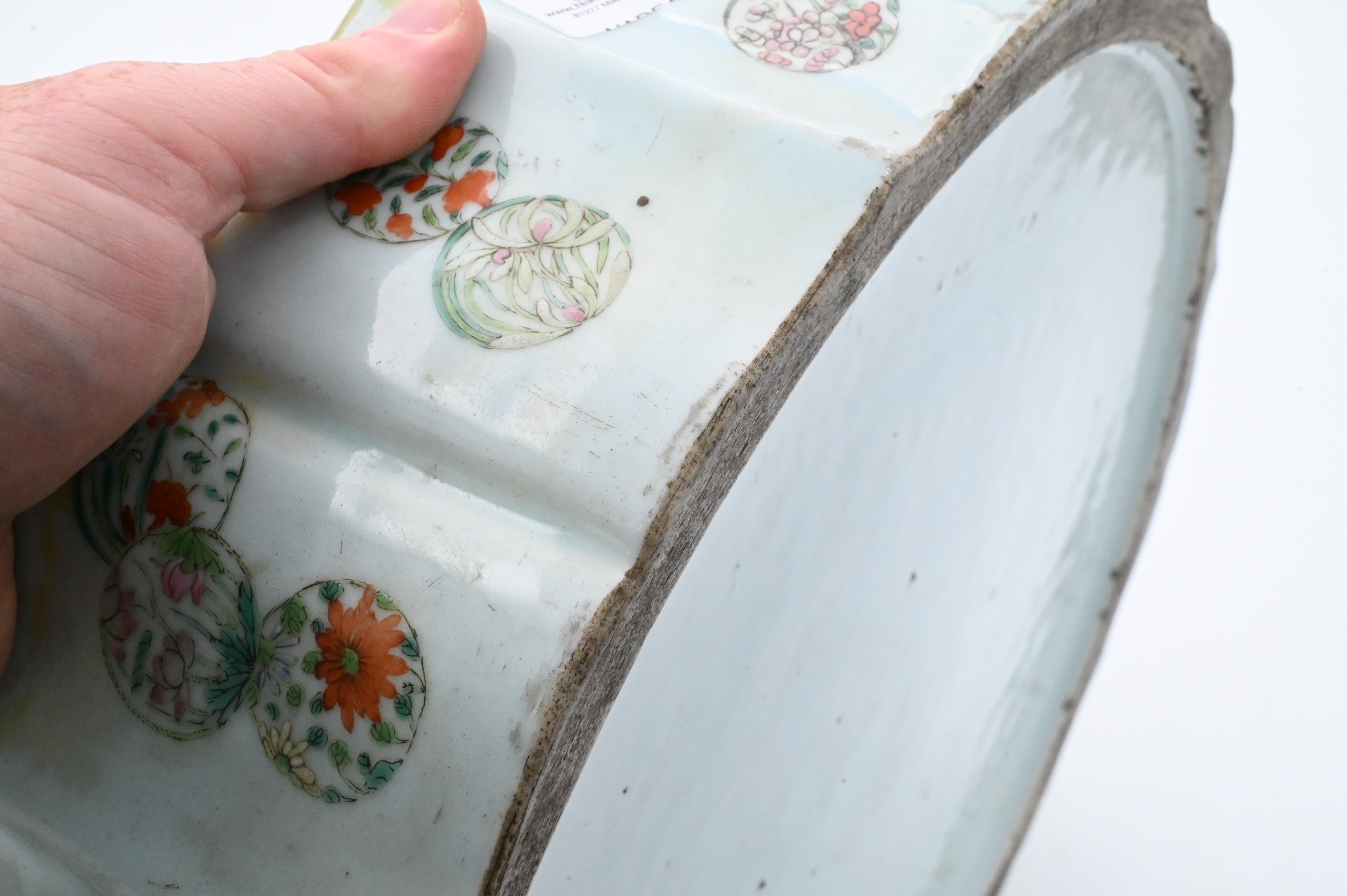 A large Chinese porcelain basin of lobed circular form, decorated around the exterior with roundels enclosing floral motifs in famille rose enamels, the rim with pale yellow glaze.