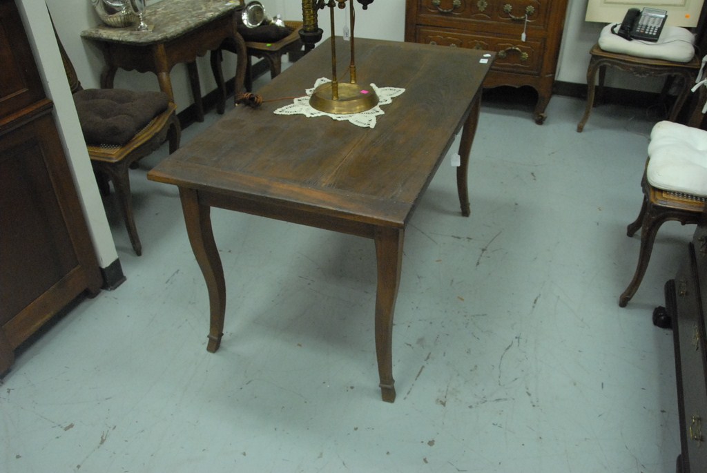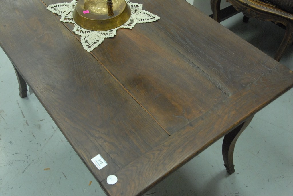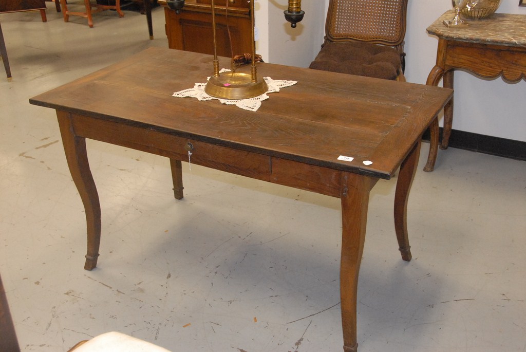 Lot 418: Louis XV style oak writing desk with single drawer and plank top, 19th century. Provenance: From prominent Woodbridge, Connecticu…..
