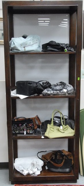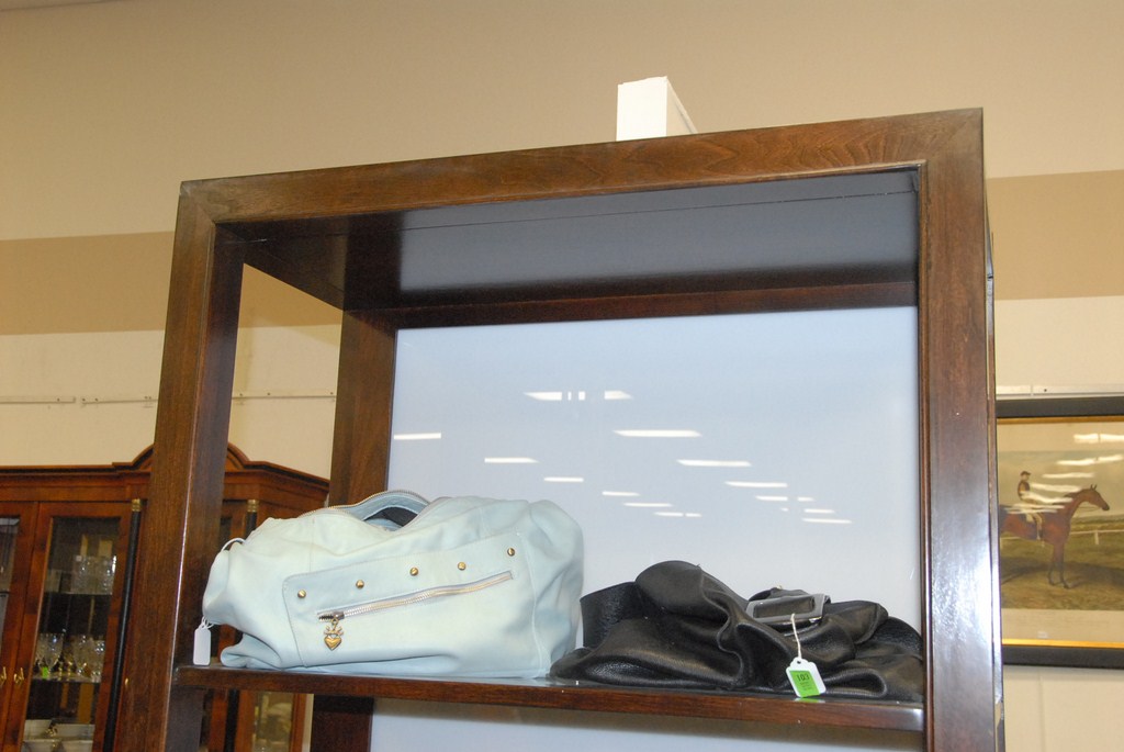 Lumine Collection by Thomasville Furniture Company mahogany contemporary eterge with glass insert shelves, ht. 84in.