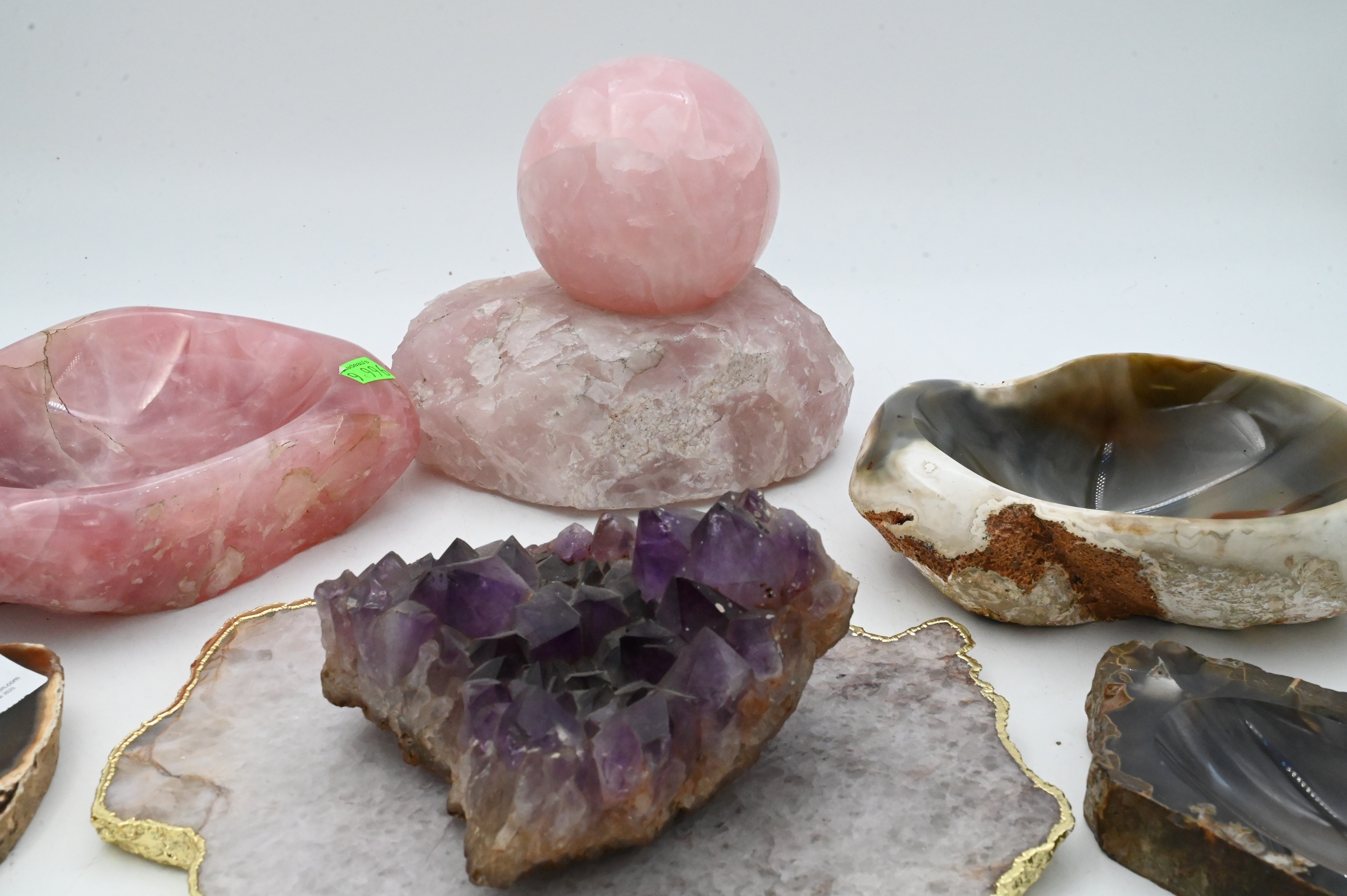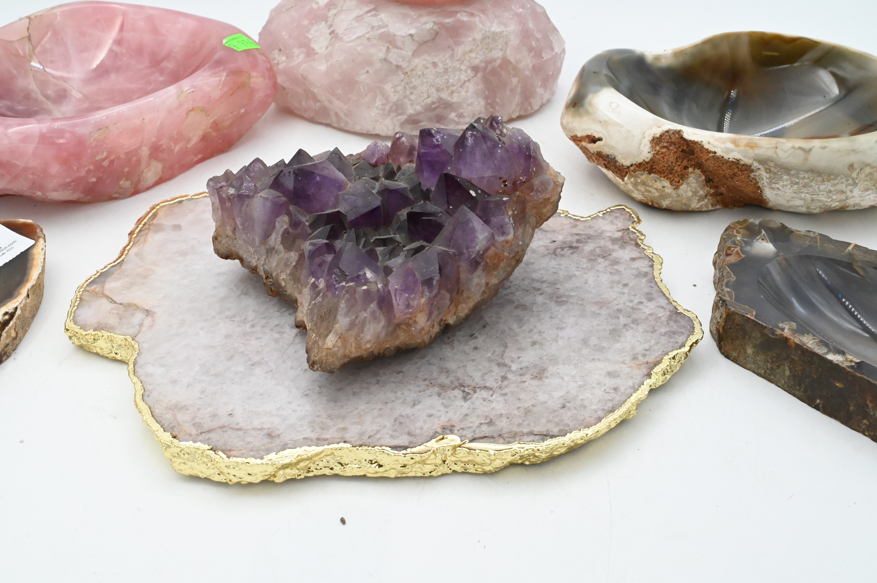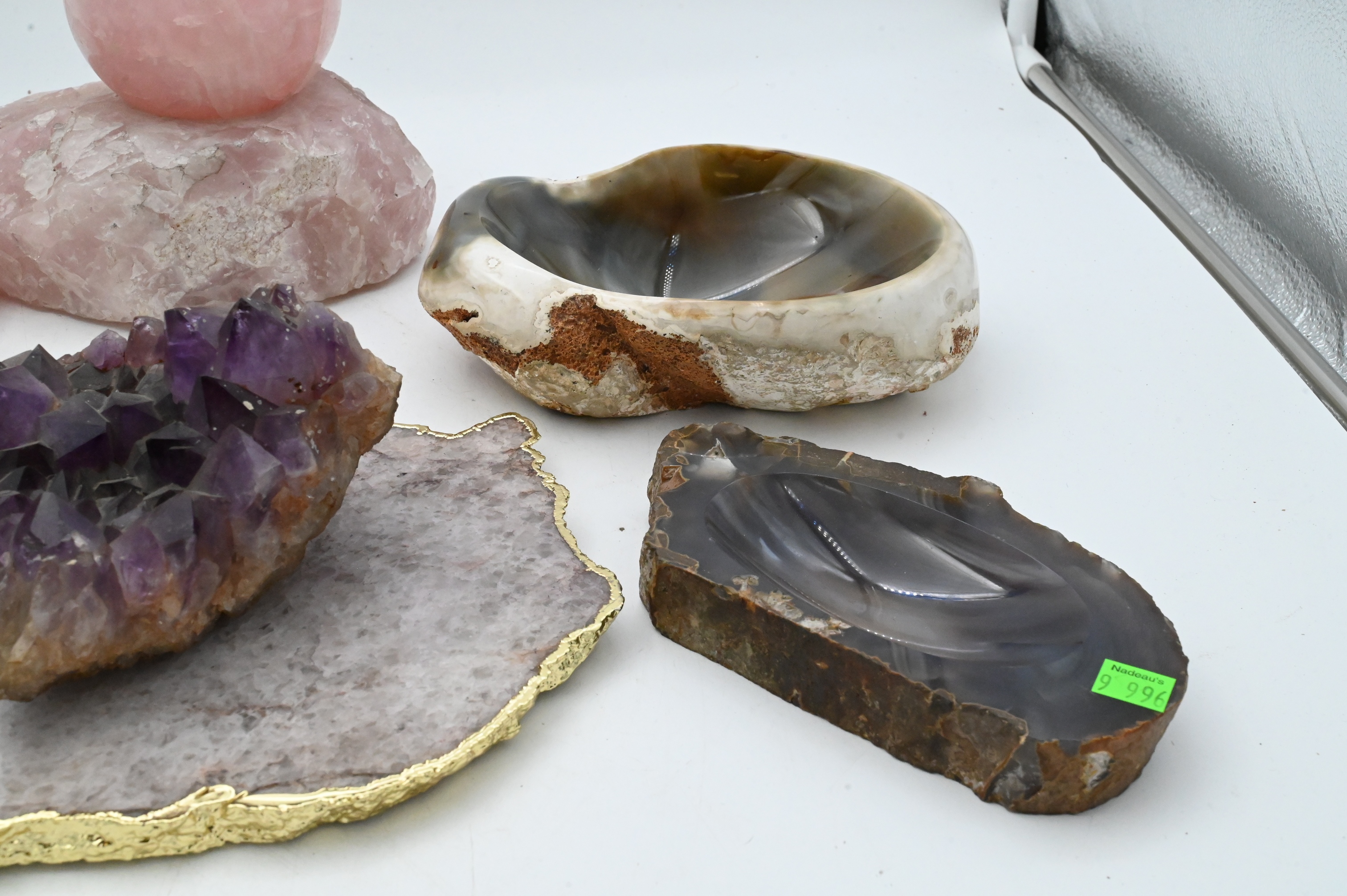 to include rose quartz and two polished agate ashtrays, amethyst, rose quartz sphere (diameter 3 1/2 inches) with mount drilled for lamp wiring, along with gilt agate cheese board