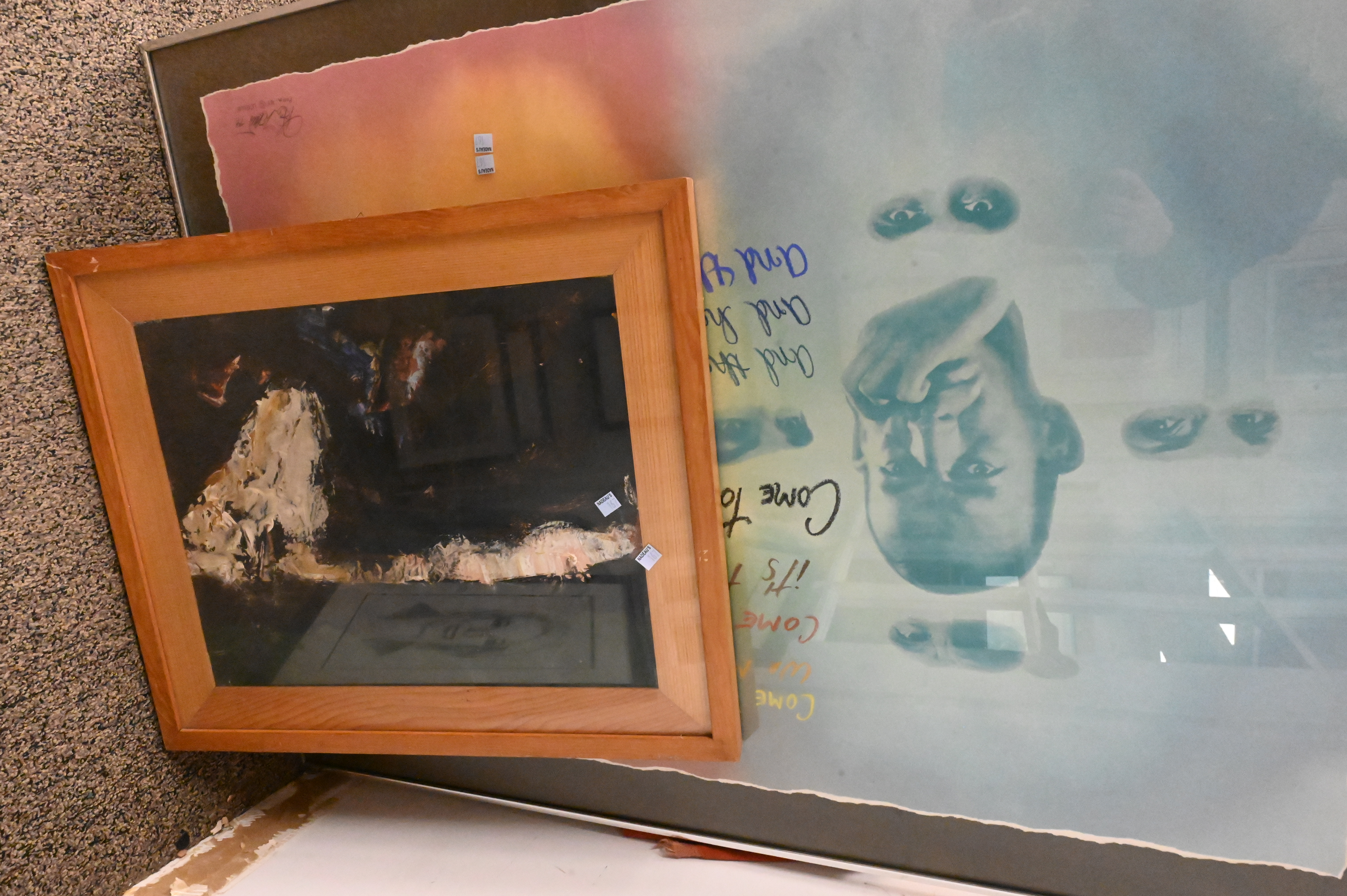 oil painting of a bird, abstract composition, two Don Keene figure studies, watercolor on paper “Mississippi Cotton”, etc…