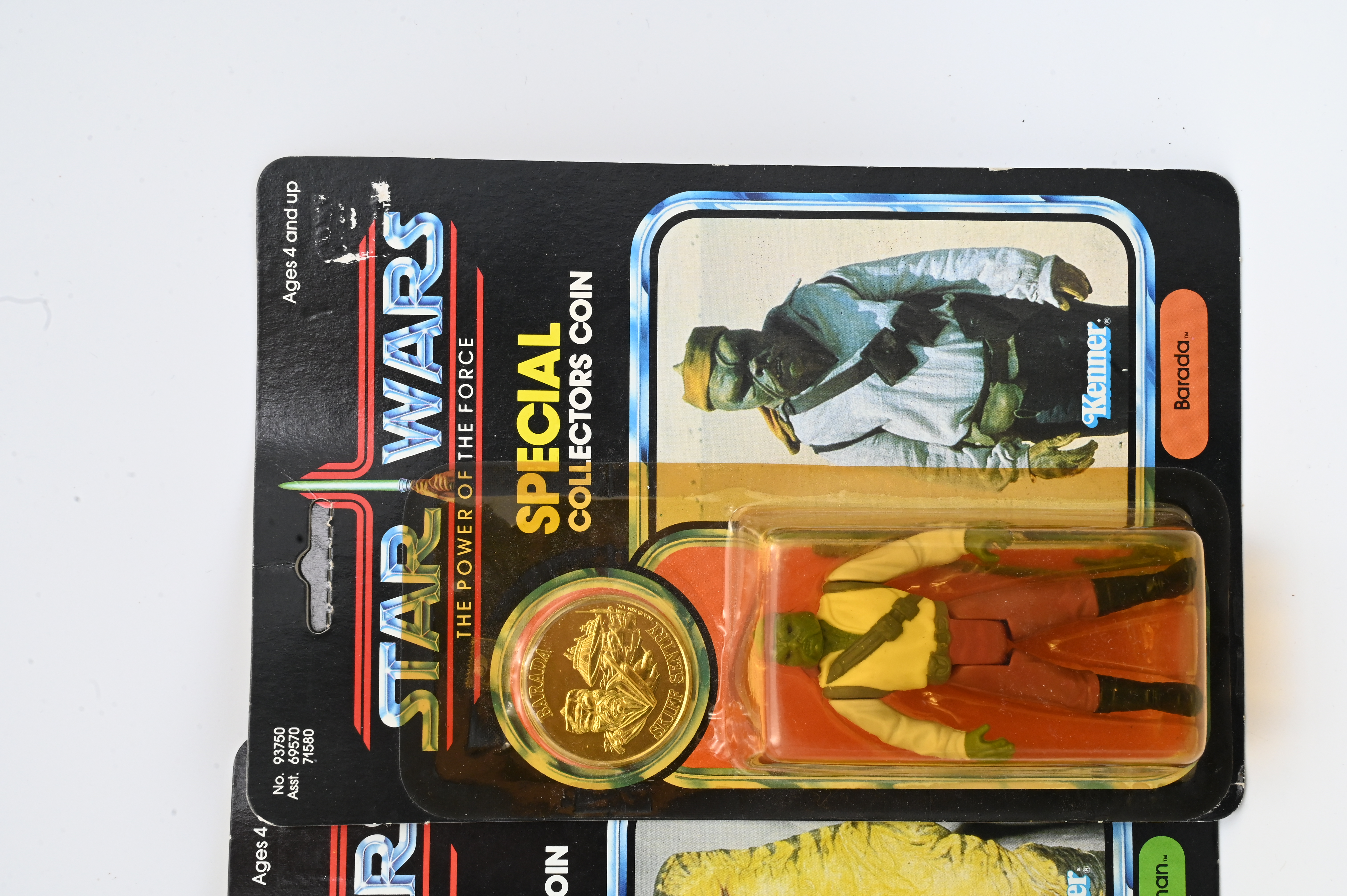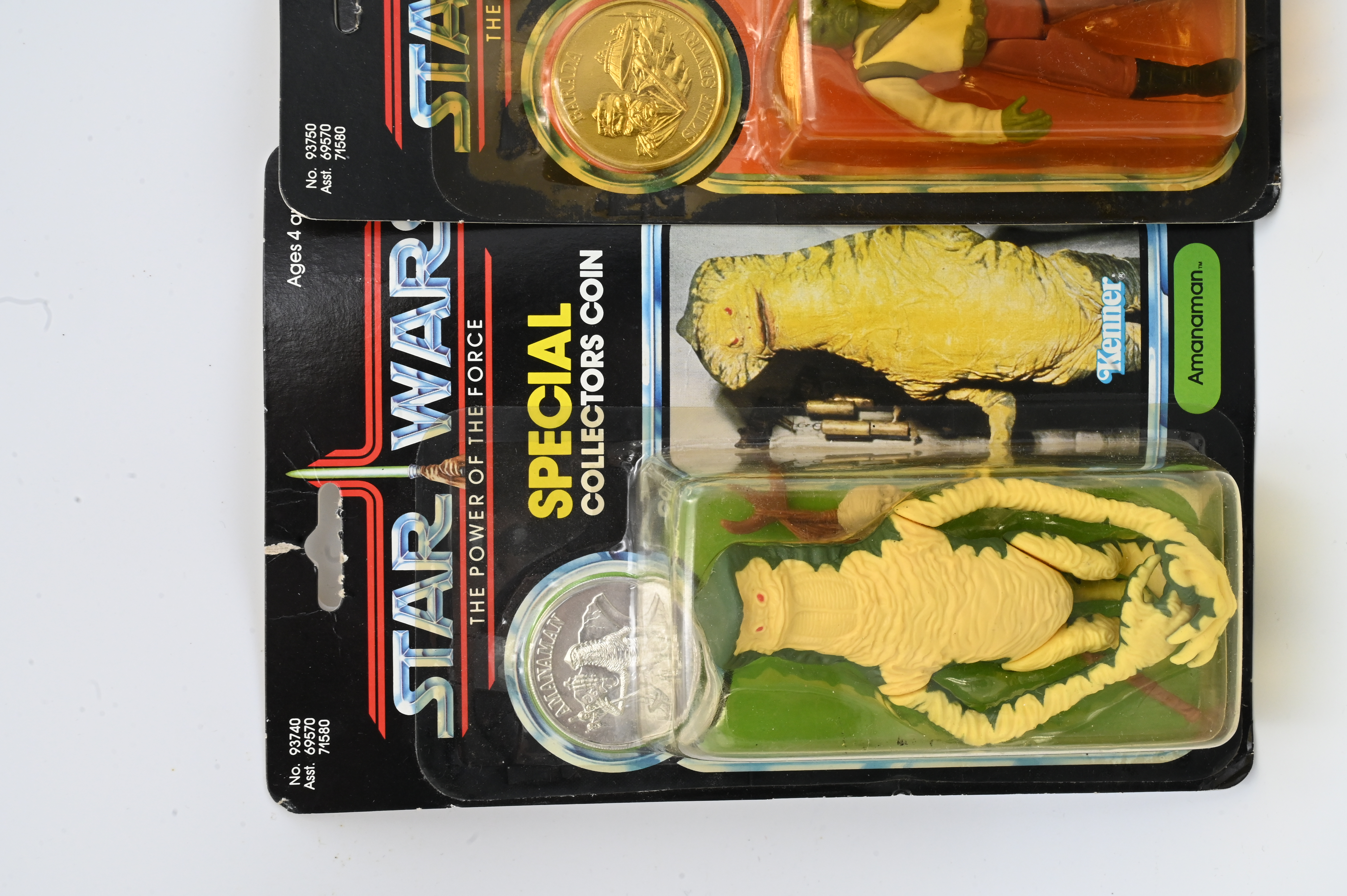 Two Piece Lot of 1984 Kenner Star Wars “The Power of the Force” Action Figures, to include Baroda special collectors coin, along with “Amanaman” having special collectors coin, in original packaging, (as is).