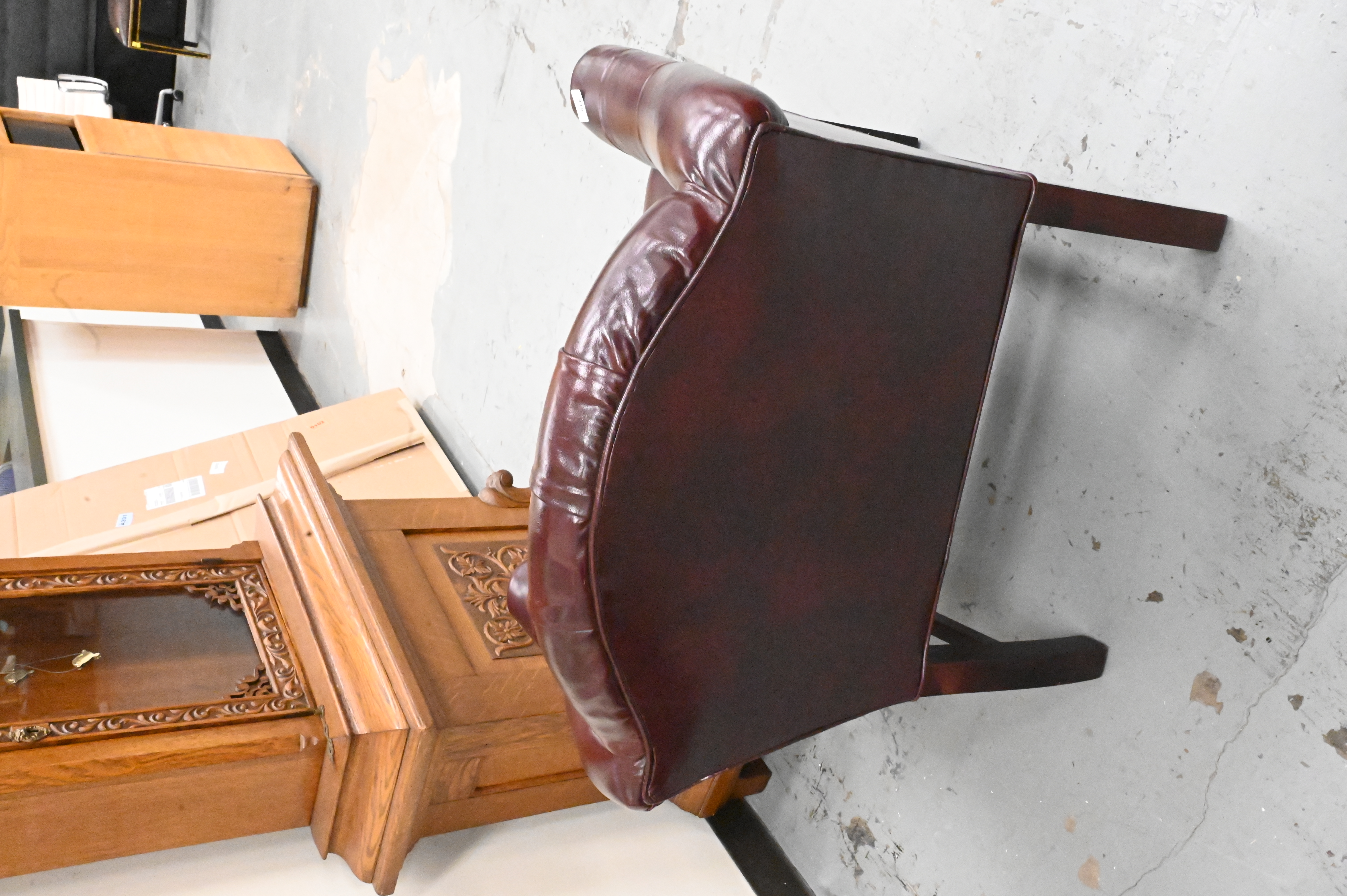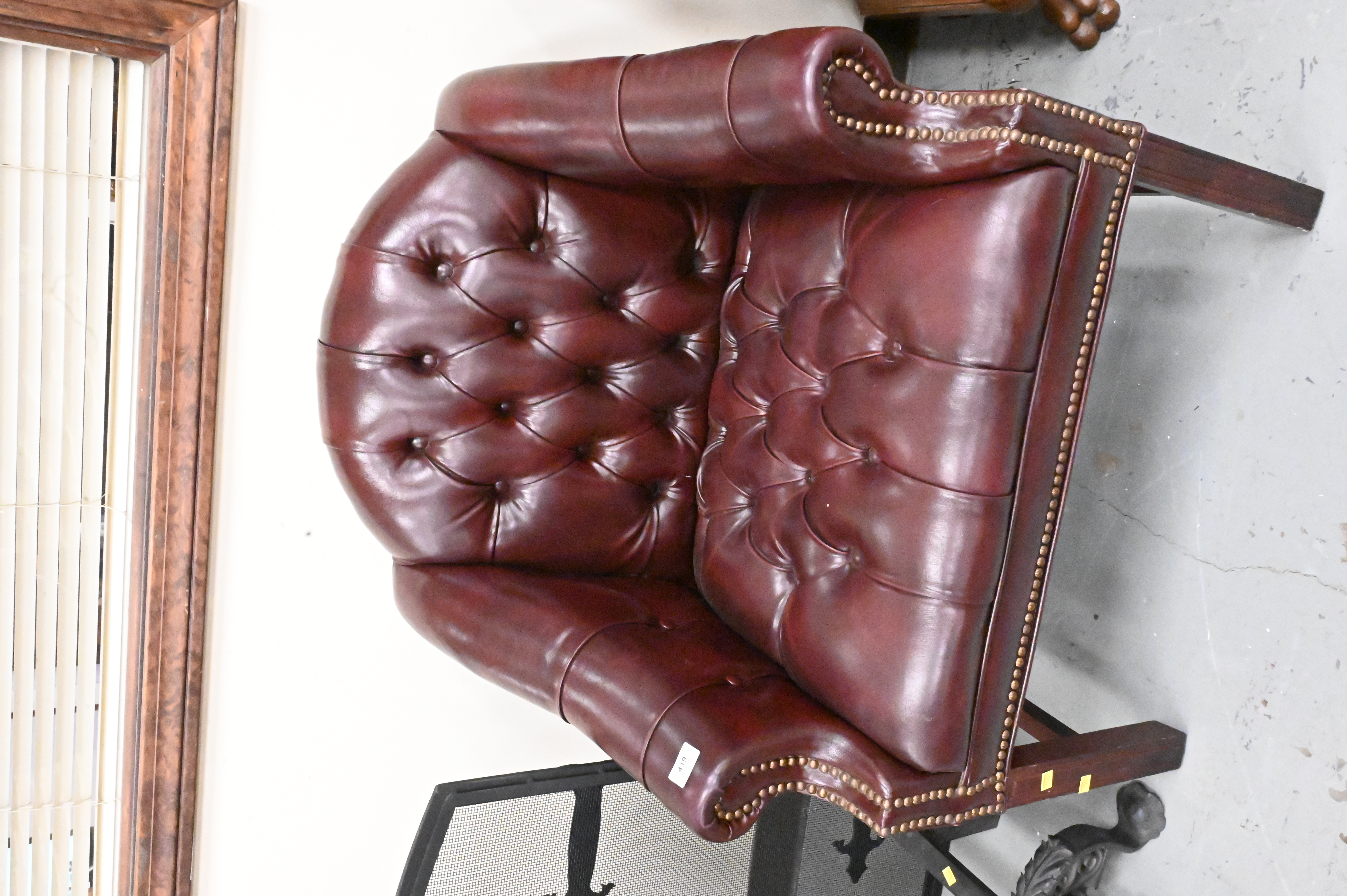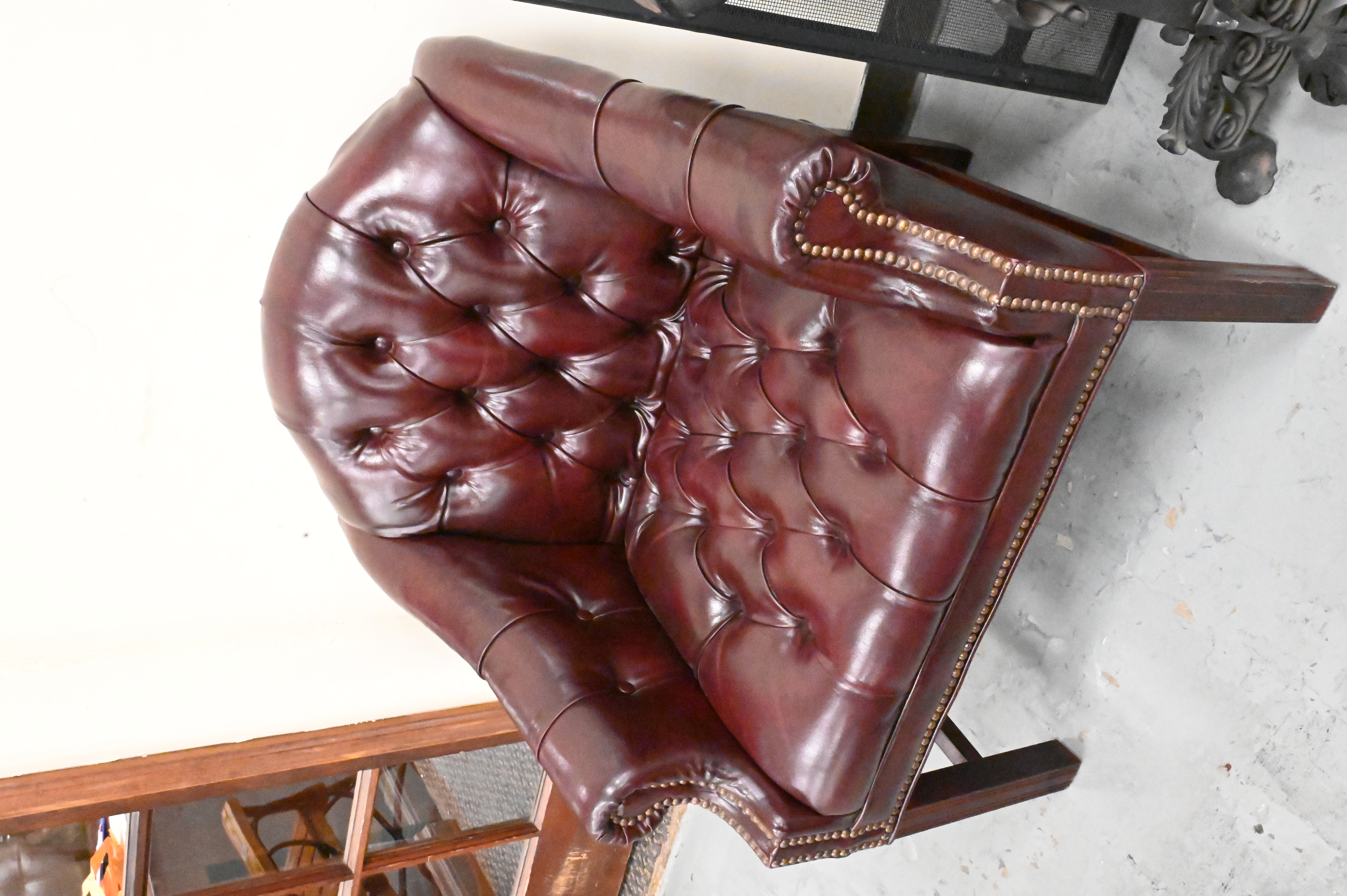 A Pair of Chippendale Style Armchairs, having tufted burgundy vinyl, clean condition, very slight wear, height 35 inches, width 31 inches.