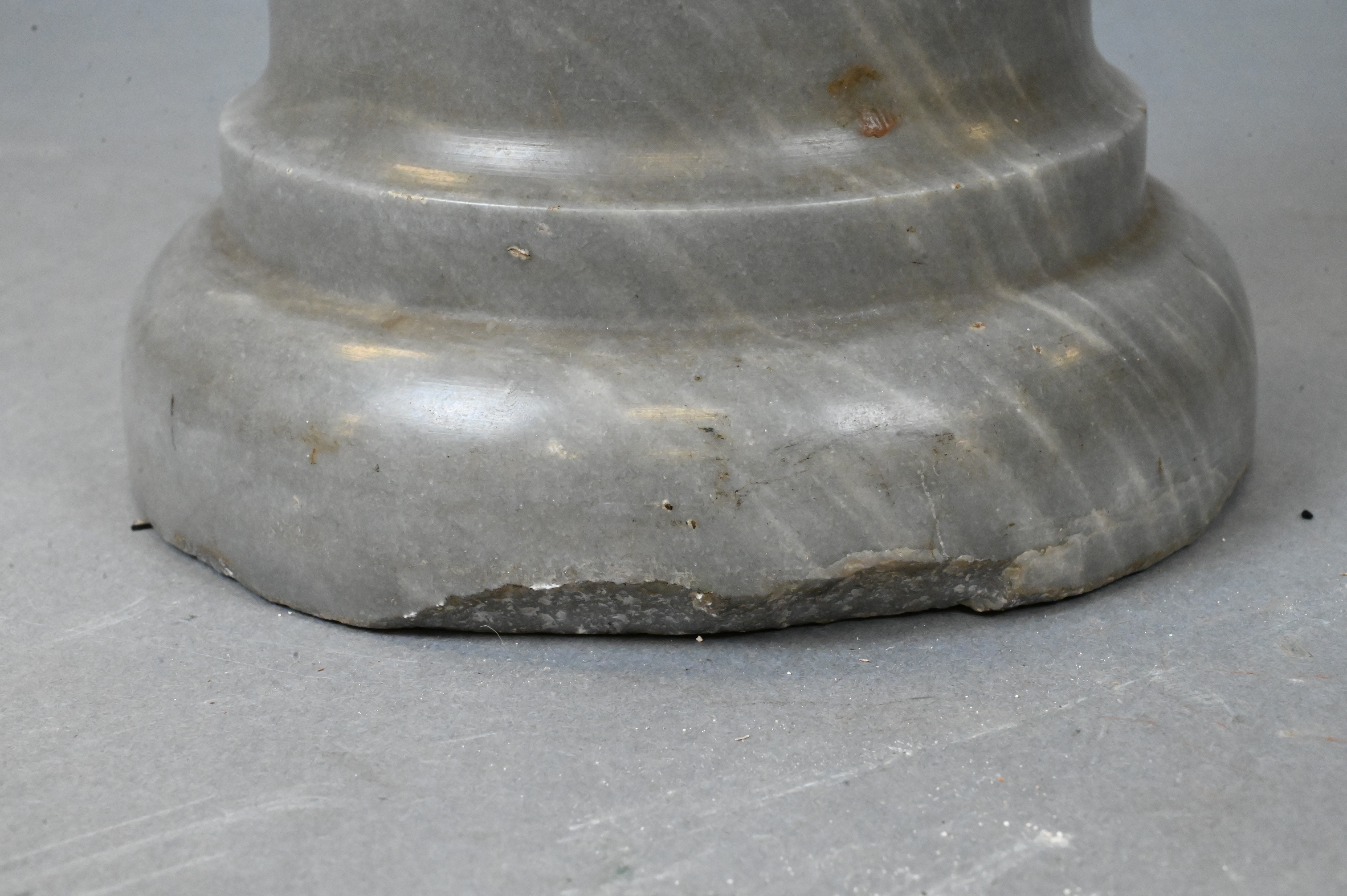 expressive carved marble head depicting a heavily bearded male figure in the manner of Roman monumental sculpture, with a deeply furrowed brow, prominent features, and thick curling beard, carved at a later date in the classical Roman style, mounted on a turned gray marble plinth, European, in the Roman style, late 18th Century