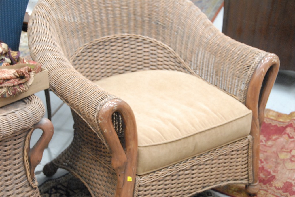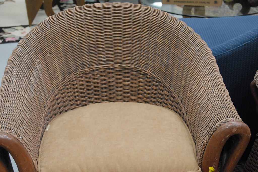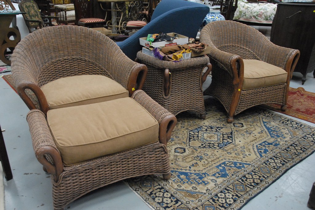 Four piece wicker set, two armchairs, footstool, and table all with swan’s heads.