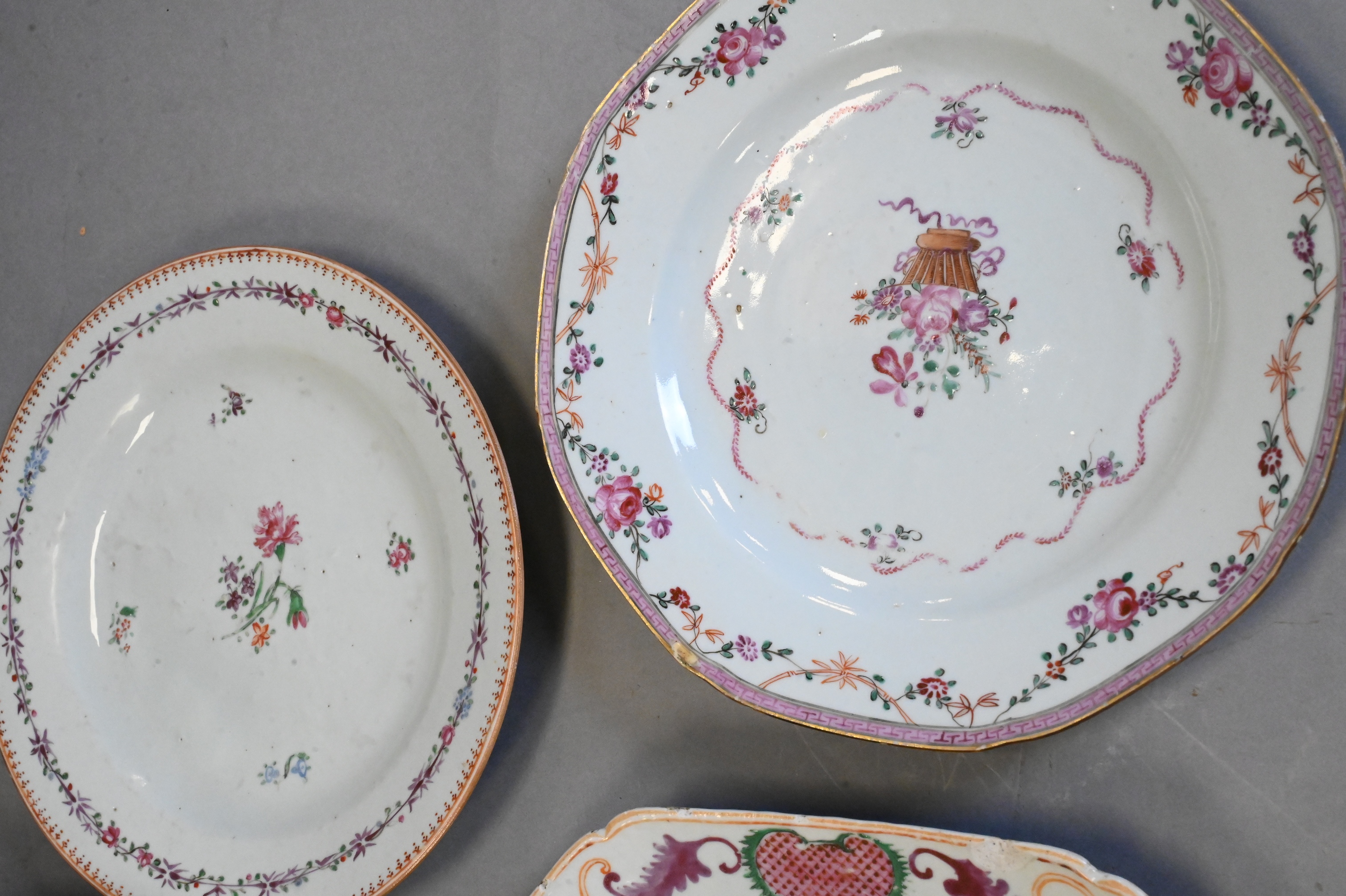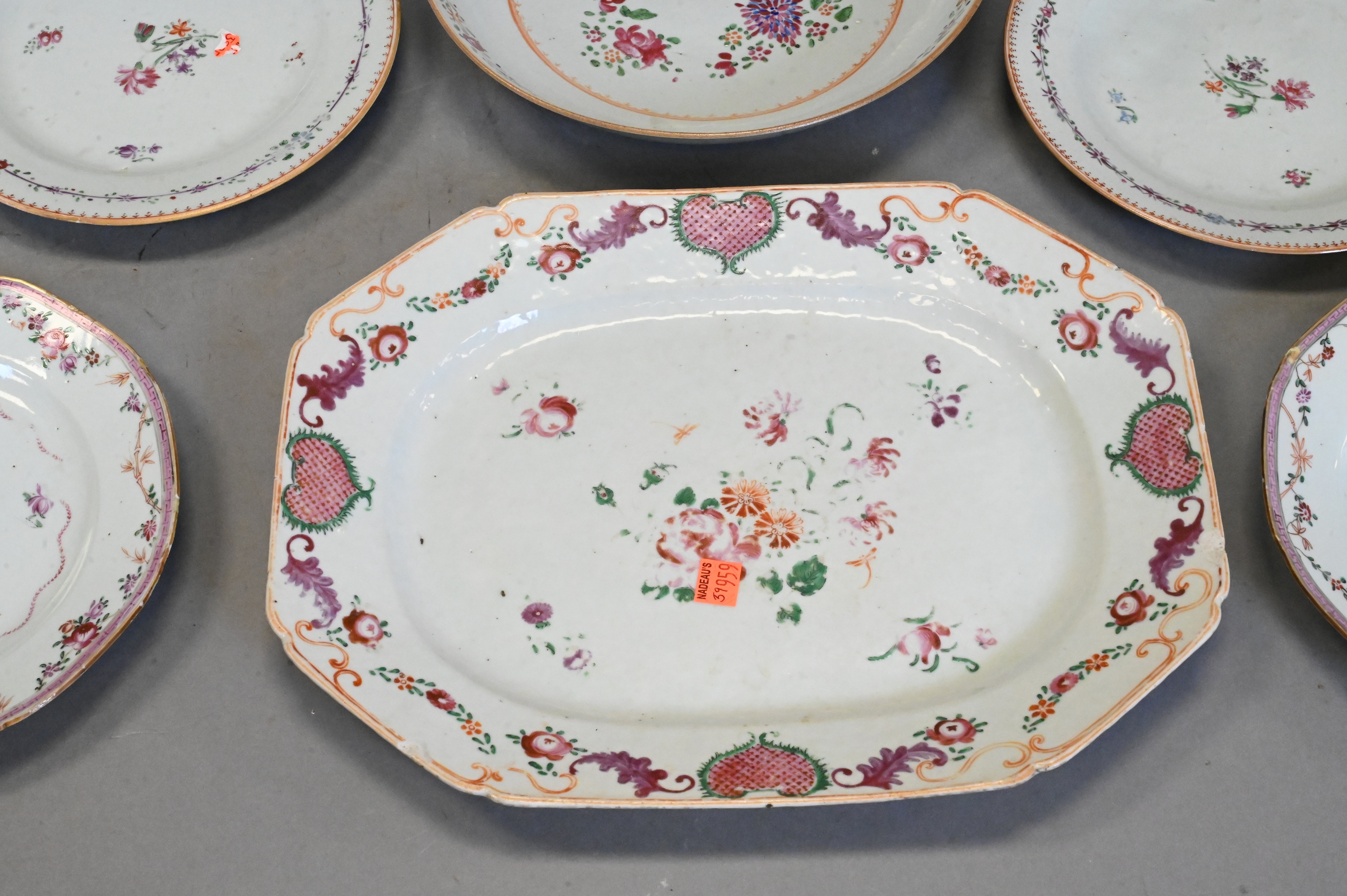 A group of Chinese export famille rose porcelain, including four plates, one bowl, and one octagonal platter, each decorated with floral sprays and polychrome enamel borders.