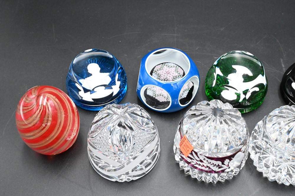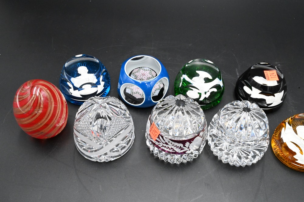 Lot 419: Group of Nine Glass Paperweights, to include four Baccarat silhouette, one St. Louis millefiori, along with four others; tallest 4 inches, largest diameter 2 1/2 inches. Provenance: Collections of Norma Reilly, New Jersey.