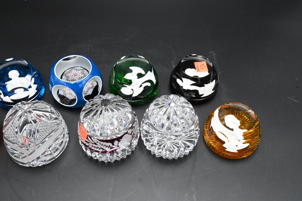 Group of Nine Glass Paperweights, to include four Baccarat silhouette, one St. Louis millefiori, along with four others; tallest 4 inches, largest diameter 2 1/2 inches. Provenance: Collections of Norma Reilly, New Jersey.