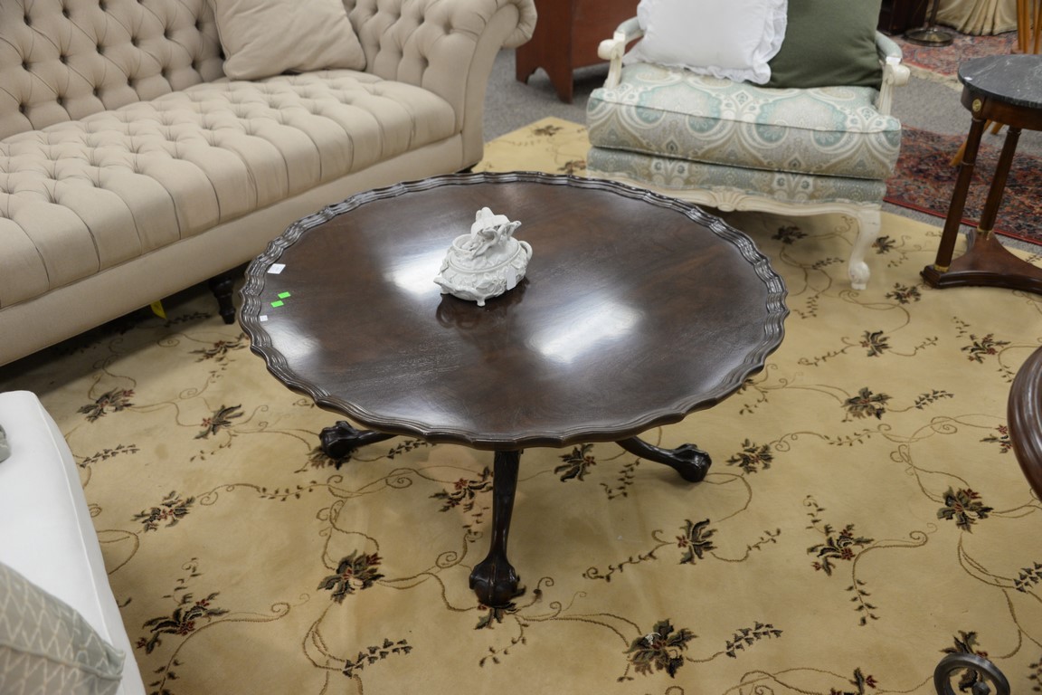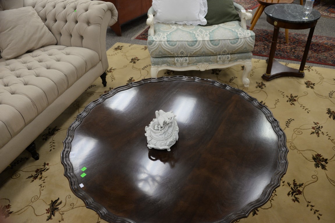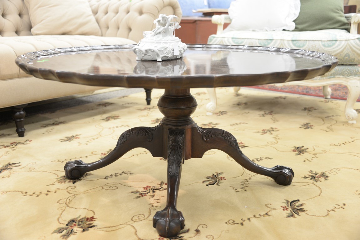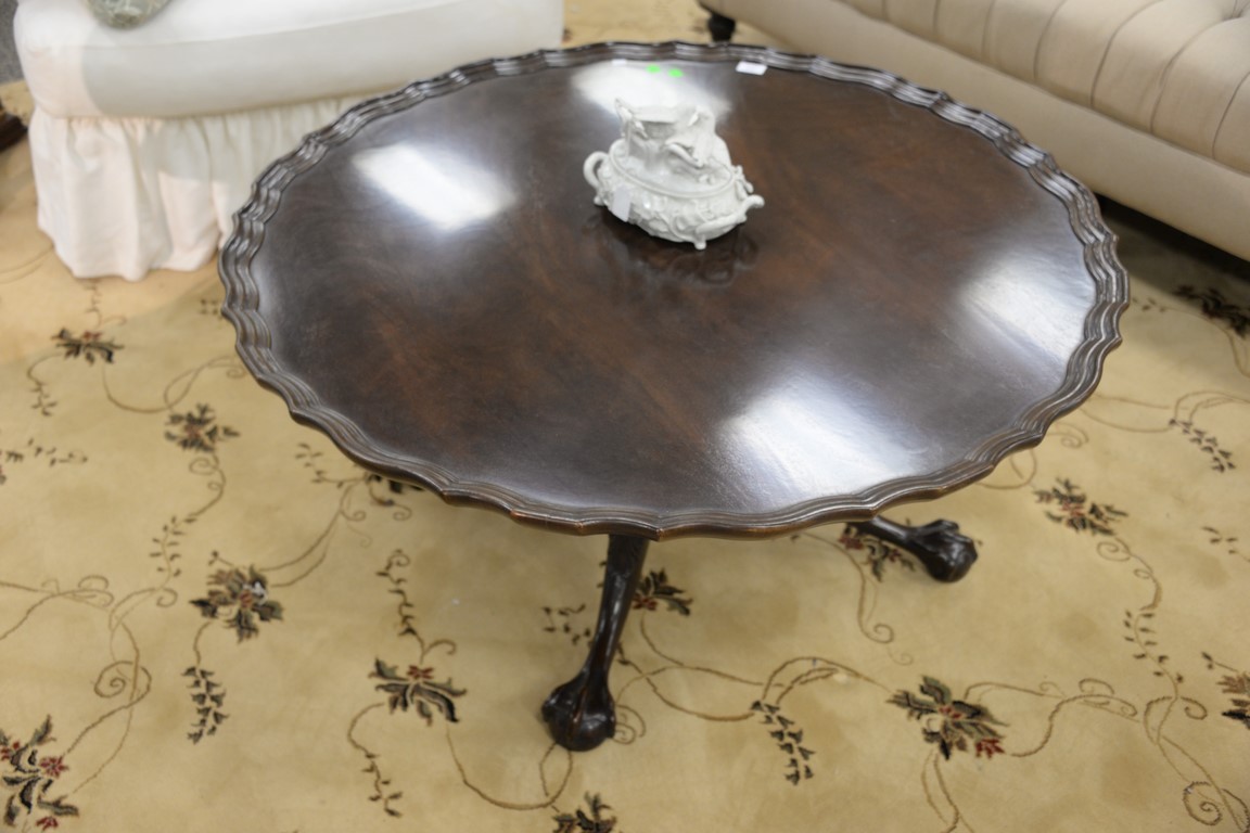 Henredon mahogany piecrust coffee table with ball and claw feet. ht. 19in., dia. 43in.