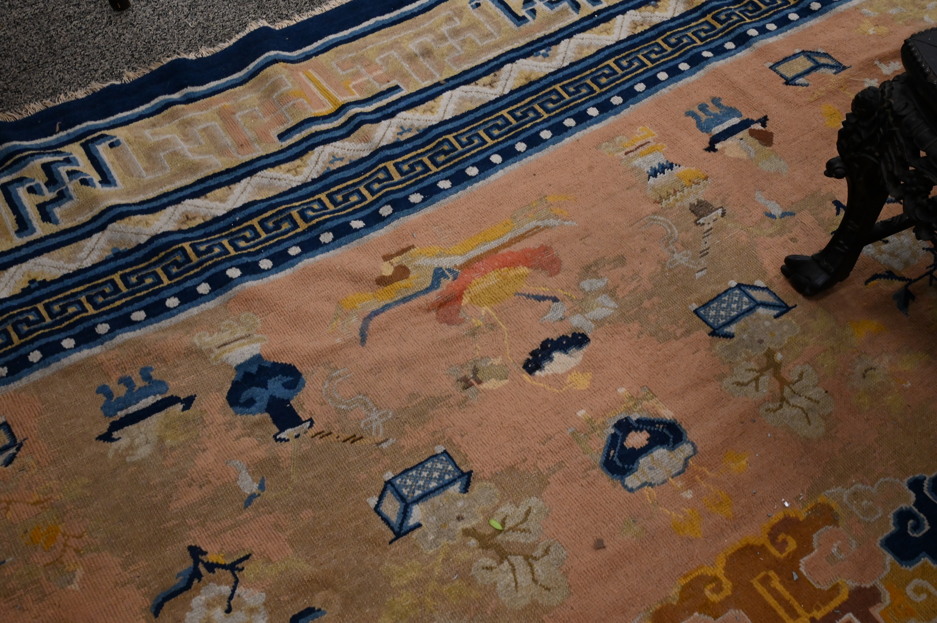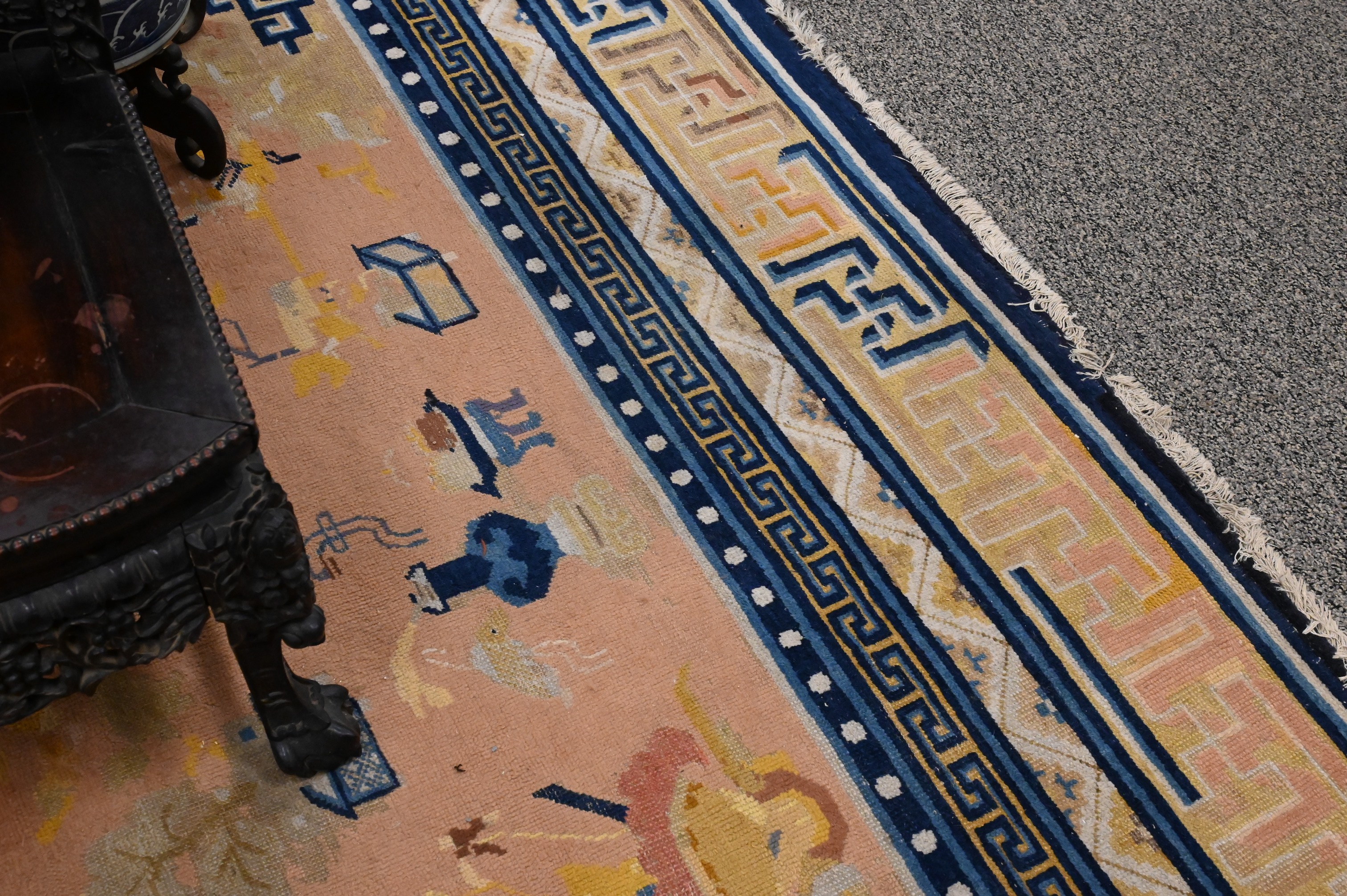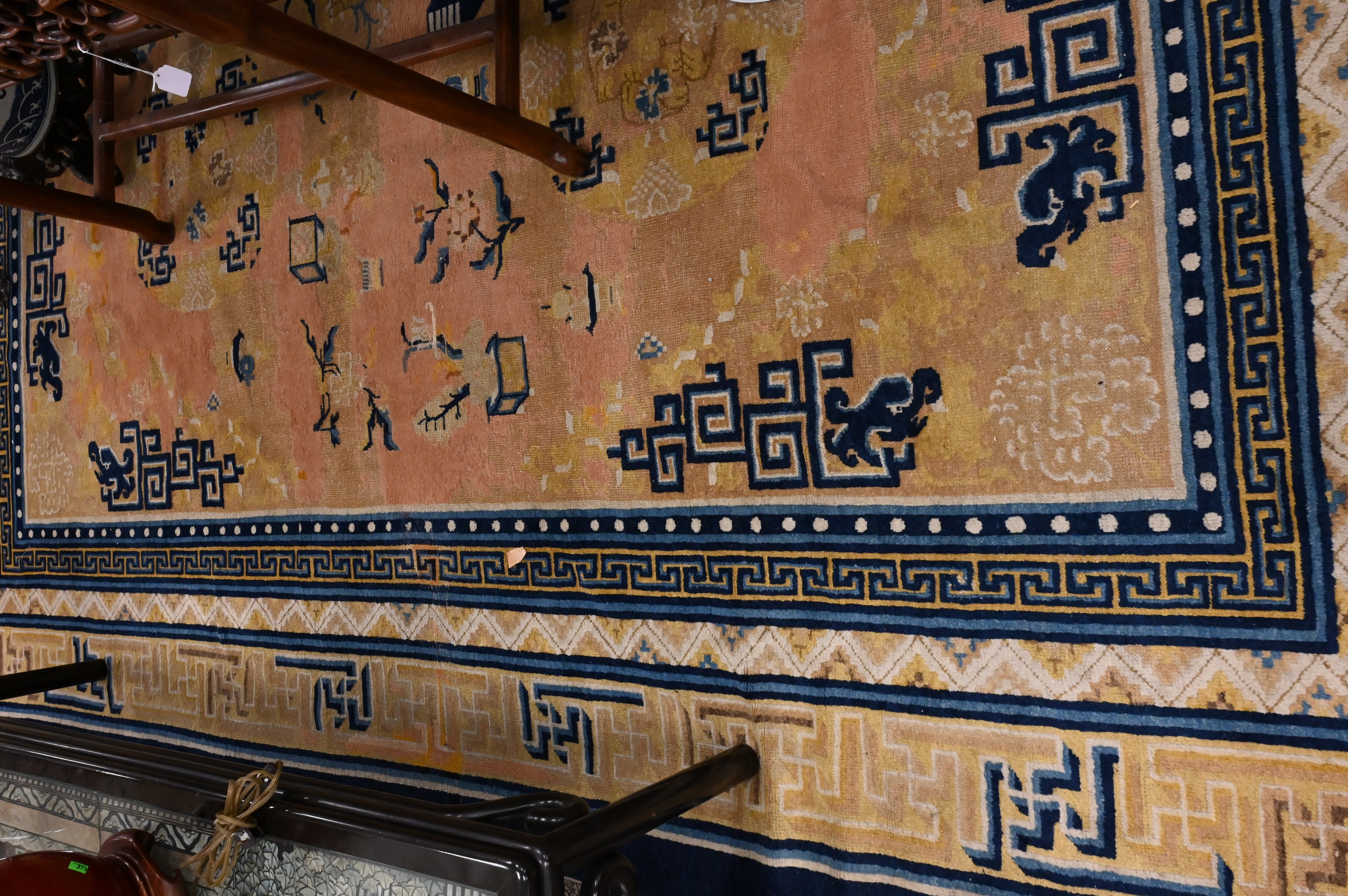 pale terracotta, having blue, taupe, gold, coral, and cream-ground border, with Hundred Antique motifs, Northwest China circa 1900
