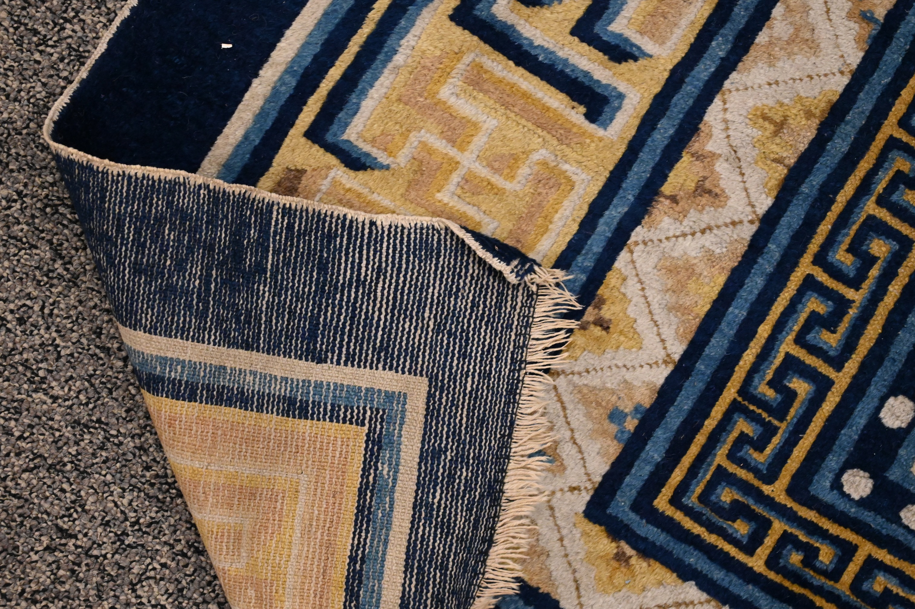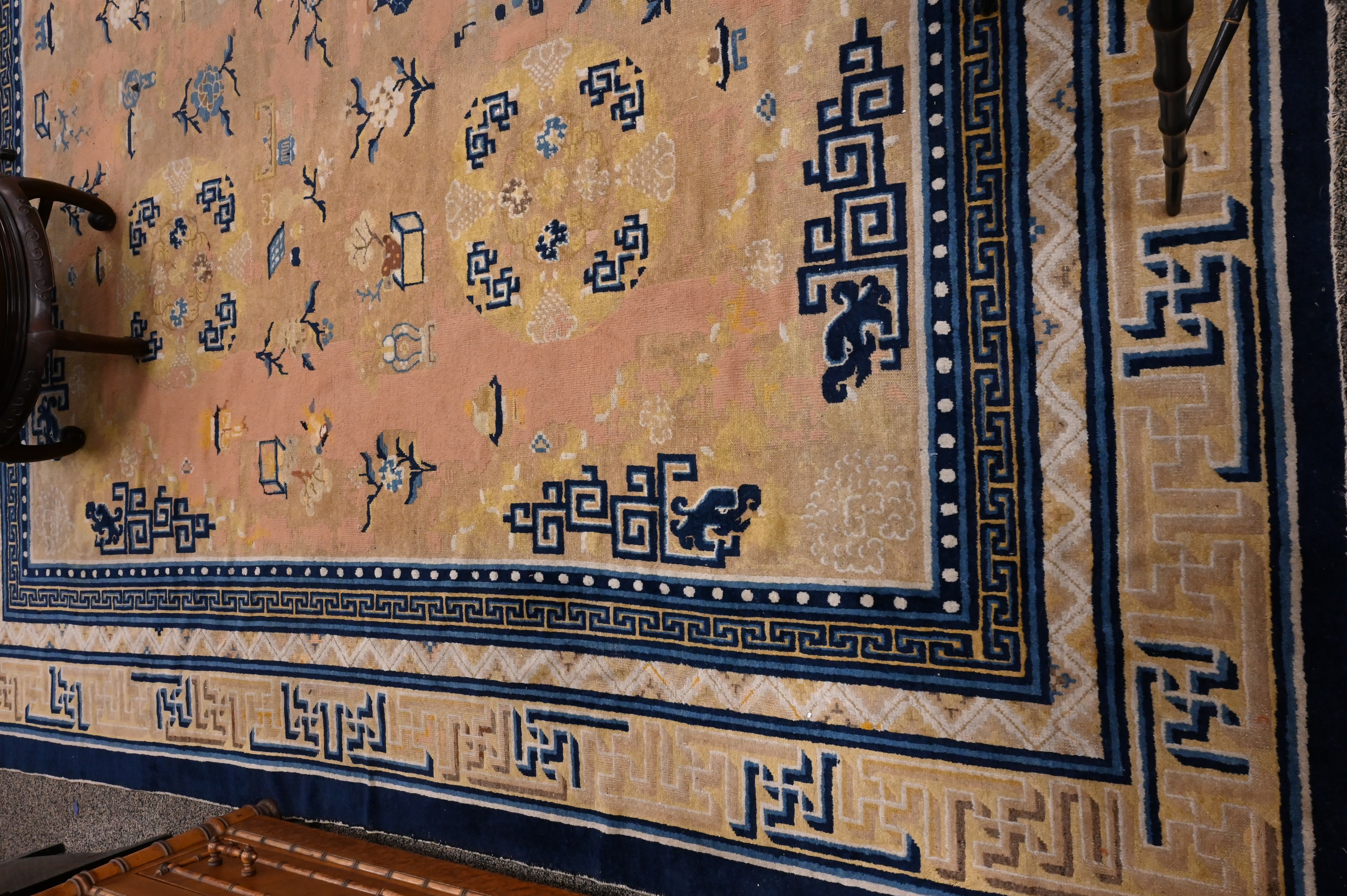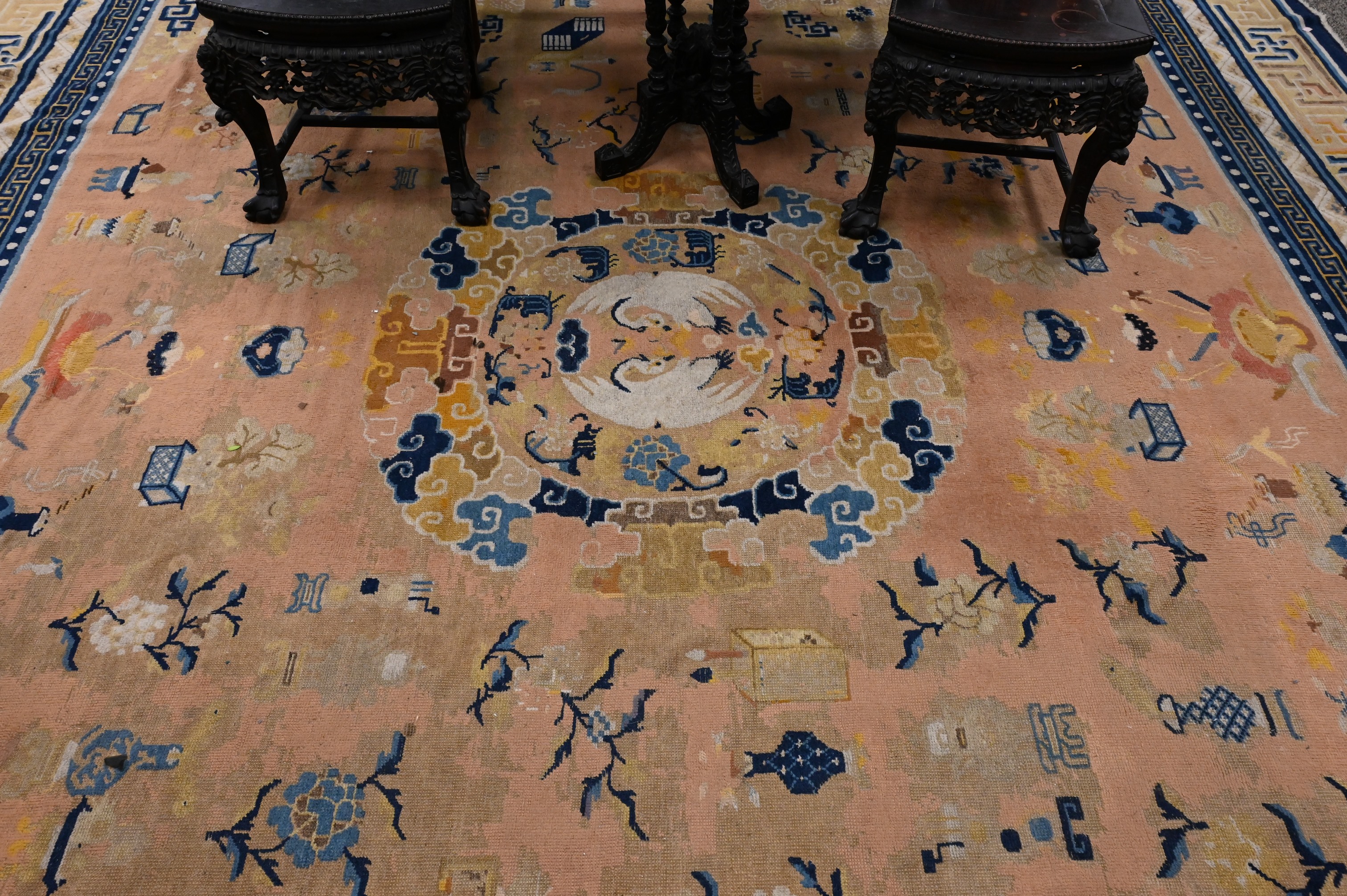pale terracotta, having blue, taupe, gold, coral, and cream-ground border, with Hundred Antique motifs, Northwest China circa 1900