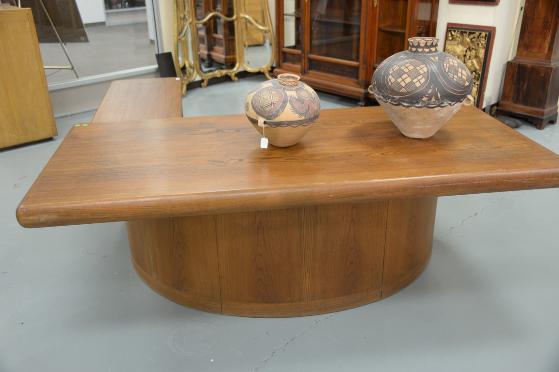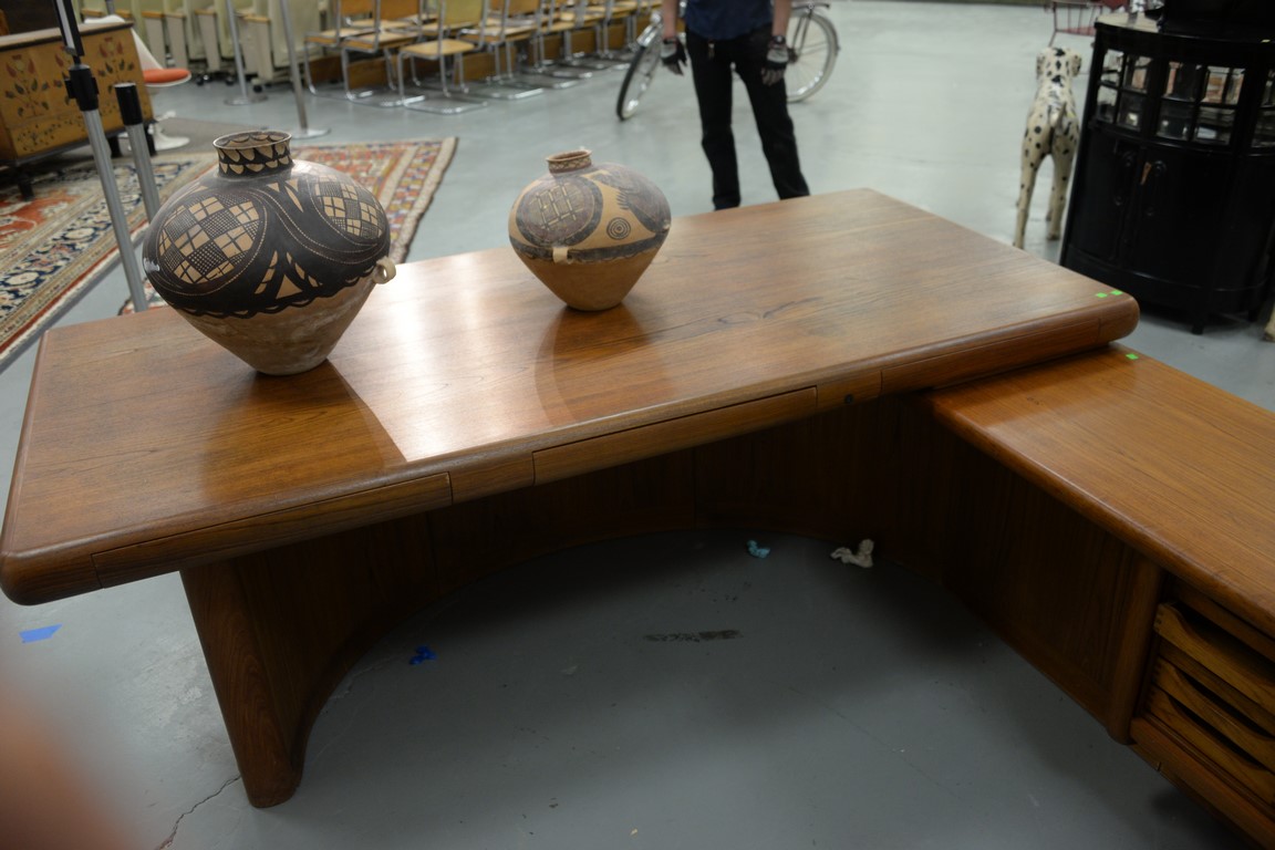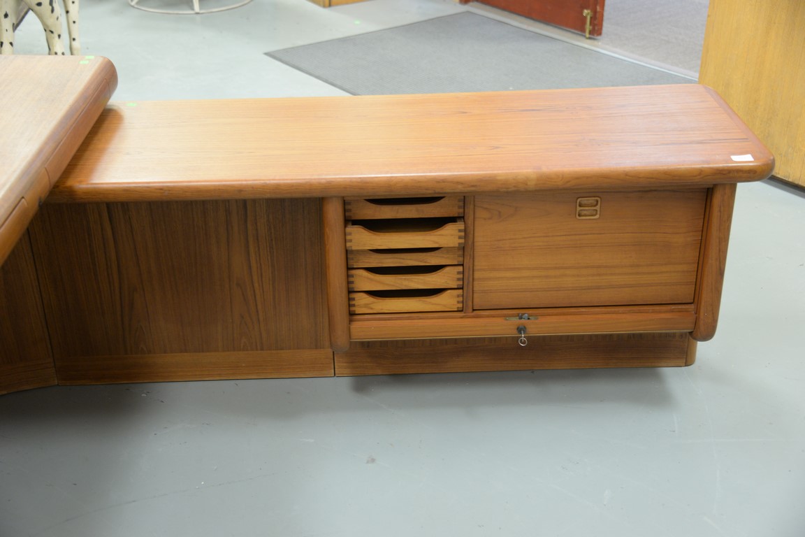 Lot 419: Scandinavian Dyrlund office desk with secretary arm having tambour roll door with drawers. top: 39 x 83 side arm: 20 x 57