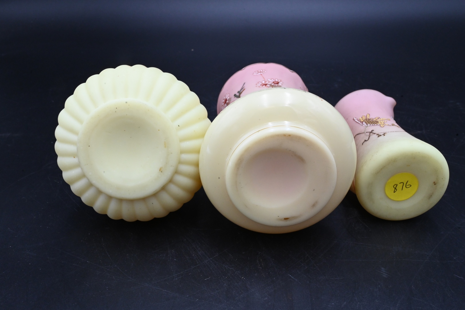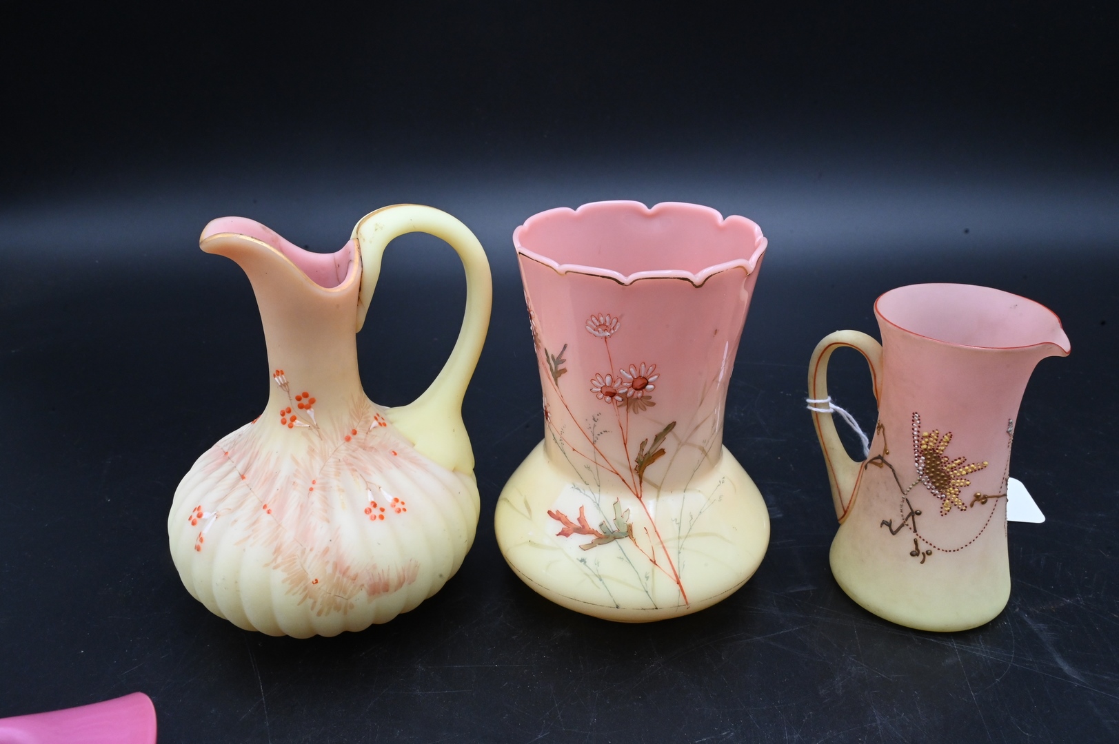 Seven Mt. Washington Burmese and Peach Blown Glass Pieces, one case glass creamer, painted, decorated, etc., tallest 4 1/2 inches. Provenance: From the Estate of Elwyn W. Lemon, Enfield, Connecticut.