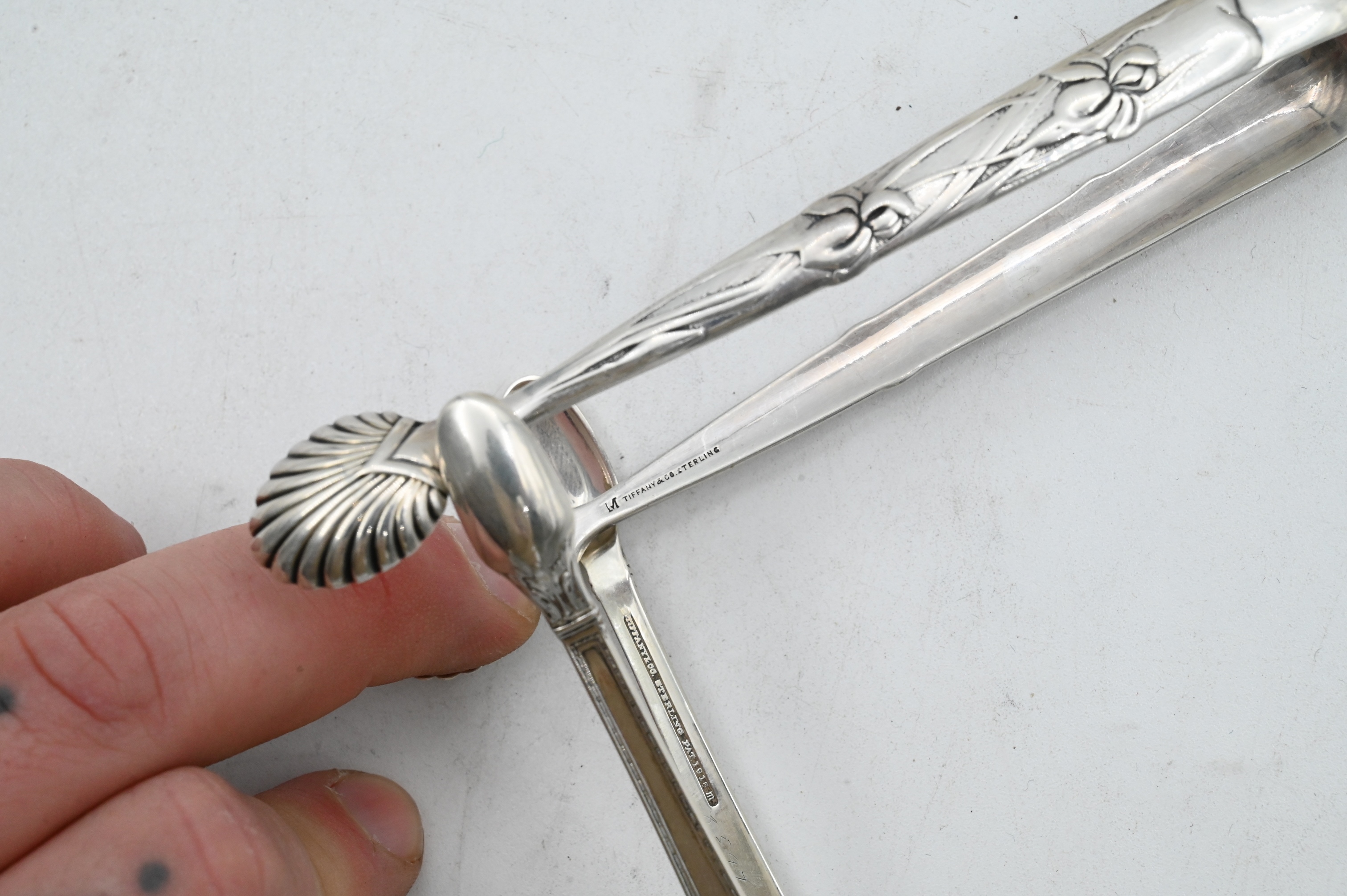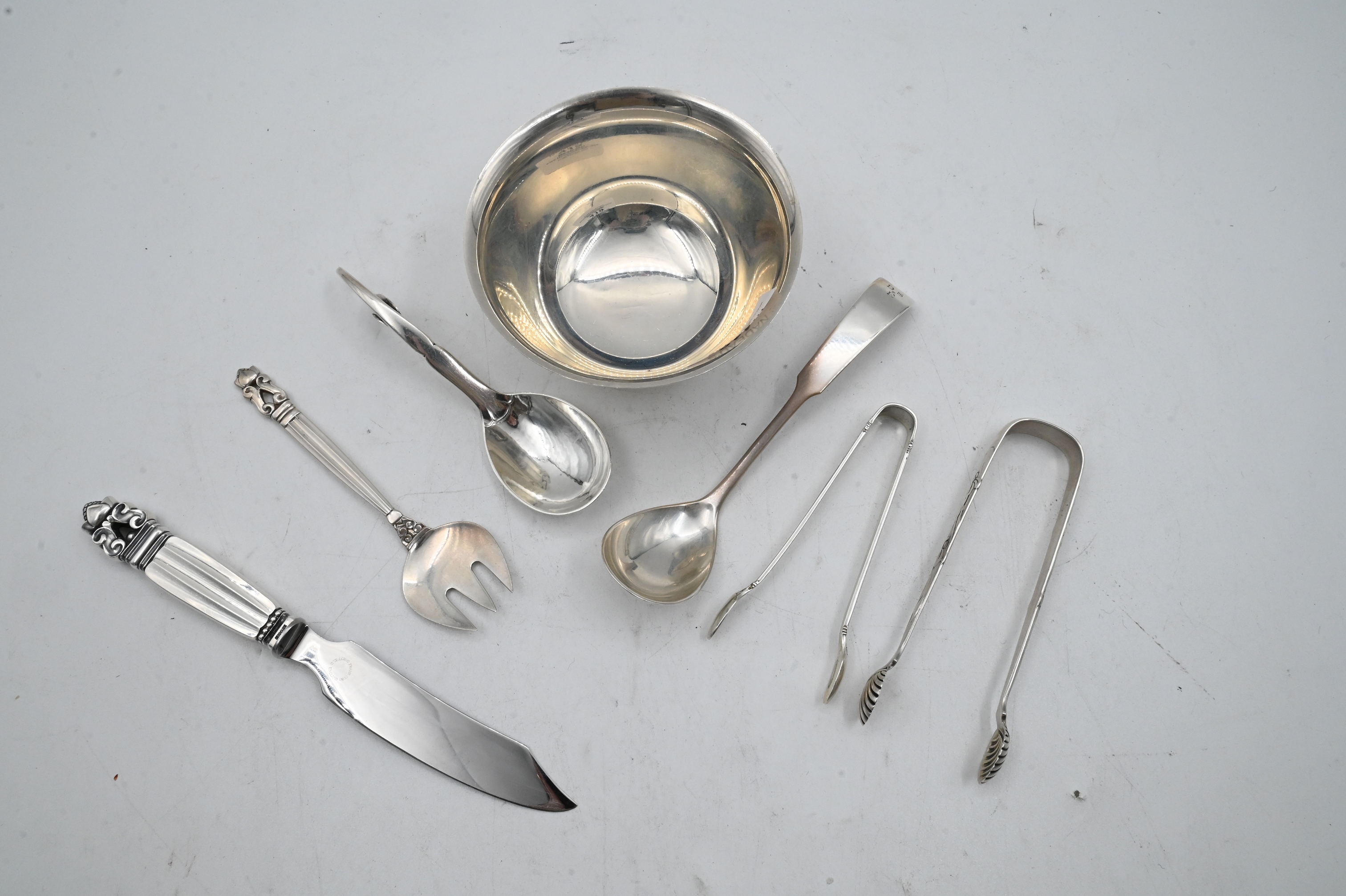 to include Tiffany bowl and two Tiffany sugar tongs, along with four Georg Jensen sterling pieces one of which is weighted