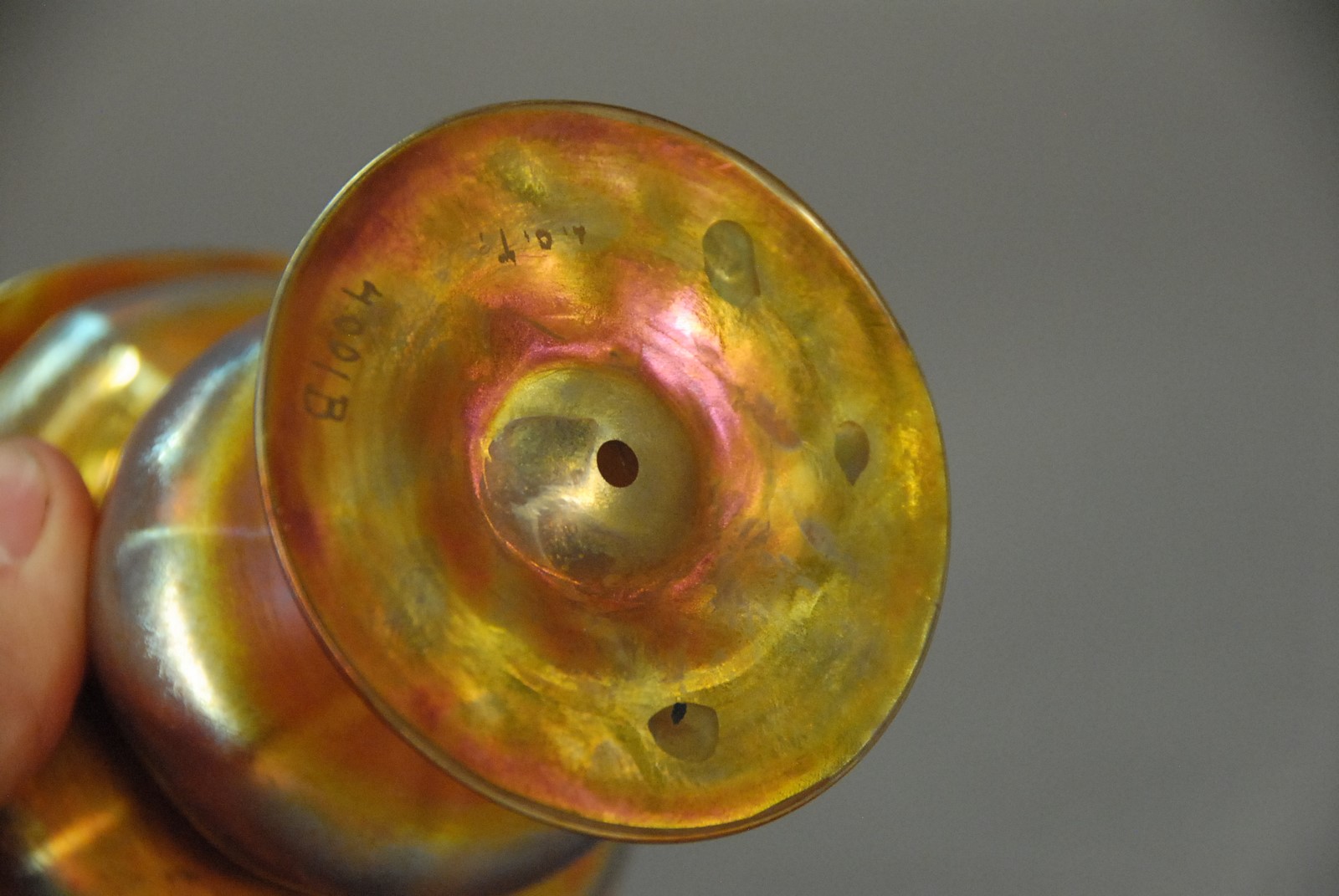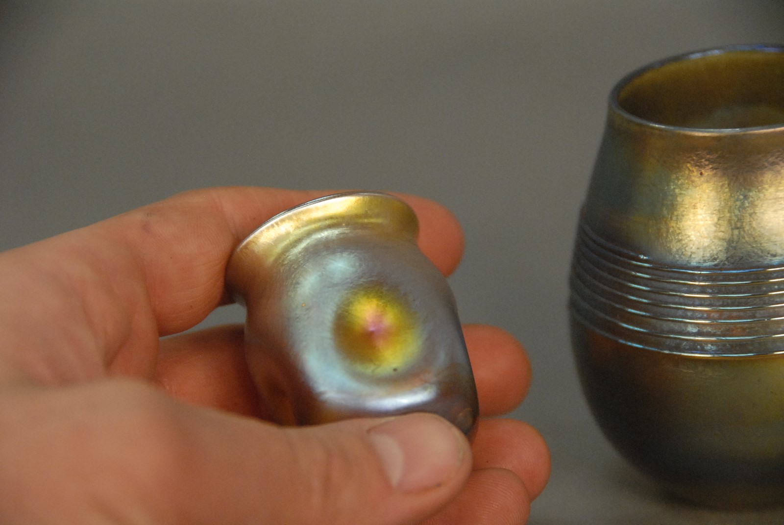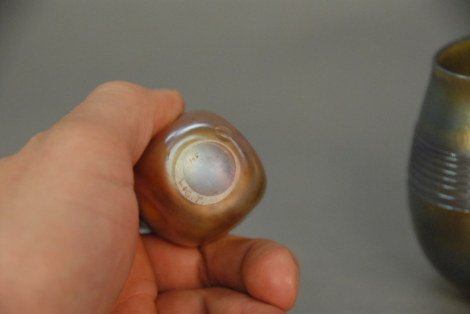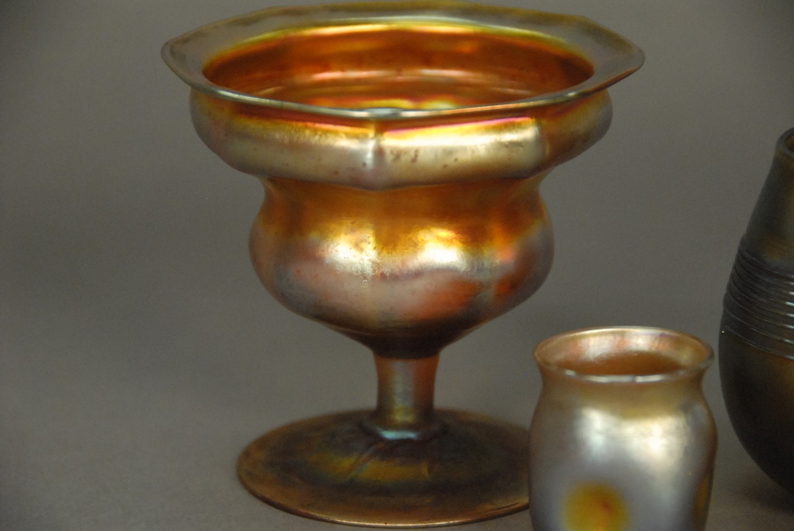 Lot 419: Three piece lot Tiffany gold Favrile to include one glass compote inscribed L.C.T. 4001B, a toothpick holder inscribed L.C.T., and a barrel form vase with applied thread design numbered 05259, not signed. compote: ht. 3 3/4 in. toothp