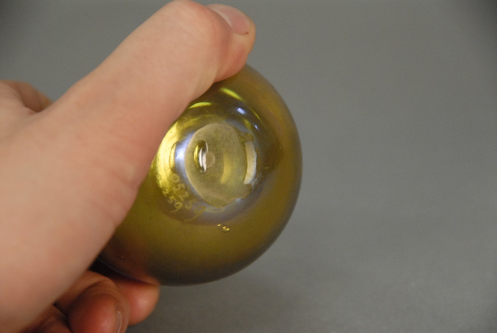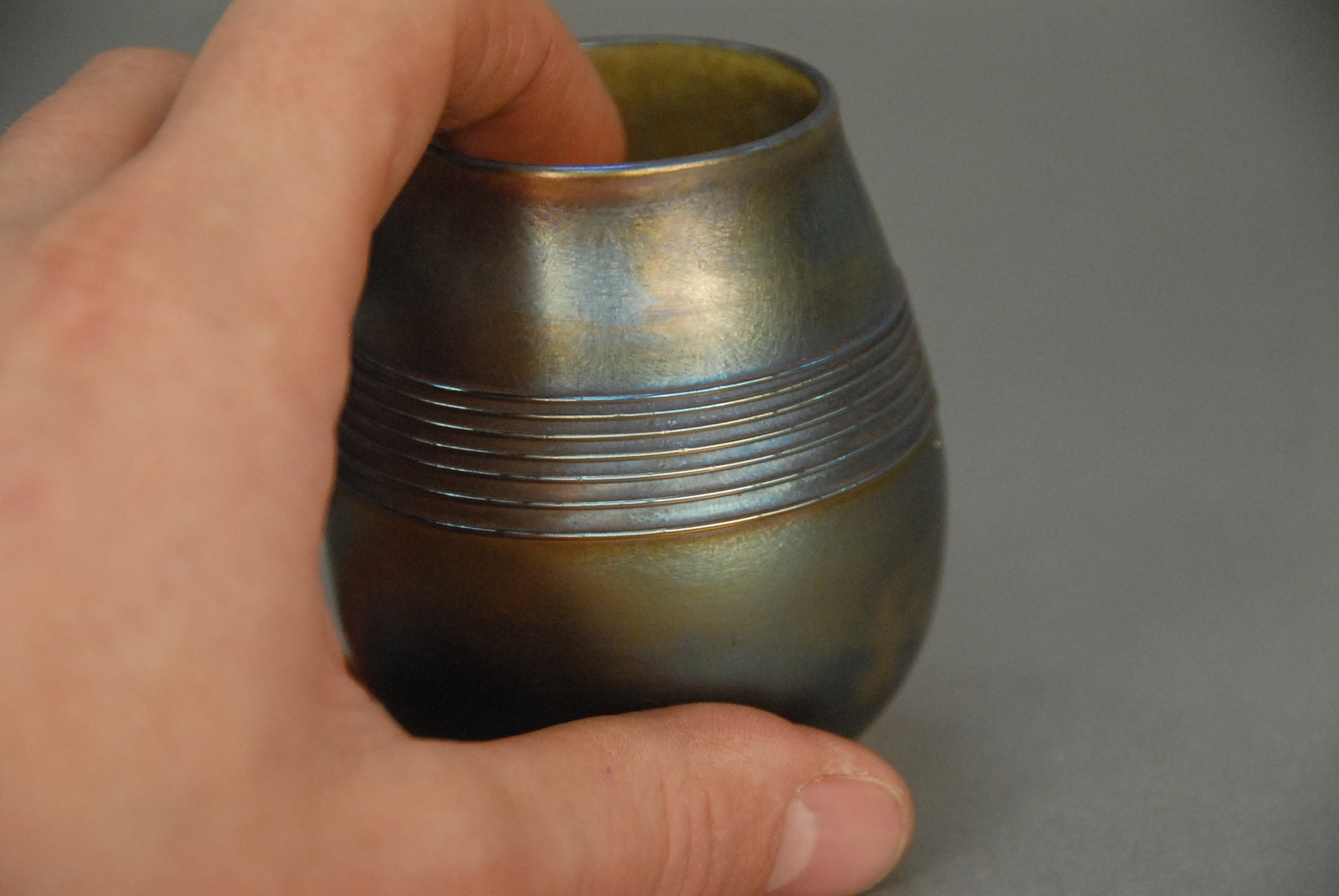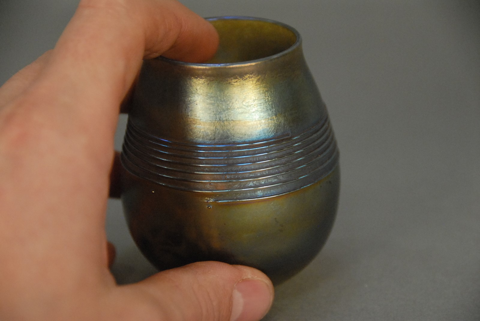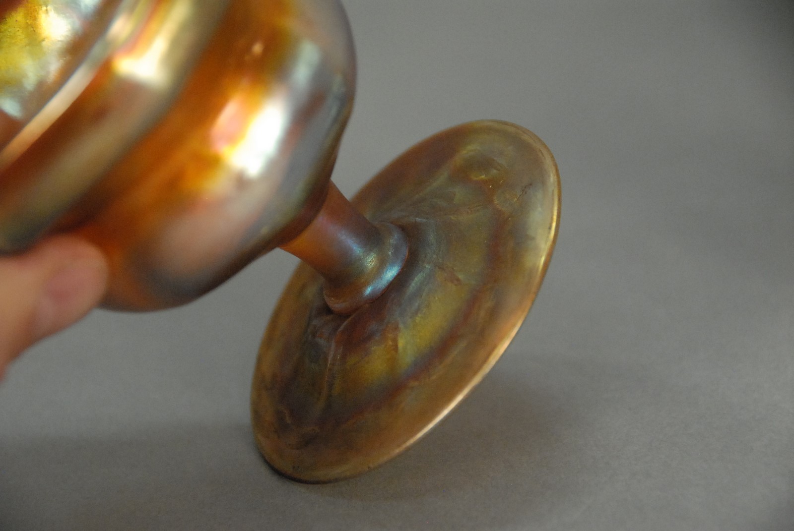 Lot 419: Three piece lot Tiffany gold Favrile to include one glass compote inscribed L.C.T. 4001B, a toothpick holder inscribed L.C.T., and a barrel form vase with applied thread design numbered 05259, not signed. compote: ht. 3 3/4 in. toothp