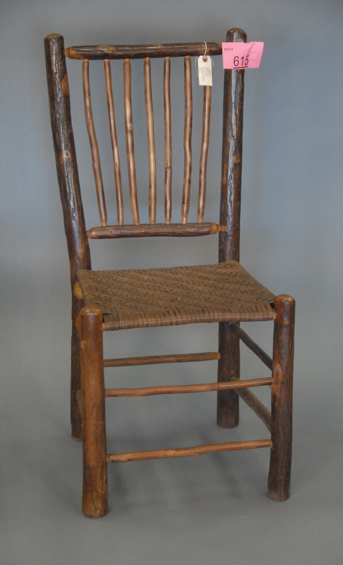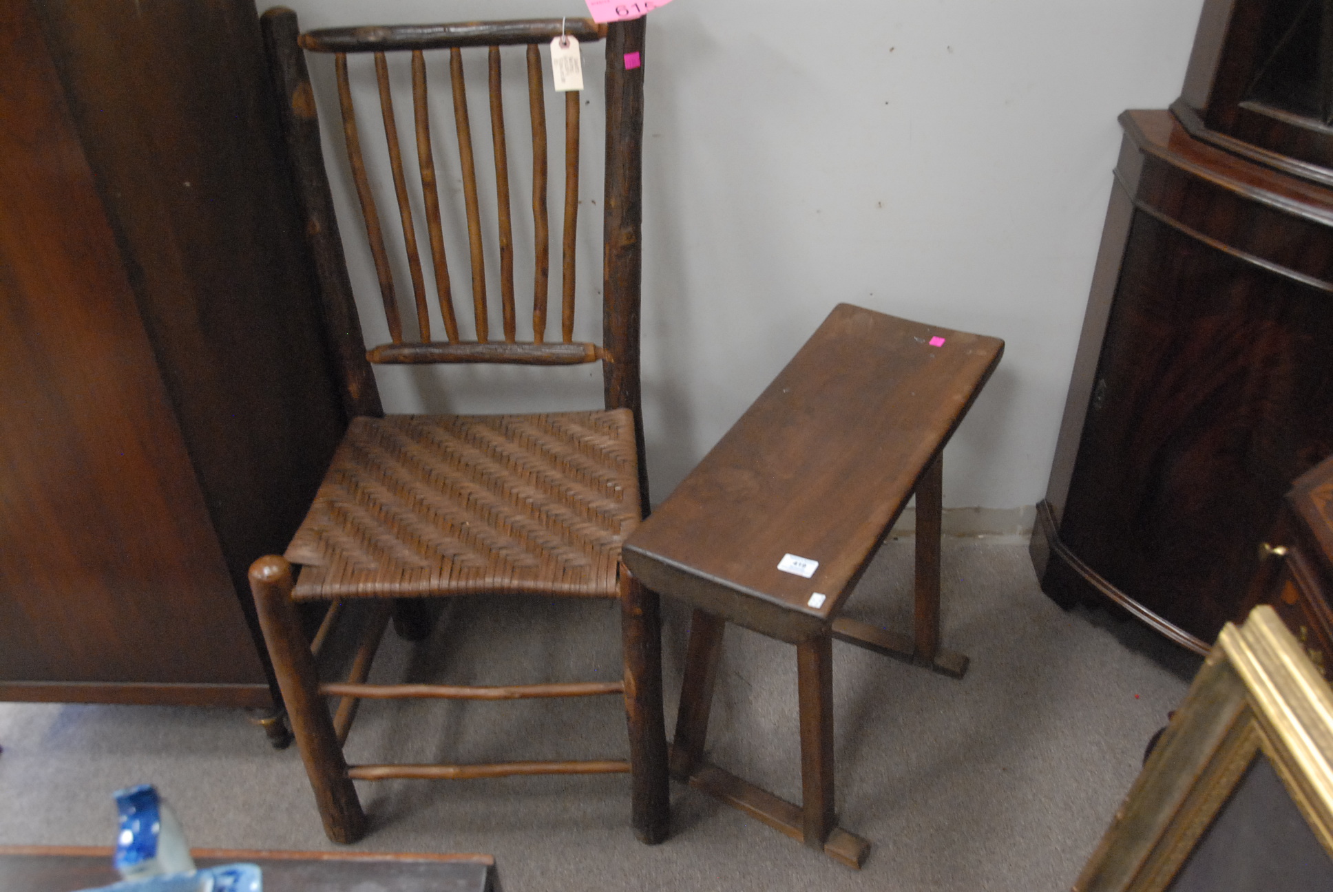 Lot 419: Two piece lot to include slab wood stool ht. 21 in. top: 10 x 24 and a rustic hickory side chair.