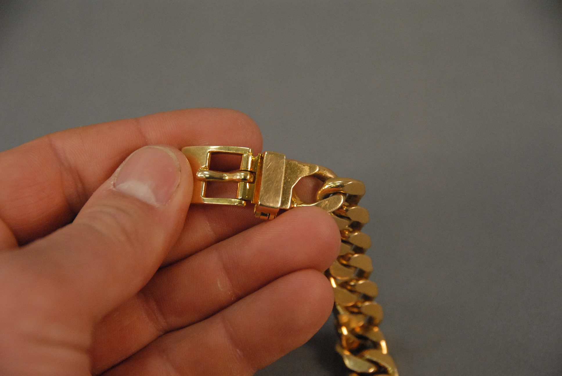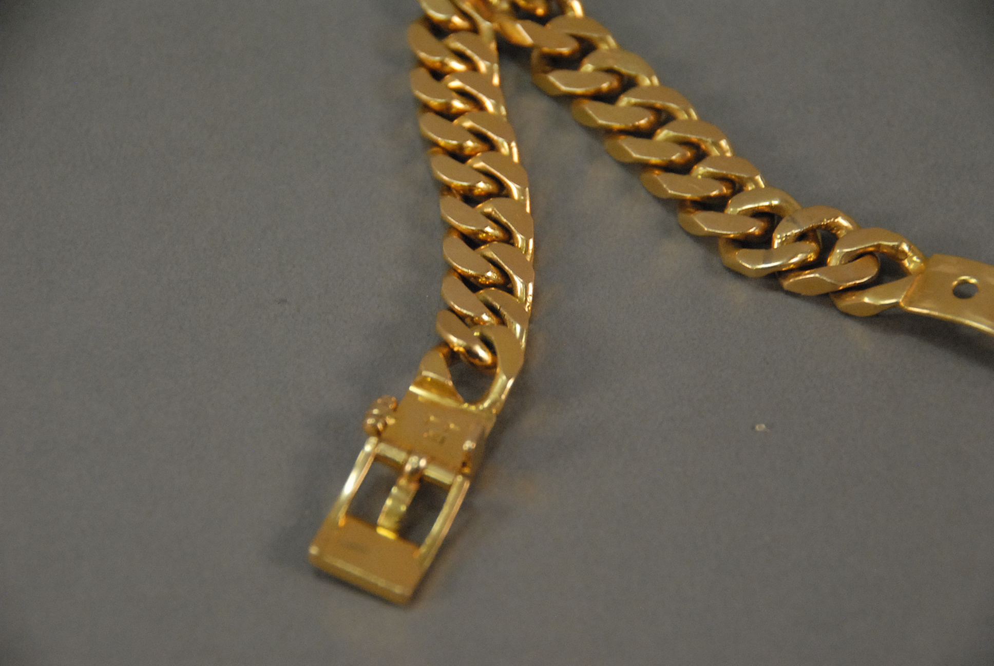 18K gold bracelet with belt buckle type clasp. 103.5 grams