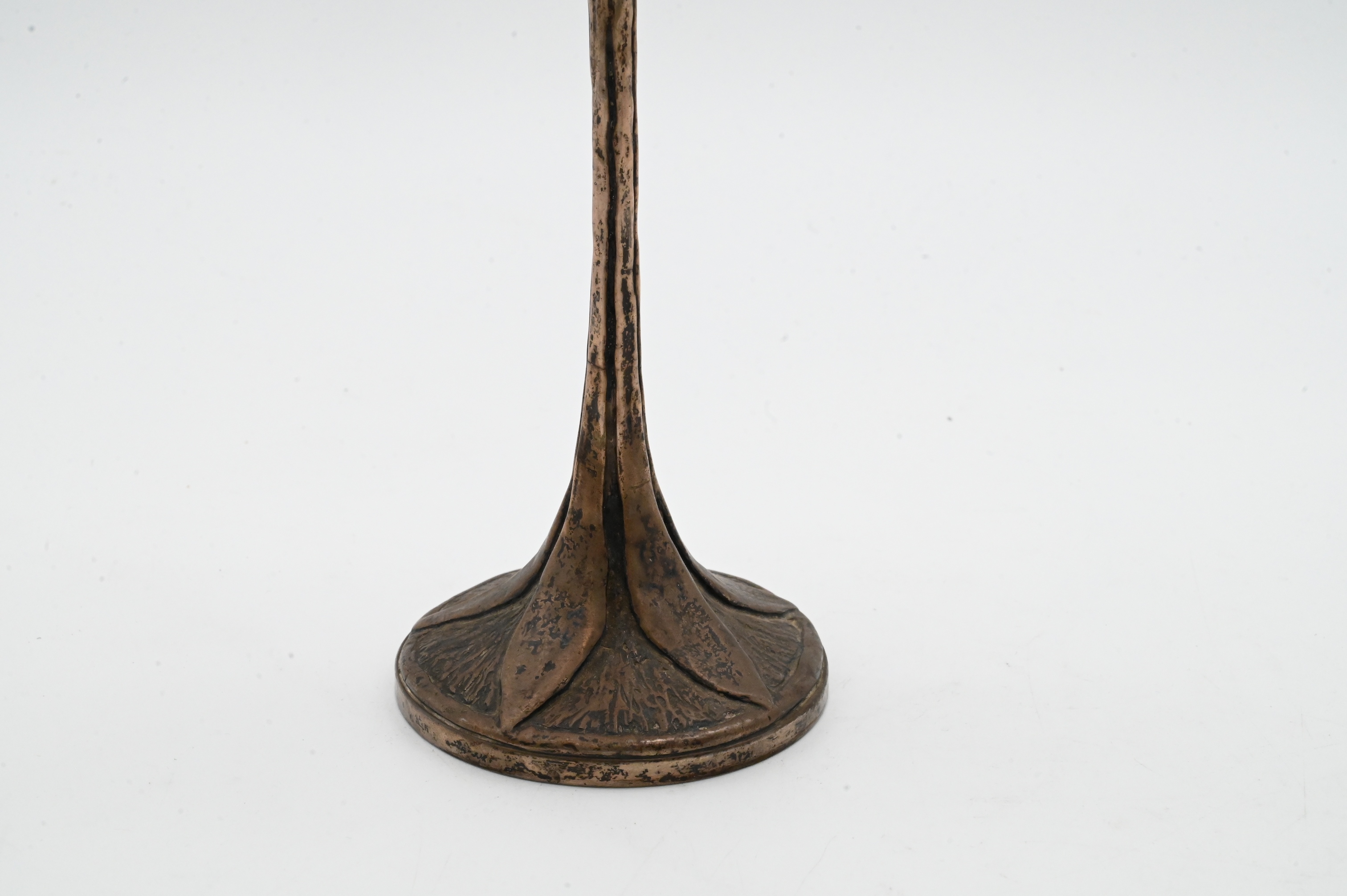 tall elongated stem with lily flower and leaf motif surmounted by hand hammered copper cup