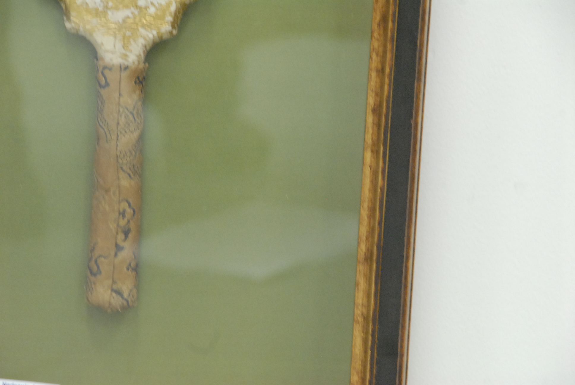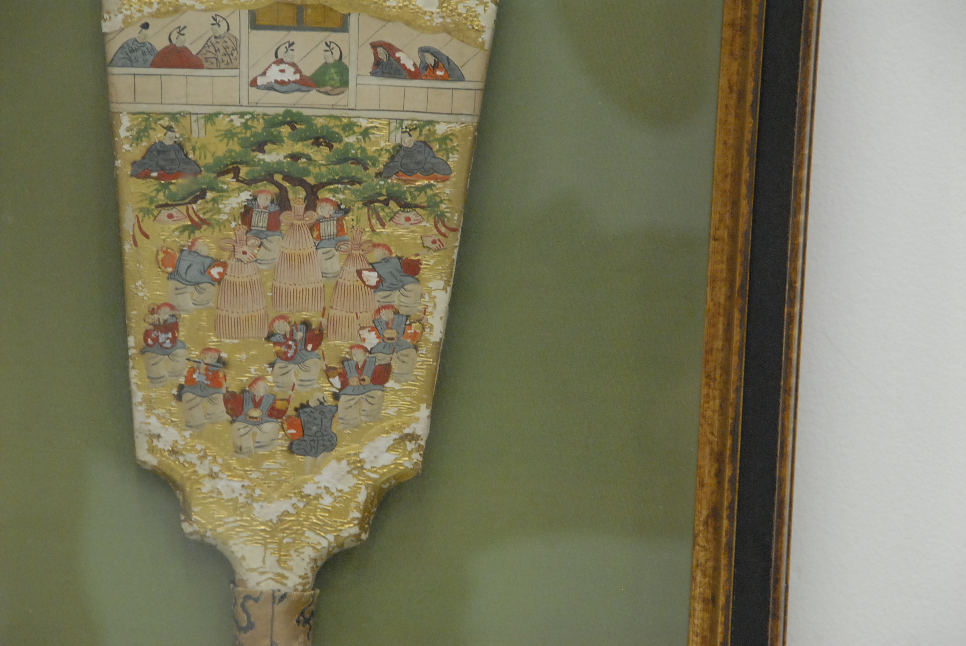 Battledore painted with scene of courtyard attributed to Tesa Mitsunari framed in a shadow box frame. Provenance: Edwin Dun b. July 19, 1848 & d. May 15, 1931 was a rancher from Ohio who was employed as an o-yatoi gaikokujin in Hokkaid